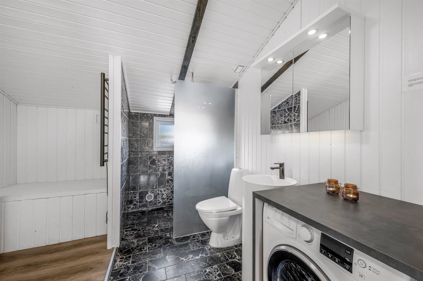 Boligen har ét badeværelse med 1 bruser og 1 toilet. Der er gulvvarme og håndklæderadiator på badeværelset. På badeværelset finder man også en vaskemaskine/tørretumbler, hvis behovet for at vaske tøj skulle opstå.
