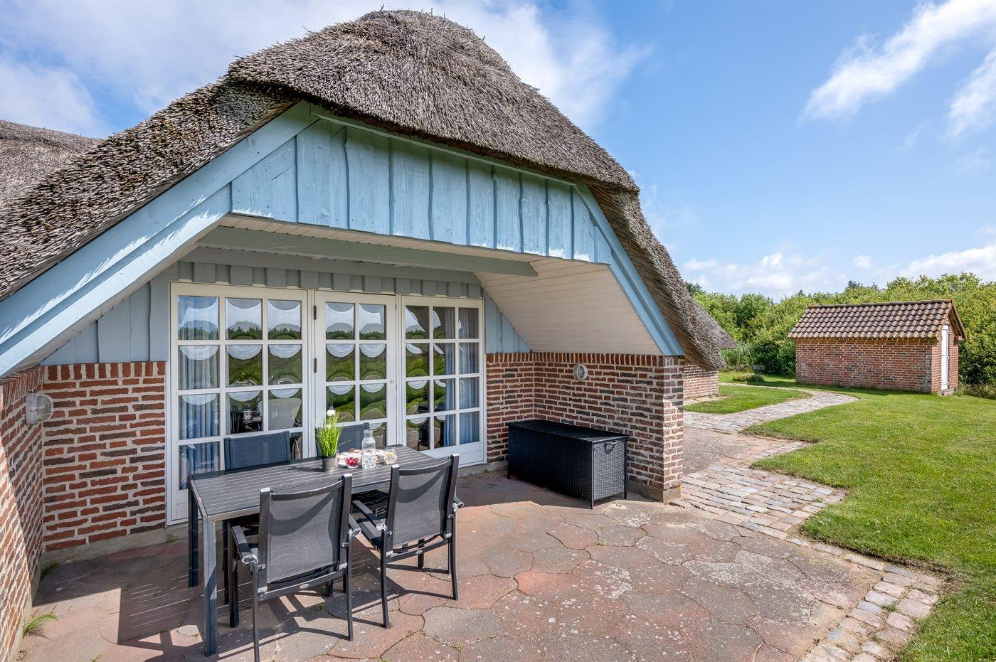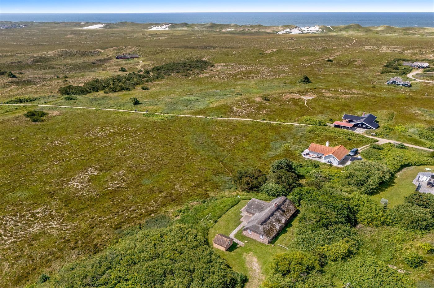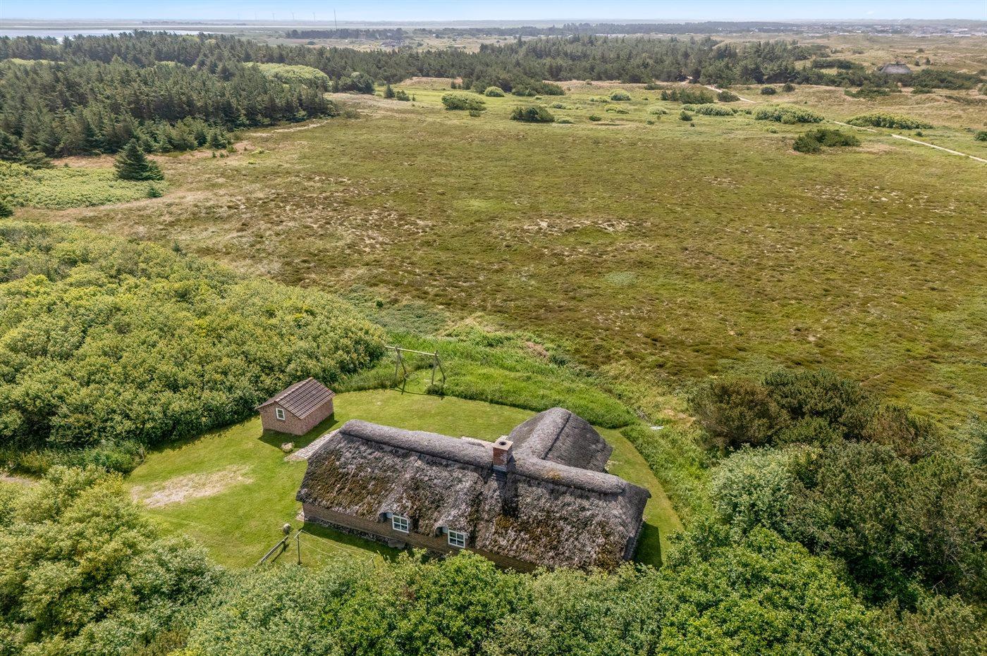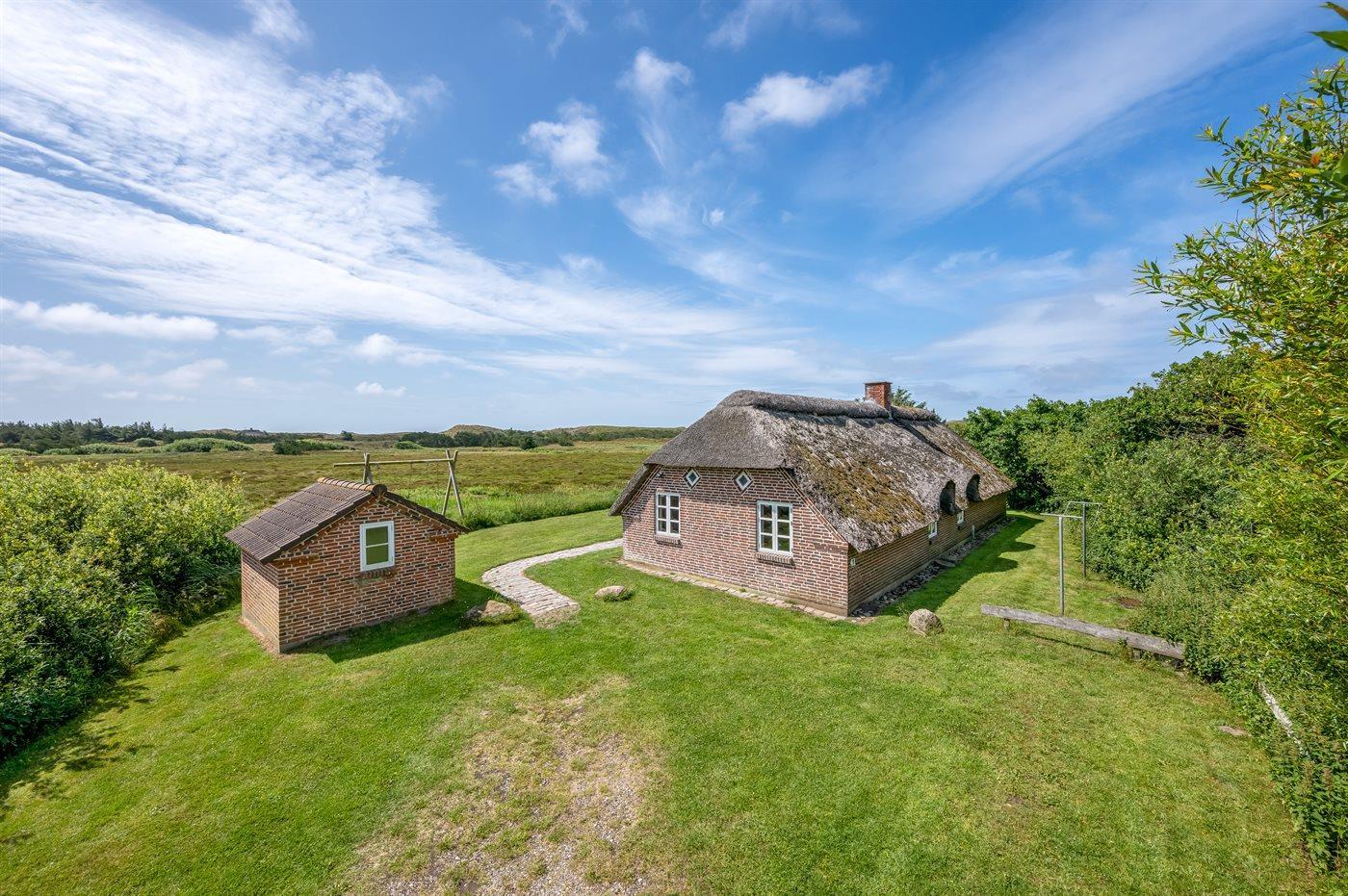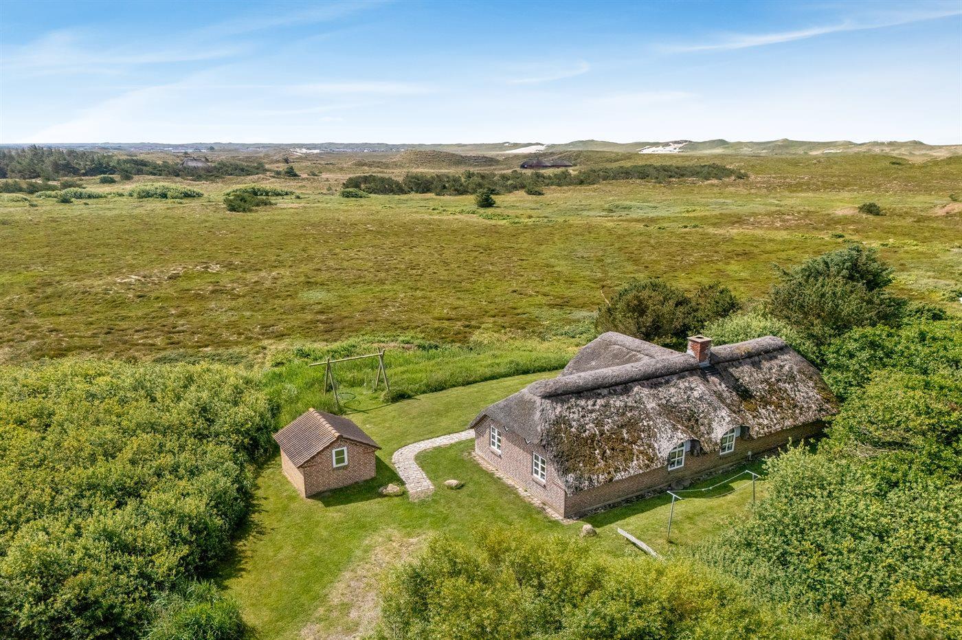 Hyggeligt sommerhus med stråtag og ugenert udsigt over klitlandskab i fredelige omgivelser.