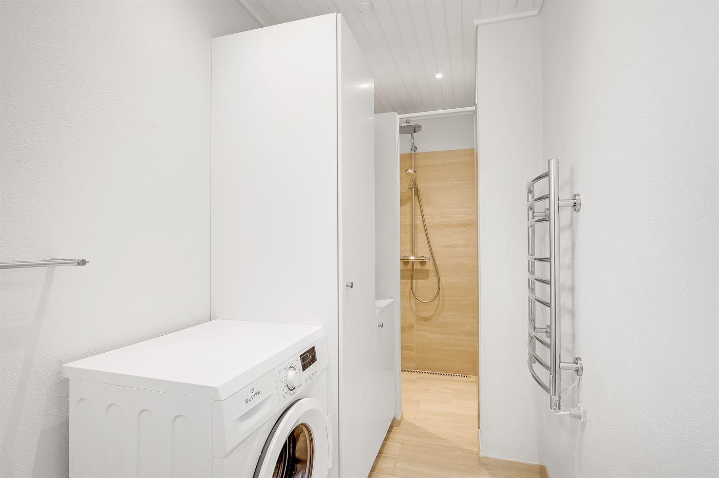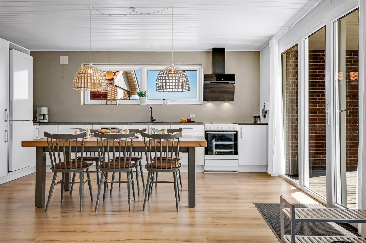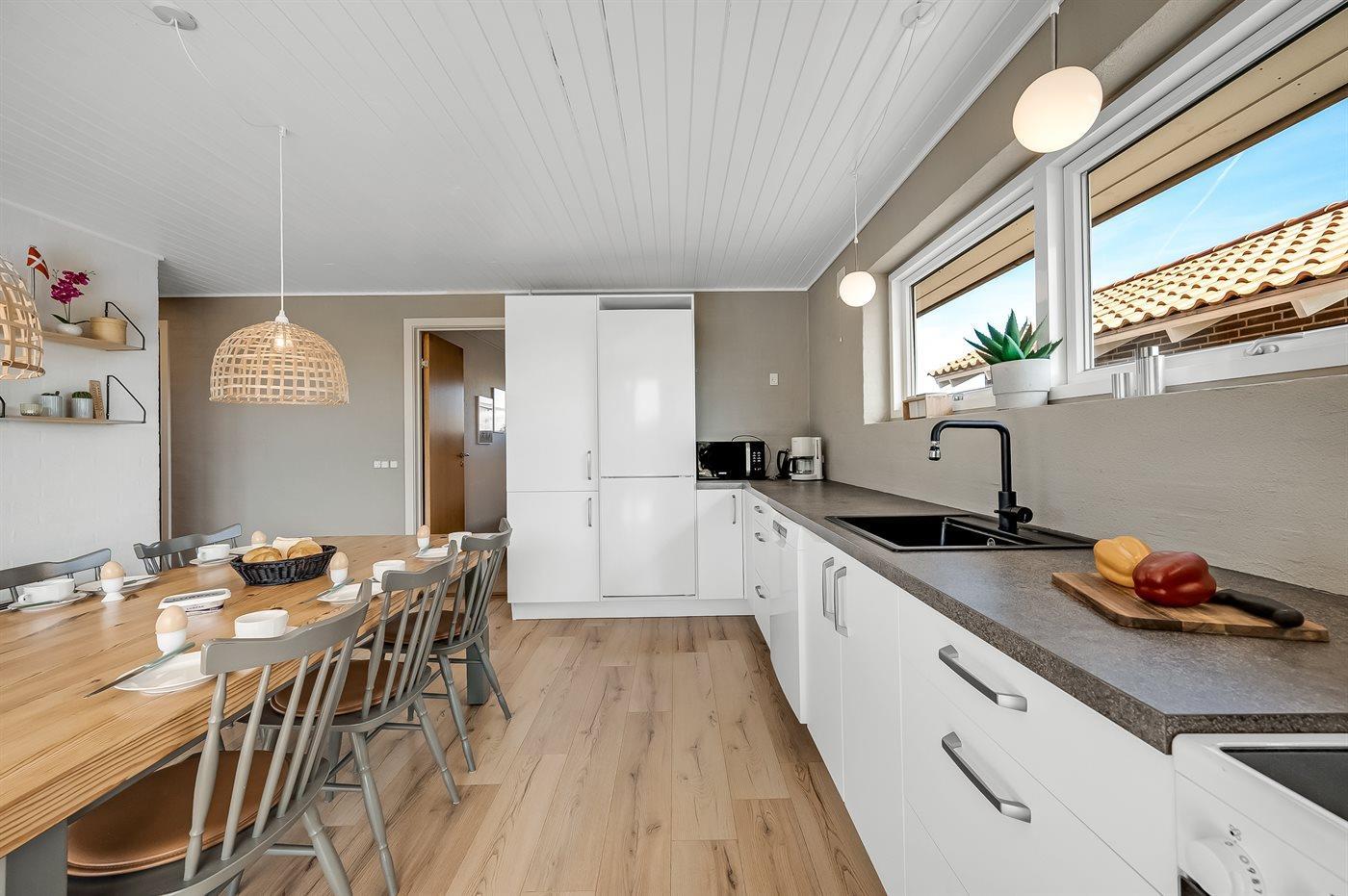 Køkkenet er udstyret med 1 køleskab. Der er 4 elkogeplader, bageovn, mikrobølgeovn samt opvaskemaskine.