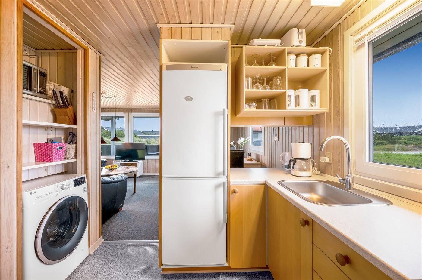 Køkkenet er udstyret med 1 køleskab. Der er 4 keramiske kogeplader, varmluftovn, mikrobølgeovn, Airfryer samt opvaskemaskine.