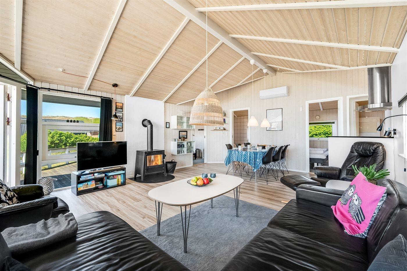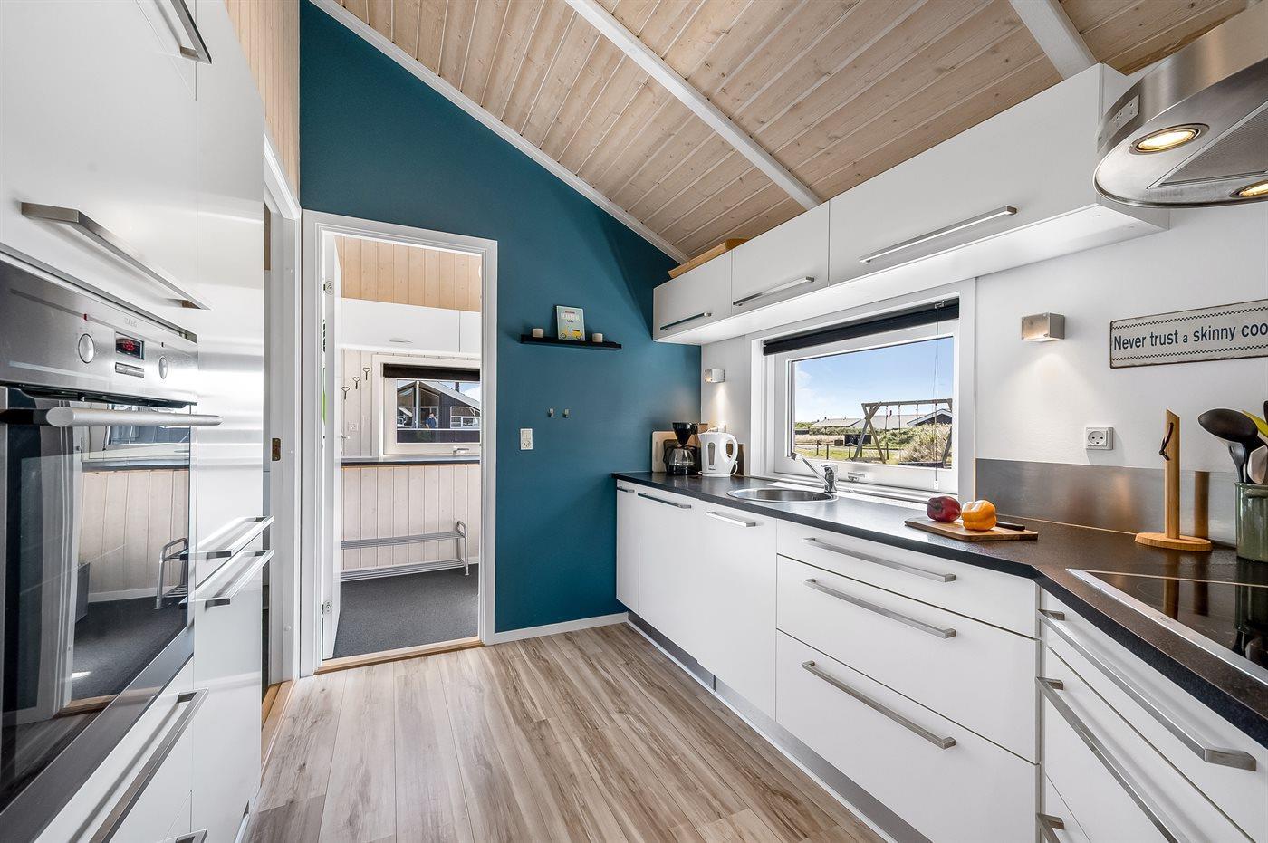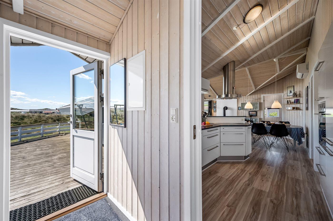 Virkelig lækkert sommerhus i træ med spa og sauna. Huset er bygget i 2003 og beliggende på en naturgrund kun 200 m fra Vesterhavet. Til huset hører stort terrasseareal, både åbent og overdækket, med havemøbler. Lyse trælofter og -vægge. Trægulv med løse tæpper, gulvtæppe i værelser, klinkegulv i gang. Lækkert badeværelse med spa, bruseniche og gulvvarme. Fra badeværelset direkte adgang til husets sauna. Gæstetoilette. Det moderne veludstyrede køkken indeholder bl.a. varmluftovn, mikrobølgeovn, opvaskemaskine og fryser. Hyggelig og smagfuldt indrettet opholdsstue med brændeovn, TV med parabol (digital), DVD-afspiller og stereoanlæg med CD-afspiller. Husets sovepladser fordeler sig på 3 værelser, alle med dobbeltseng. Huset er yderligere udstyret med gratis ADSL-internetforbindelse (computer medbringes), samt vaskemaskine og tørretumbler. Sandkasse og gynge på grunden. Et flot, lyst, venligt og anbefalelsesværdigt sommerhus med udsigt til klitterne.