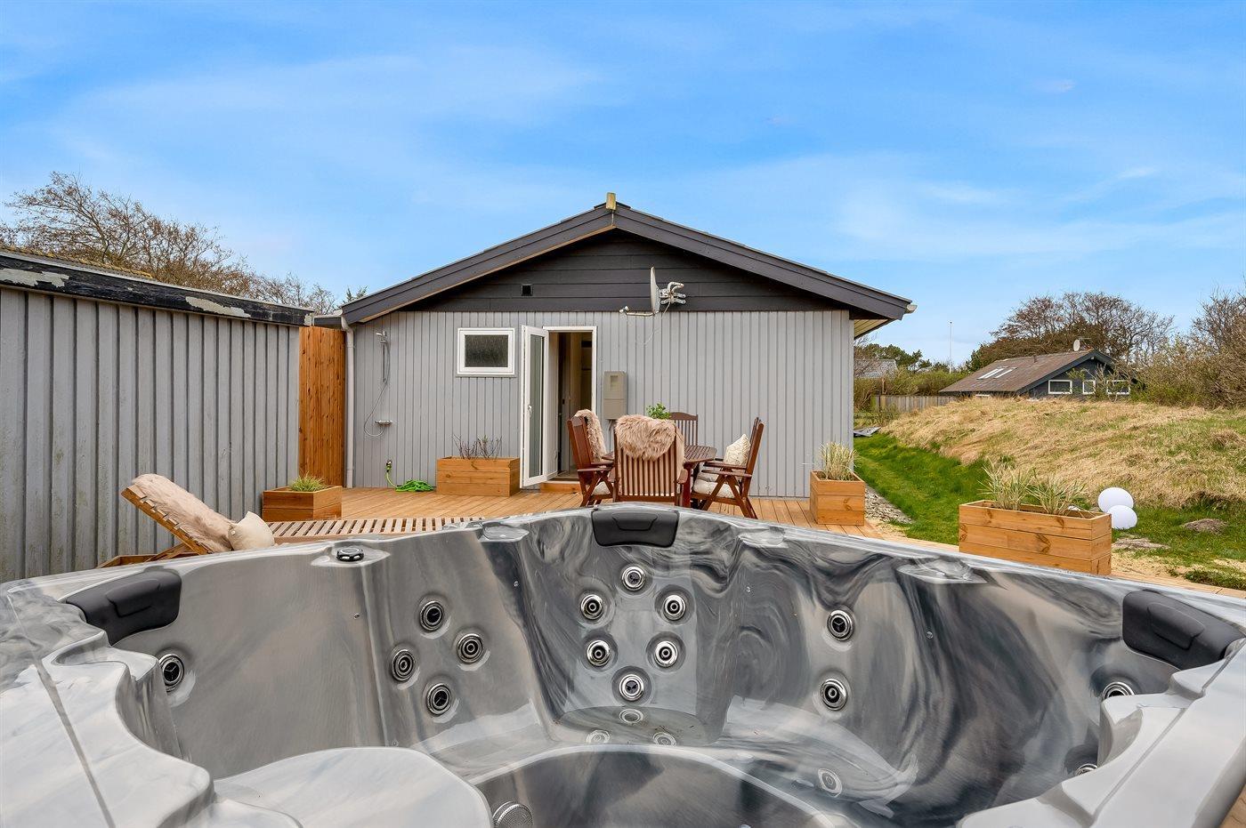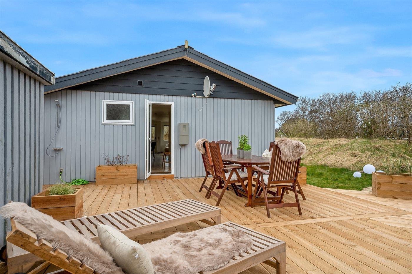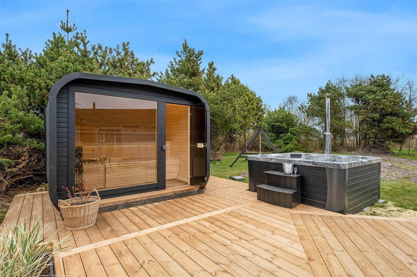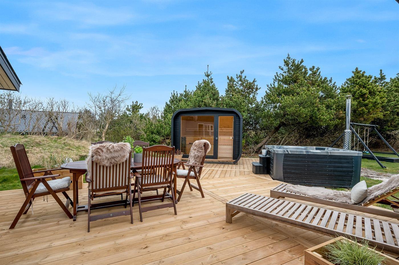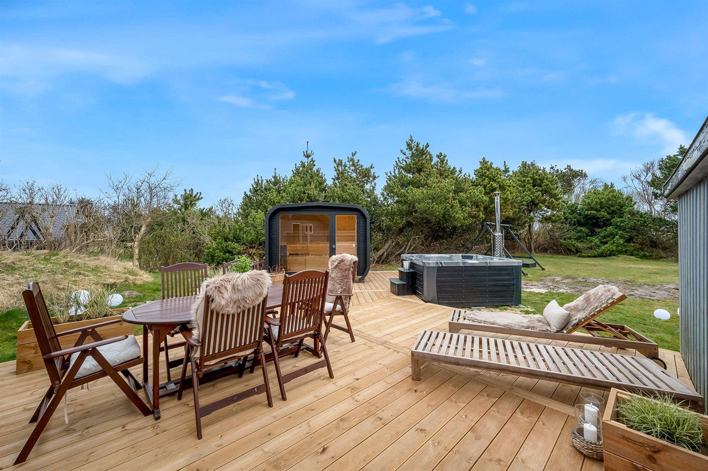 Vil I for alvor skrue op for luksus og selvforkælelse, kan I nyde sommerhusets lækre terrassemiljø og tænde for den udendørs sauna og fyre op i vildmarksbadet. Dækket af det varme vand kan I slappe fuldstændig af, og om aftenen er der frit udsyn til den smukke, klare stjernehimmel. På terrassen finder I også en udendørs bruser, hvor I kan skylle saltvandet af kroppen og sandet af fødderne, når I har taget en dukkert i Vesterhavet. I kan også vælge at tage jeres morgenbad under åben himmel. Udendørsbruseren kan benyttes fra april til november.