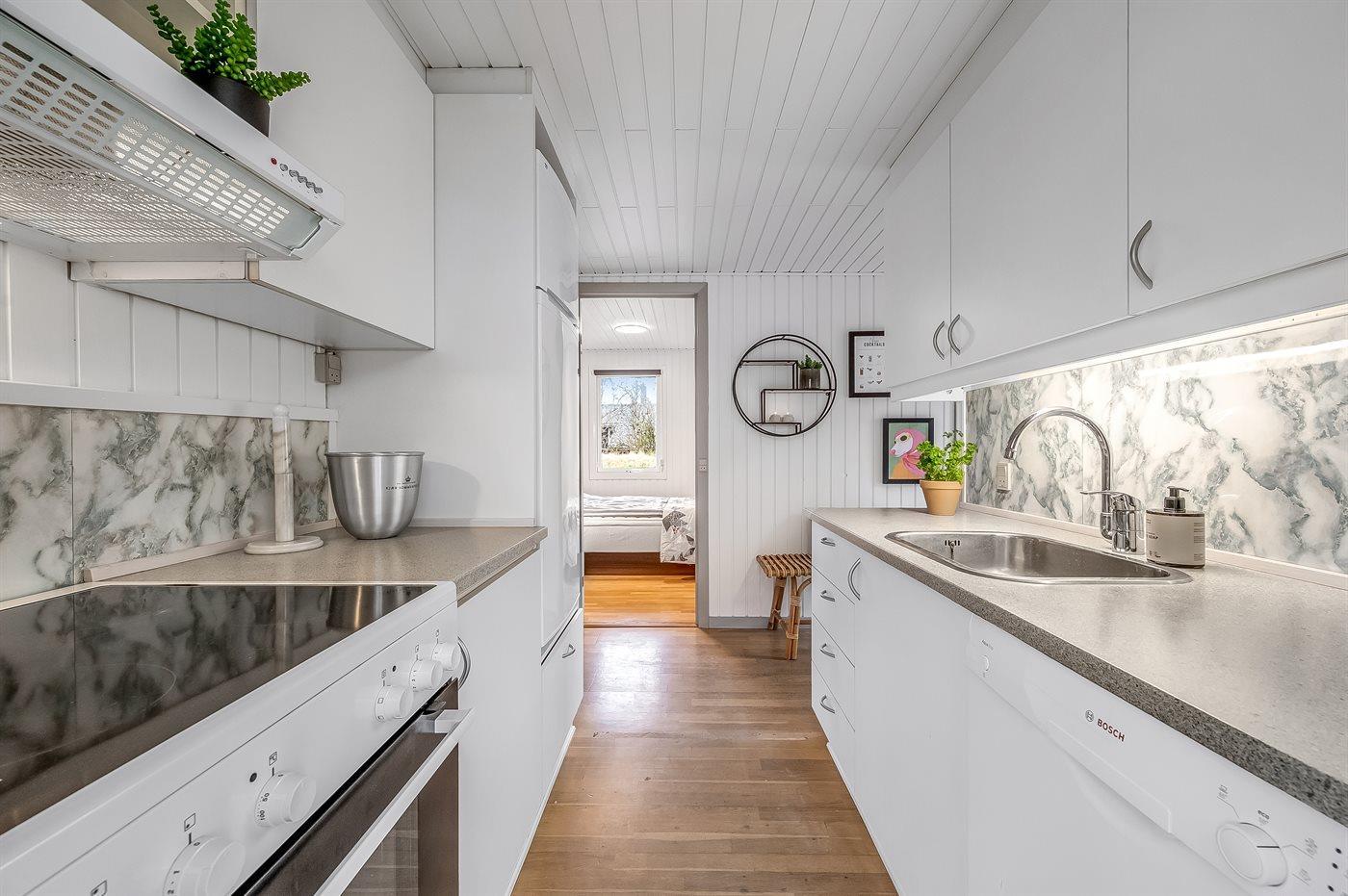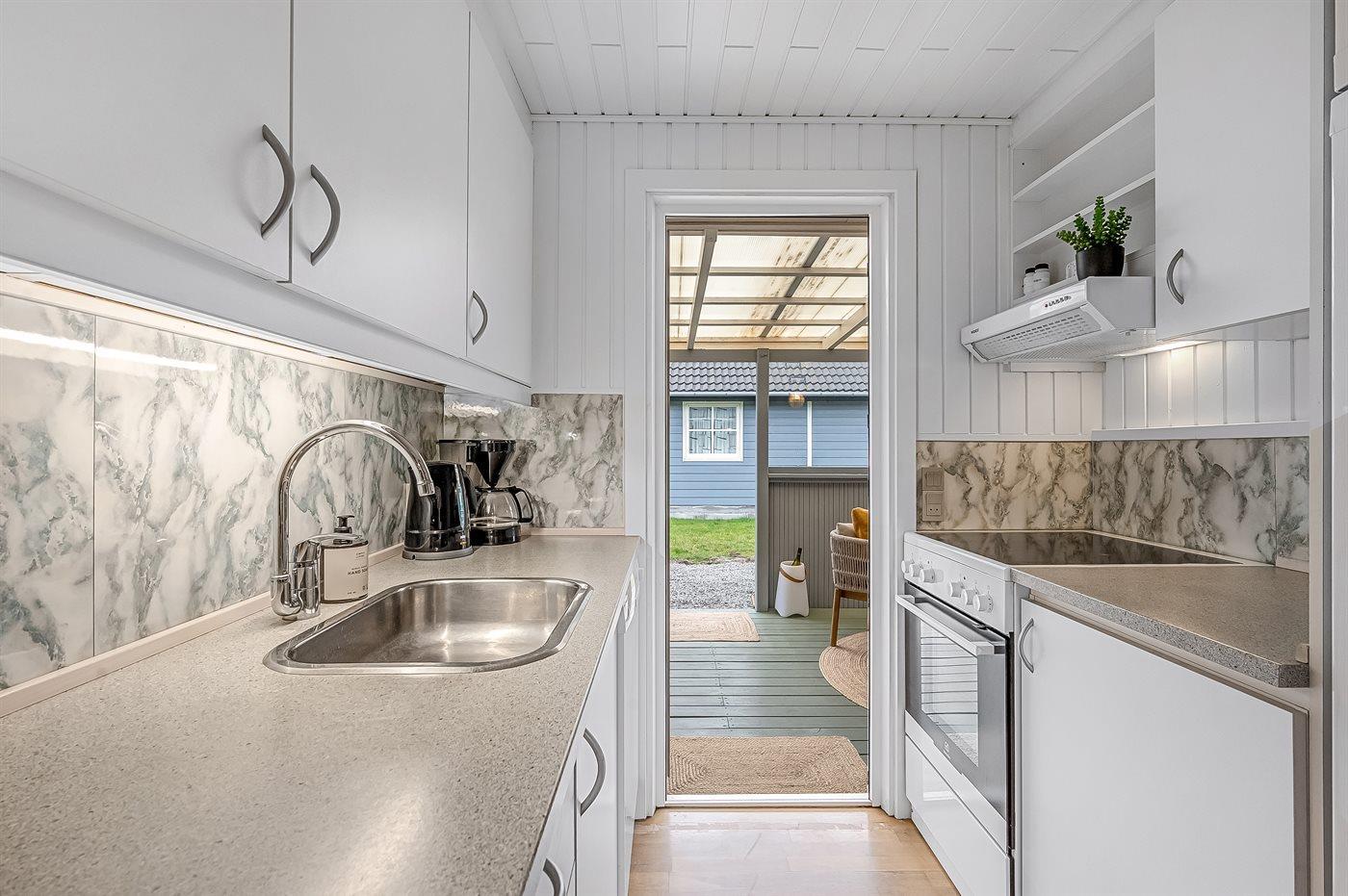 Køkkenet er udstyret med 1 køleskab. Der er 4 keramiske kogeplader, varmluftovn, mikrobølgeovn samt opvaskemaskine.