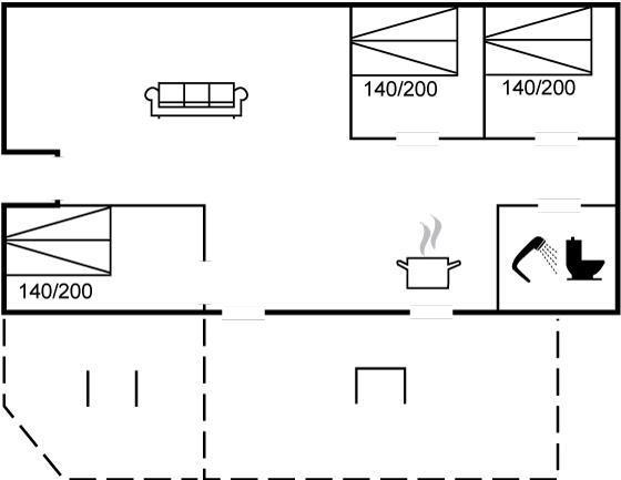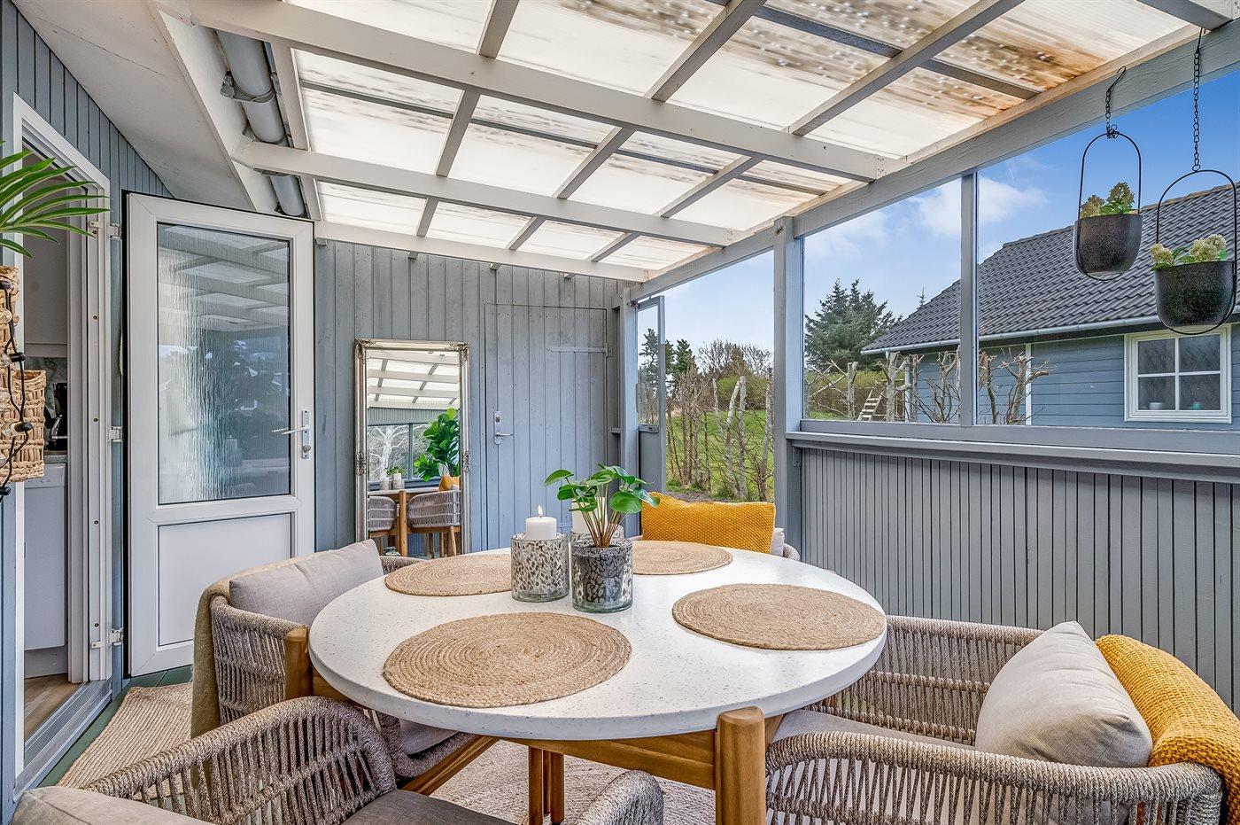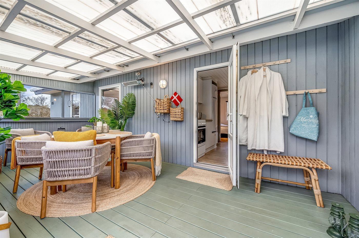 Fra køkkenalrummet, der indbyder til afslapning med en god bog foran brændeovnen, er der adgang til den hyggelige udestue, hvor I vil føle jer midt i naturen. Her kan I trække ud og gøre de lange sommernætter endnu længere. Selv på en regnvejrsdag er det hyggeligt at sidde indenfor i tørvejr og høre regnens trommen på taget, og bliver her køligt, kan I varme jer i de lækre plaider eller tænde for varmelampen.