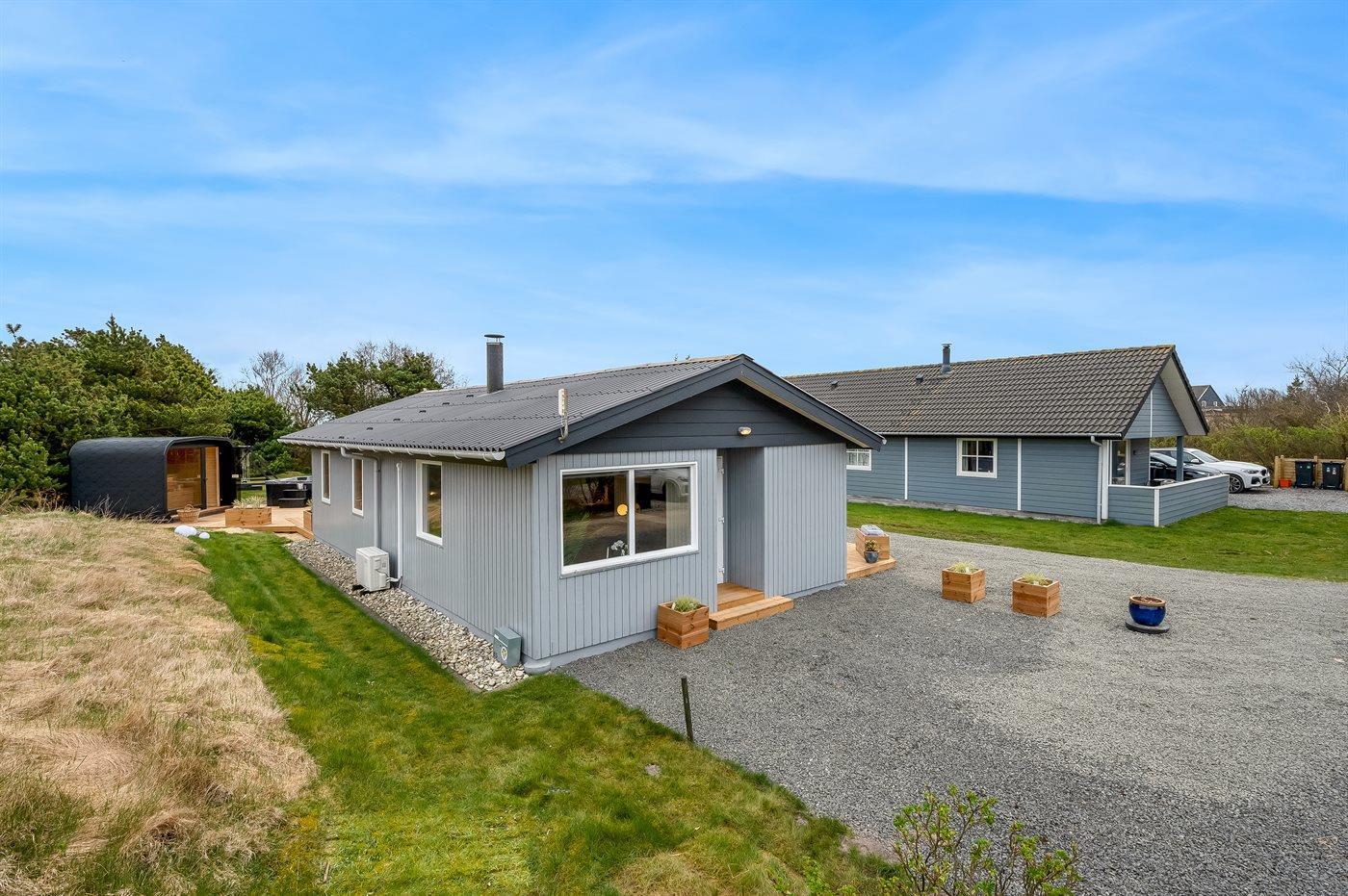 Feriehus ved Vesterhavet med sauna, vildmarksbad og udestue til afslapning i naturskønne omgivelser.