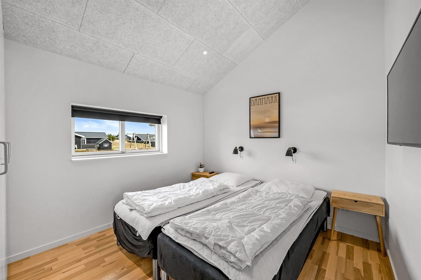Der er i alt 4 soveværelser. Sovepladserne fordeler sig på: 8 sovepladser i dobbeltsenge. 2 sovepladser på madrasser. 2 af disse sovepladser befinder sig på husets hems.
