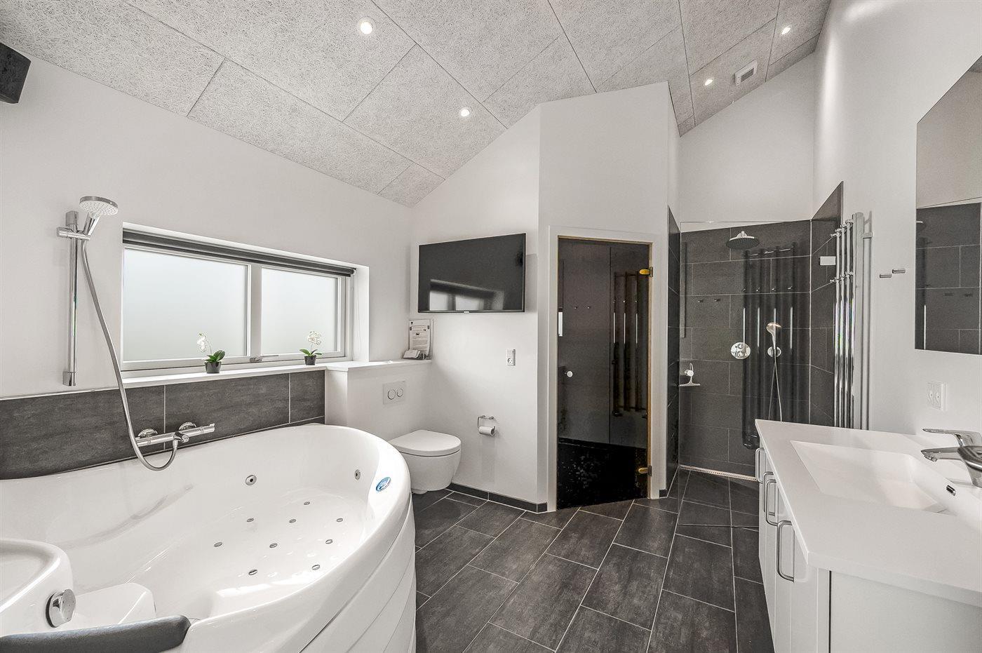 Der er 2 badeværelser med bruseniche og 2 toiletter. Der er gulvvarme på 2 badeværelser. I saunaen er der mulighed for afslapning.