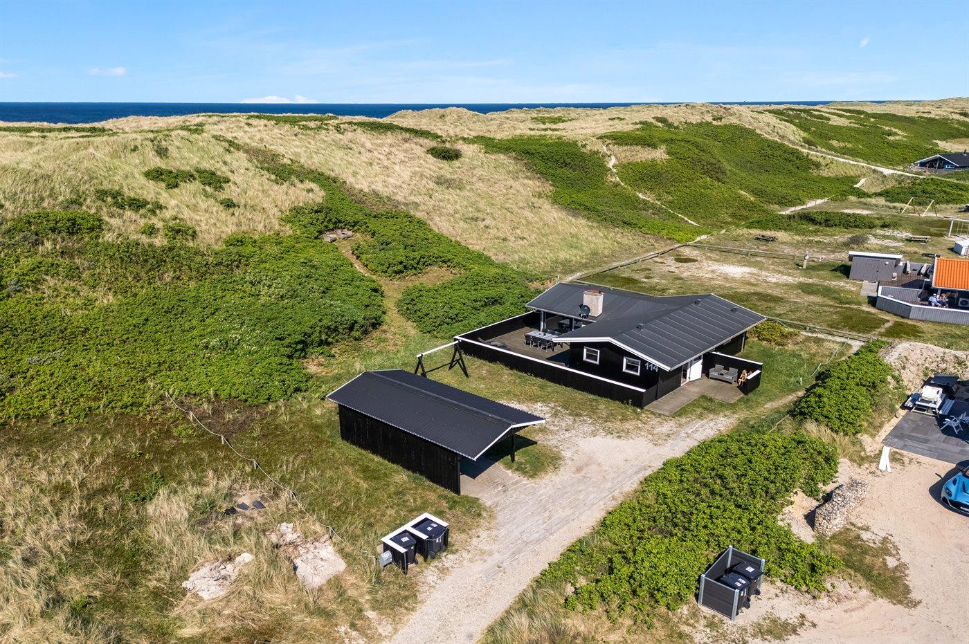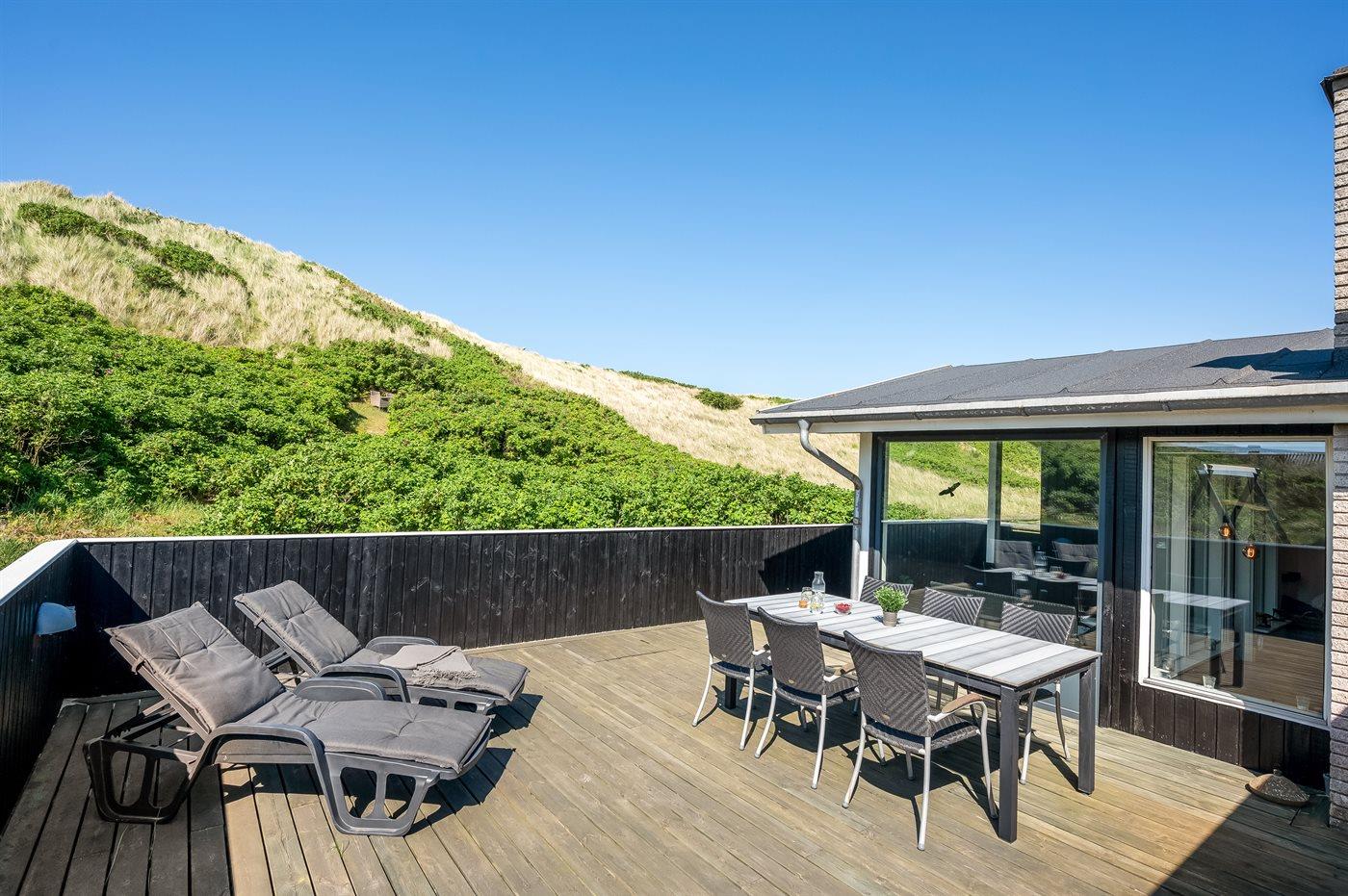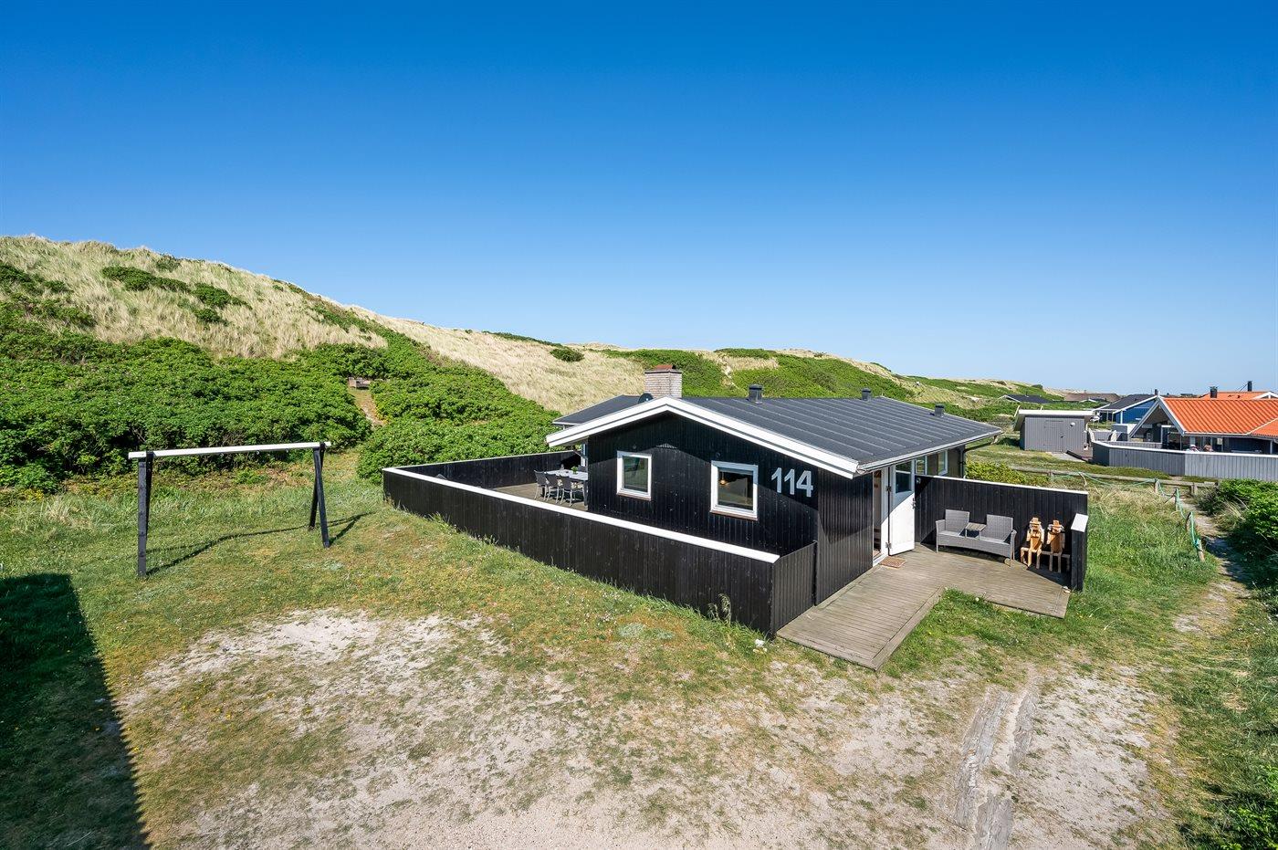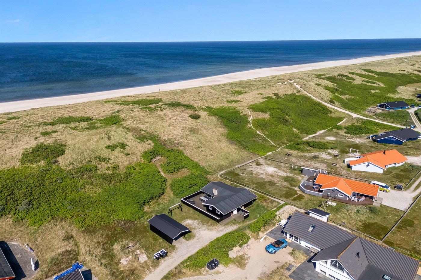 Dette super hyggelige sommerhus har en helt unik beliggenhed i yderste klitrække kun 50 m fra Vesterhavet. På den sydvendt terrasse kan du nyde udsigten til det smukke klitlandskab, alt imens du kan lytte til Vesterhavets brusen, og da terrassen er lukket, kan børn og hunde frit boltre sig. Dette sommerhus har de perfekte rammer til ren afslapning og opladning.