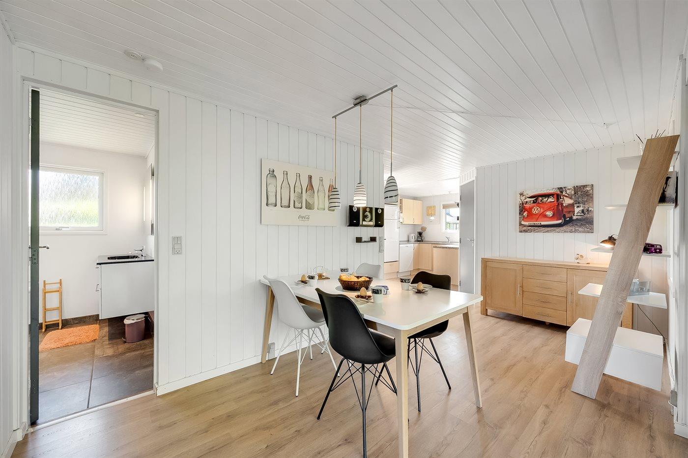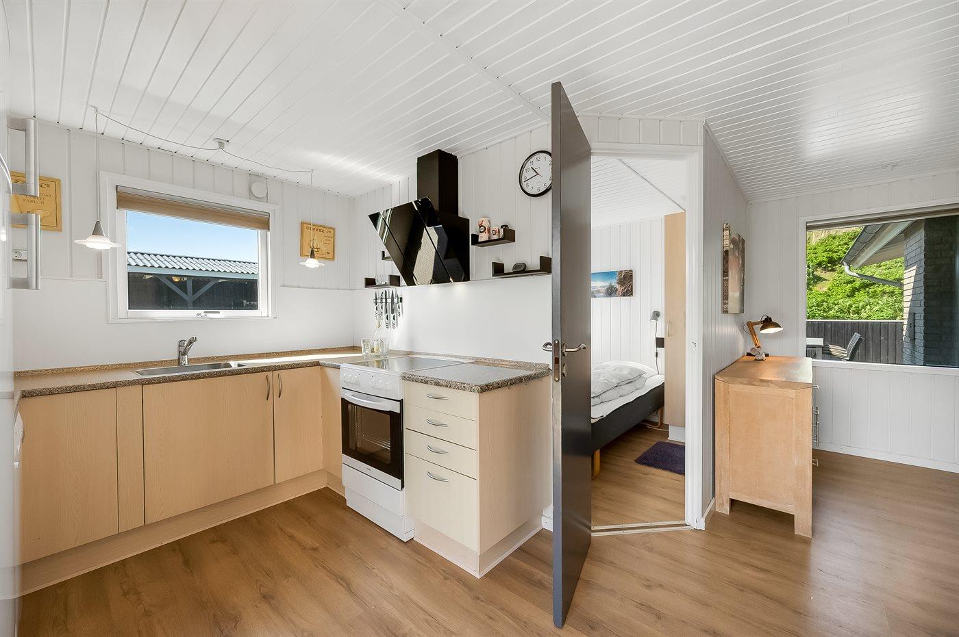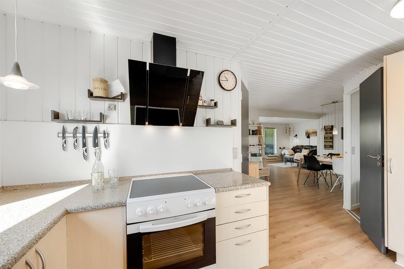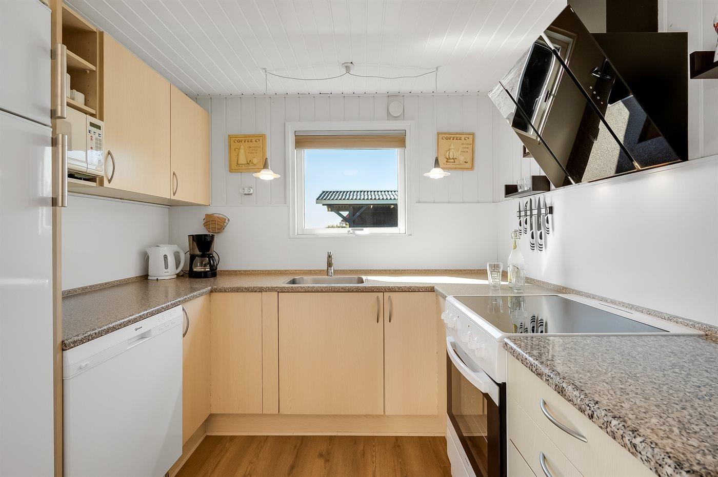 Køkkenet er udstyret med 1 køleskab. Der er 4 keramiske kogeplader, varmluftovn, mikrobølgeovn samt opvaskemaskine.