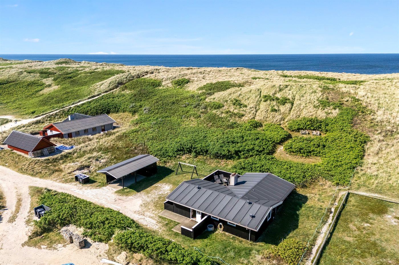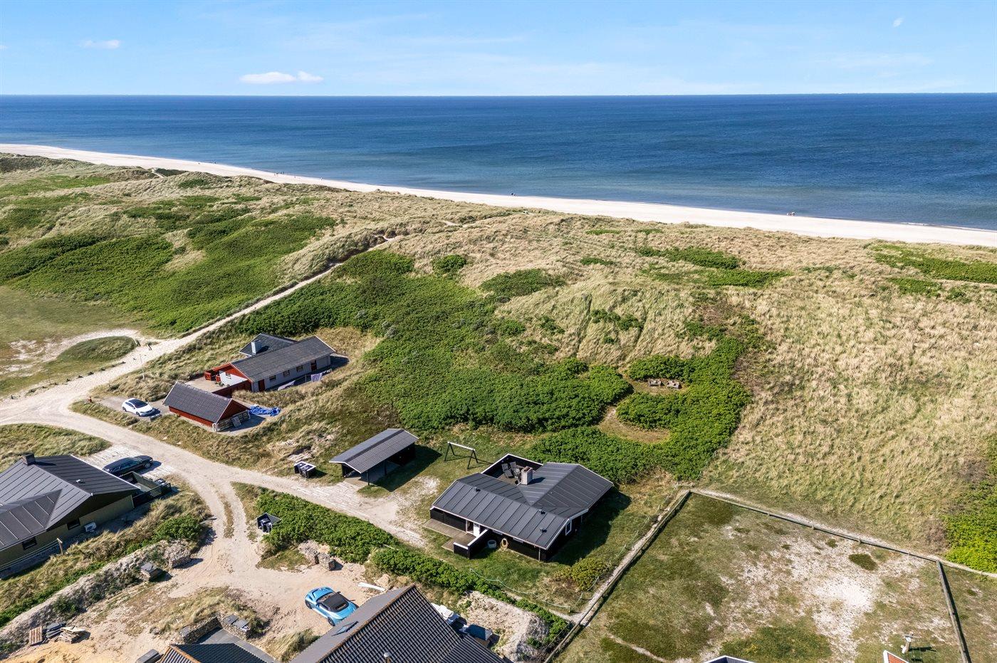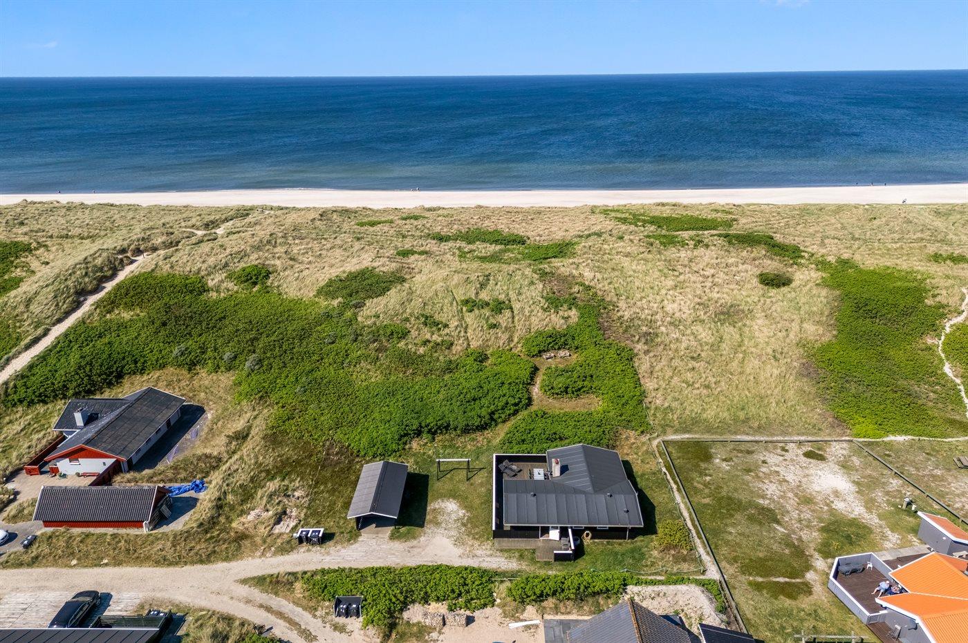 Ferieboligen er beliggende på en 1208 m² stor klitgrund. Der er 50 m til havet. Nærmeste forretning er beliggende i en afstand af 1300 m. Til ferieboligen hører åbent terrasseareal. Desuden er der overdækket terrasse. Gynge. Der er carport til rådighed. Parkering ved ferieboligen.