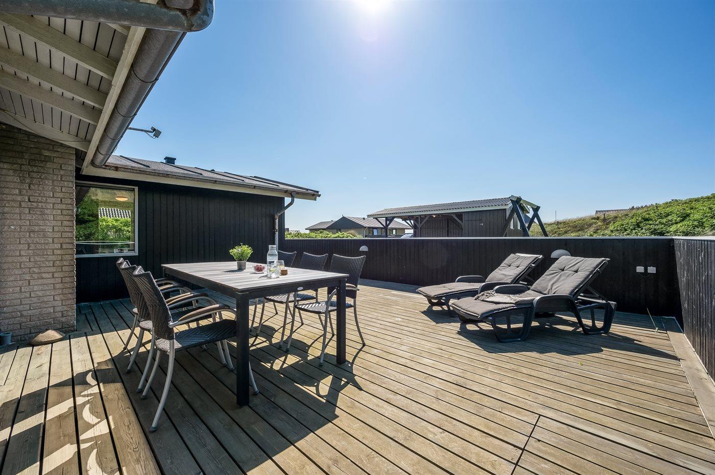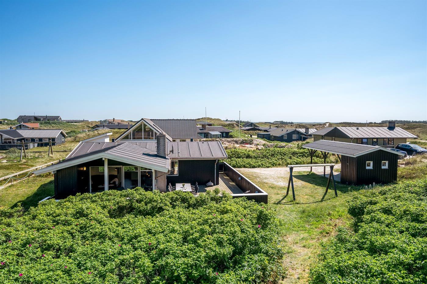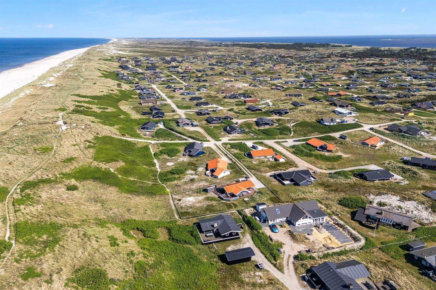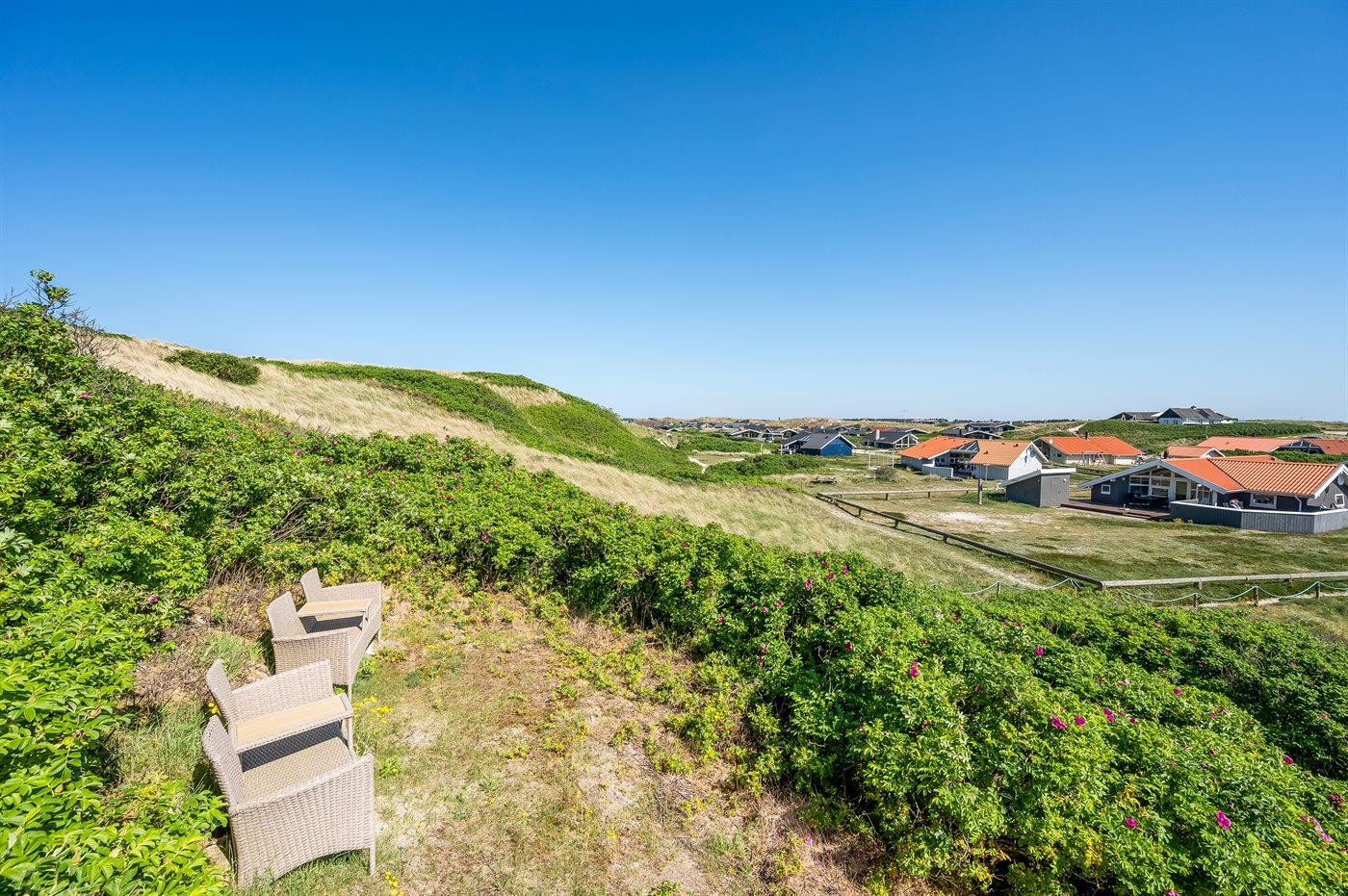Ferieboligen er beliggende på en 1208 m² stor klitgrund. Der er 50 m til havet. Nærmeste forretning er beliggende i en afstand af 1300 m. Til ferieboligen hører åbent terrasseareal. Desuden er der overdækket terrasse. Gynge. Der er carport til rådighed. Parkering ved ferieboligen.