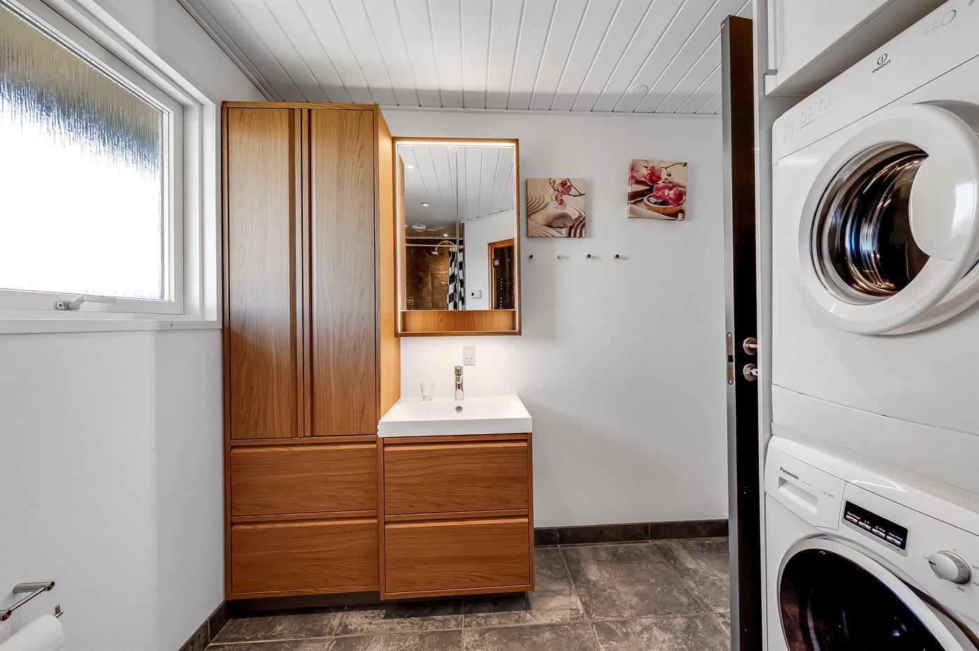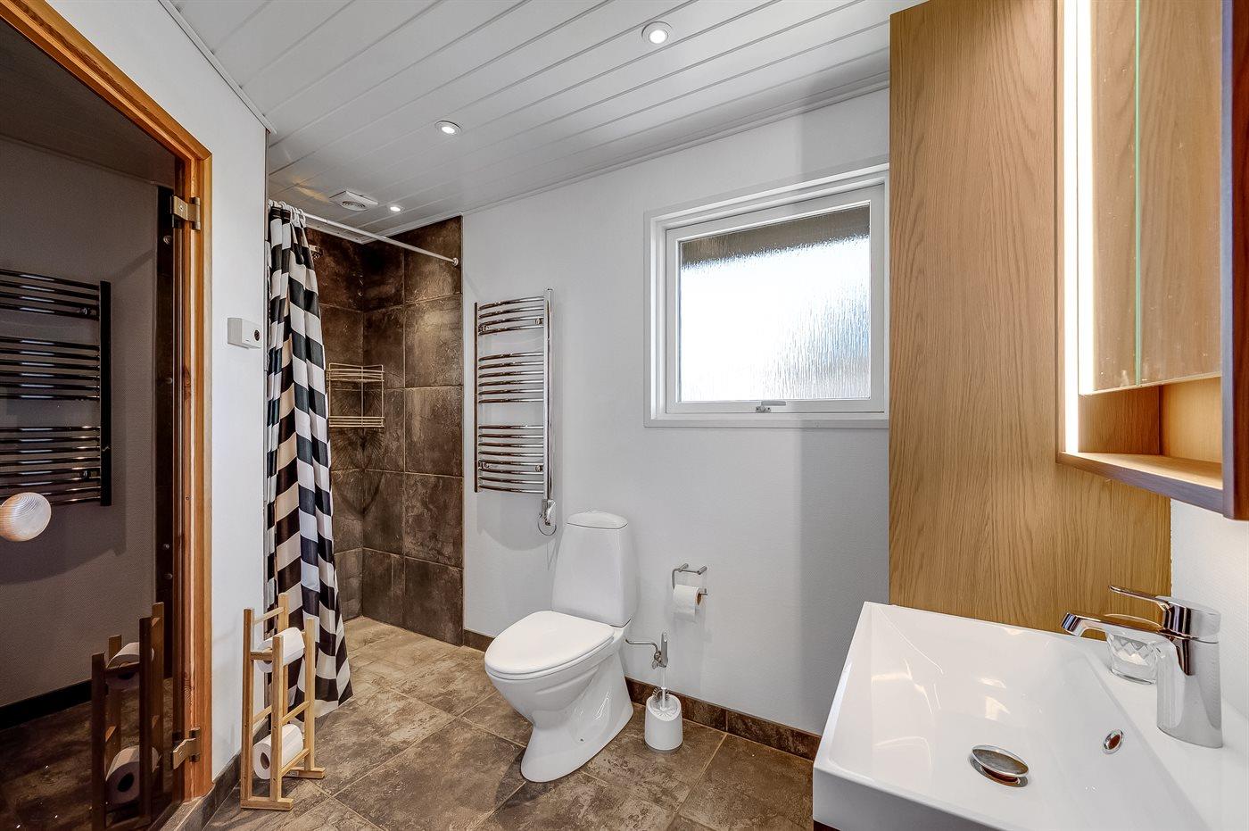 Der er 1 badeværelse med bruseniche og 1 toilet.. Der er gulvvarme på 1 badeværelse. I saunaen er der mulighed for afslapning.