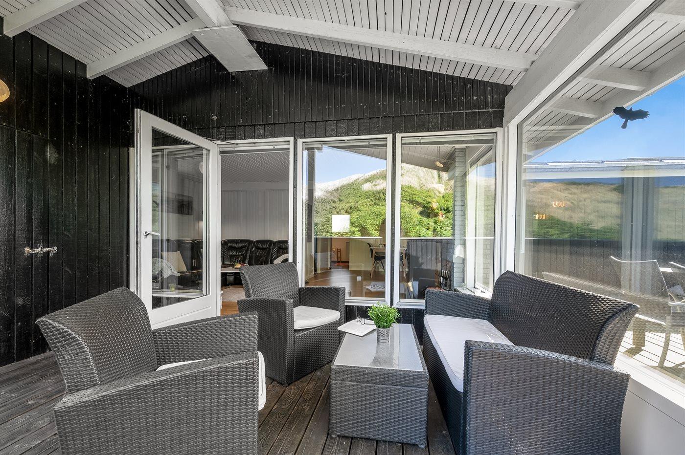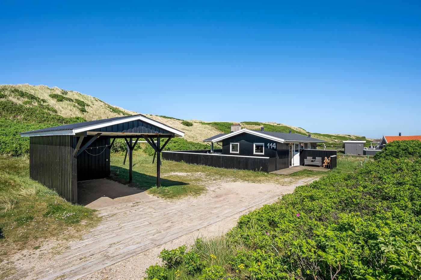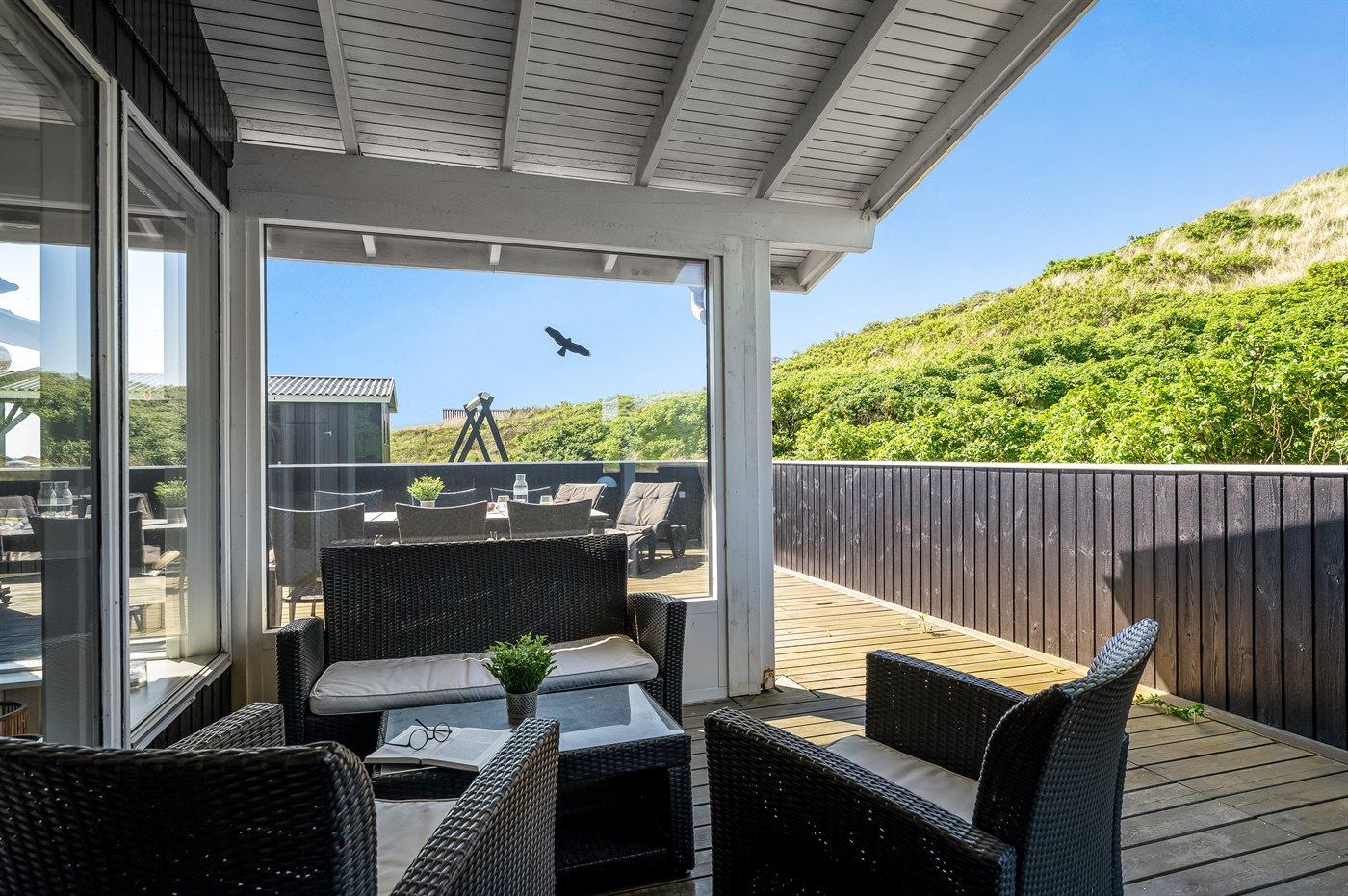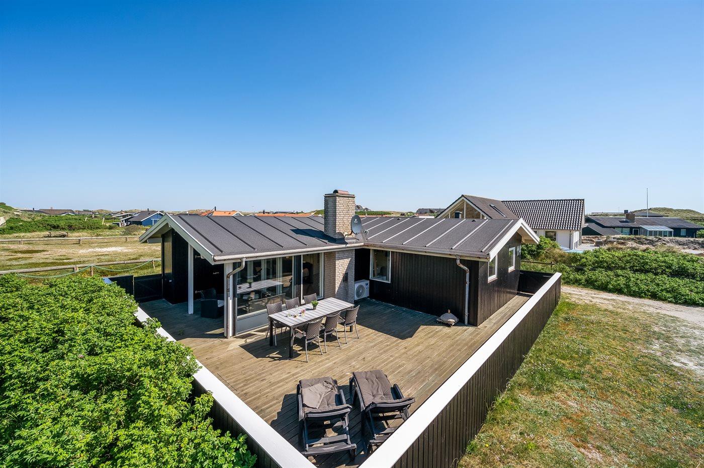 Hyggeligt sommerhus i klitrækken kun 50 m fra Vesterhavet med lukket terrasse og sauna.