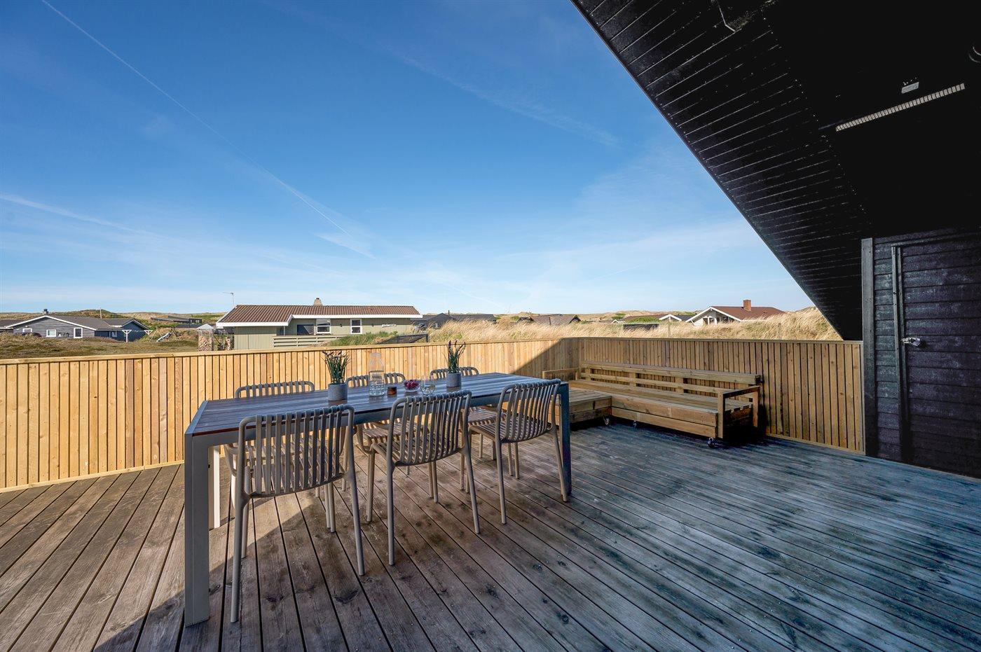 Fra køkken-alrummet er der direkte adgang til den flotte træterrasse, hvor du kan slappe af i loungemøblerne - nyde udsigten over klitterne eller en lækker frokost. På terrassen finder du også en udendørs bruser, hvor du kan skylle saltvandet af kroppen og sandet af fødderne, når du har taget en dukkert i Vesterhavet. Du kan også vælge at tage morgenbadet under åben himmel, hvilket er en fantastisk oplevelse. Udendørsbruseren kan benyttes fra april til november.