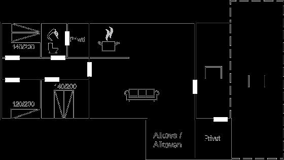 Der er i alt 3 soveværelser. Sovepladserne fordeler sig på: 4 sovepladser i dobbeltsenge. 1 soveplads i enkeltseng.