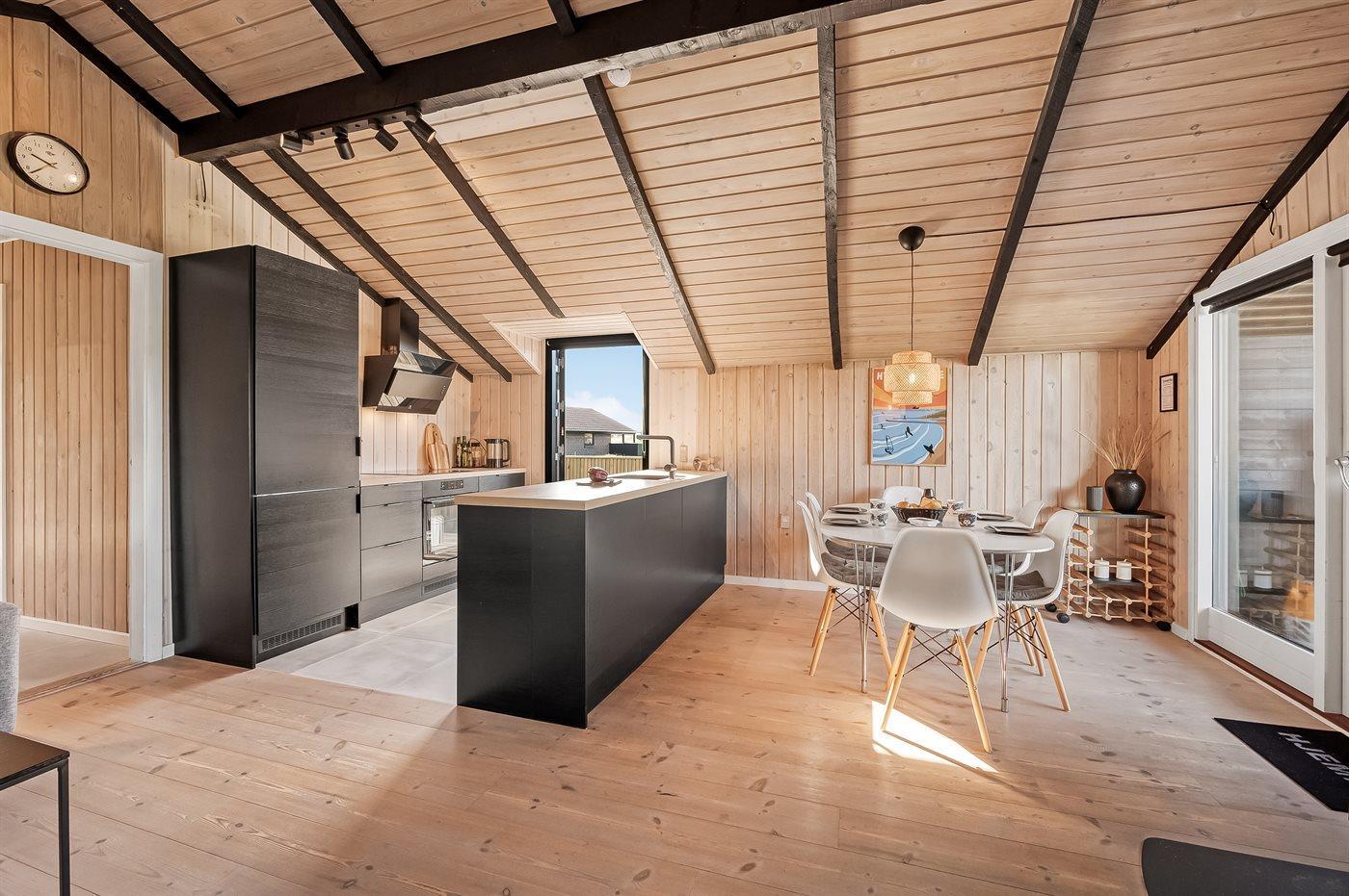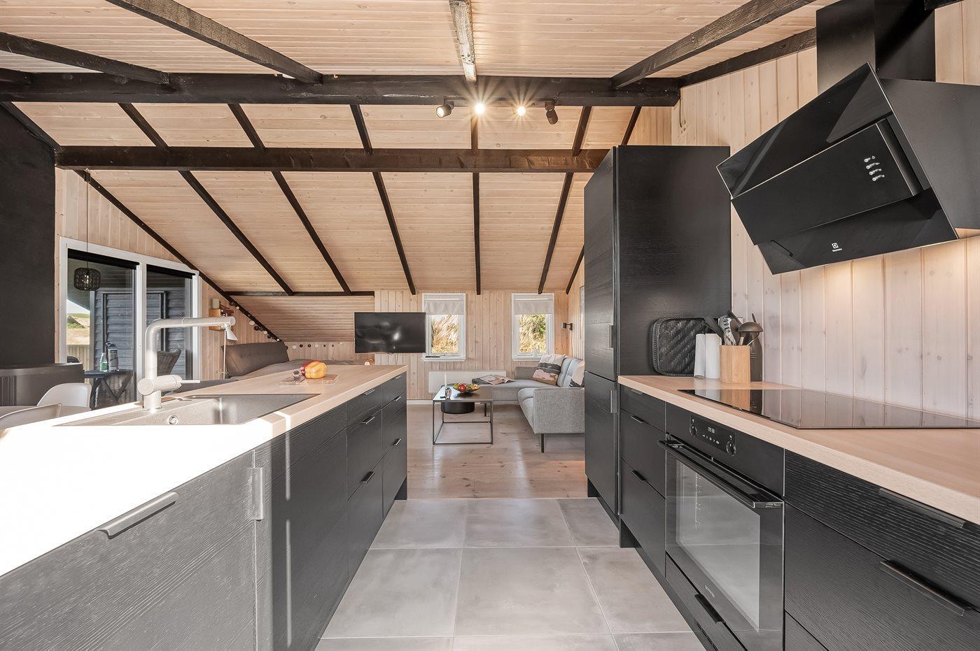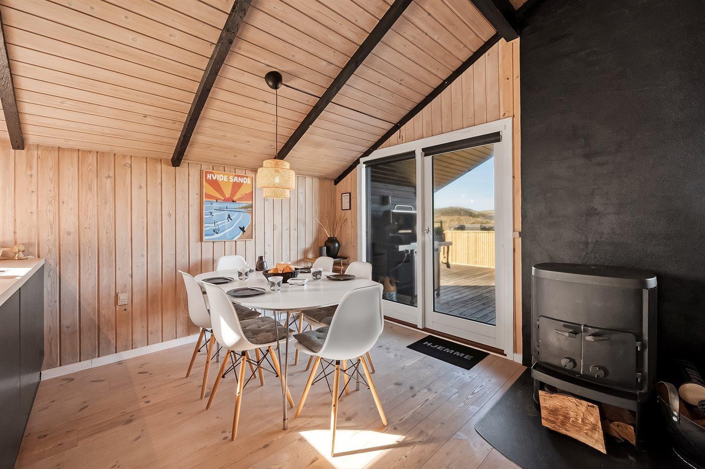 Sommerhuset har en unik charme og en æstetik, der er en blanding af skandinavisk design og funktionalitet - kombineret med tilbagelænet ’surfer-/strand-vibes’ og hygge. Sommerhusets hjerte er det store køkkenalrum med loft til kip og et flot lysindfald. Her kan du slænge dig i sofaen foran brændeovnen, som både varmer og hygger på de kølige dage og aftener. Det er også muligt at nyde hinandens selskab mens der forberedes lækre måltider - med udsigten over klitterne, som baggrundstæppe.