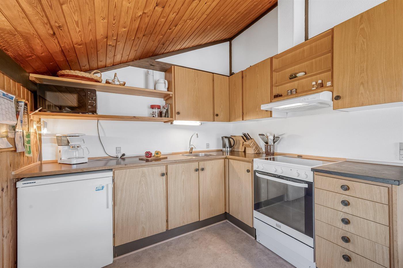 I sommerhusets køkken-alrum er der plads til hygge og samvær, og trænger man til at trække sig lidt, er det dejligt at slænge sig i alkoven, så man kan få lidt alenetid og samtidig være en del af fællesskabet.
