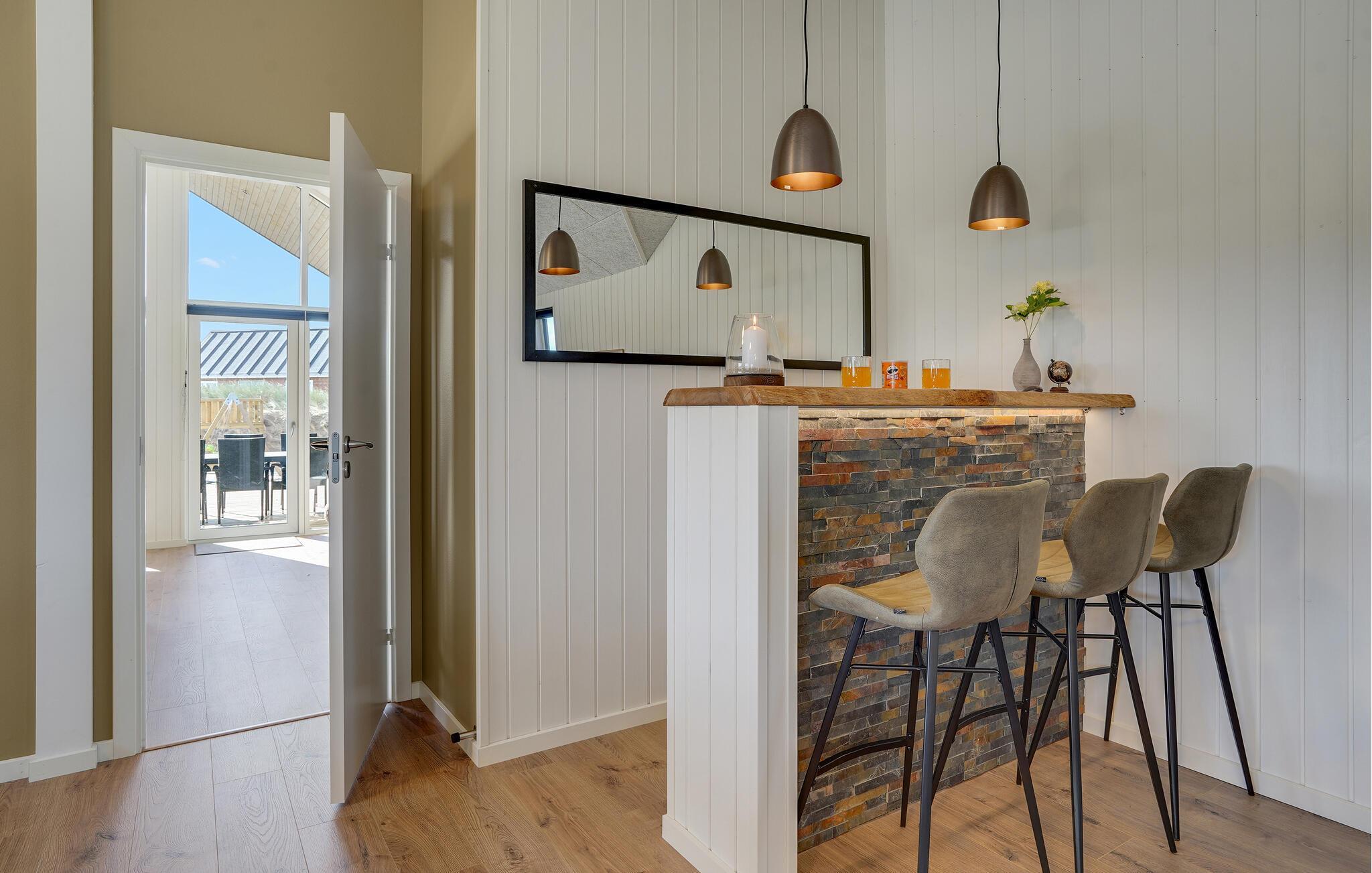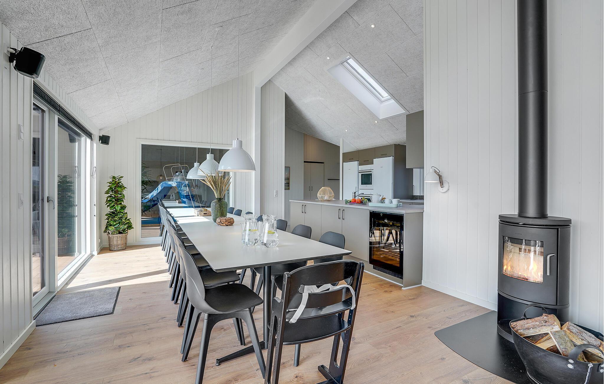Det indre af dette sommerhus byder jer velkommen med et moderne design og rummelige, lyse værelser. Føl jer godt tilpas i den smagfuldt indrettede stue med en god film, spil billard, dart eller Playstation4 og udfordr jer selv ved bordfodboldbordet. Forkæl jer selv med afslappende timer i den indendørs pool eller sauna. Tilbered kulinariske delikatesser sammen i køkkenet af høj kvalitet.