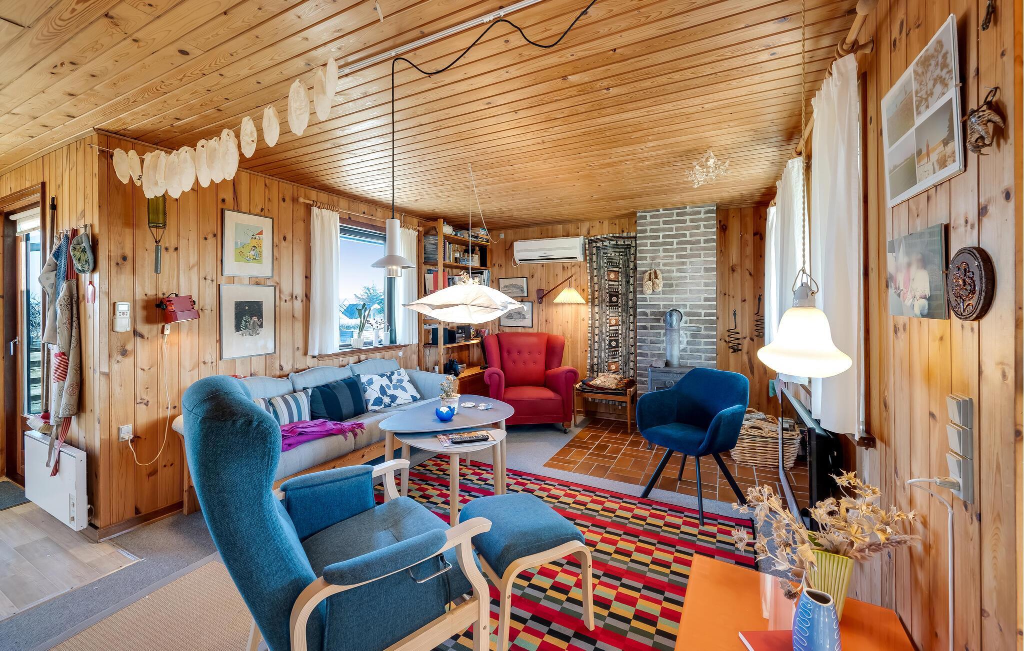 Lad jer smitte af livsglæden, der stråler ud fra dette velindrettede sommerhus ved havet. Tilbered jeres lækre retter i det åbne køkken og tag plads ved det indbydende spisebord. Forkæl jer selv med hyggelige stunder i saunaen og slap af med en bog i lænestolen eller put jer i den behagelige sofa til en spilleaften eller en god film, mens brændeovnen giver ekstra komfort.