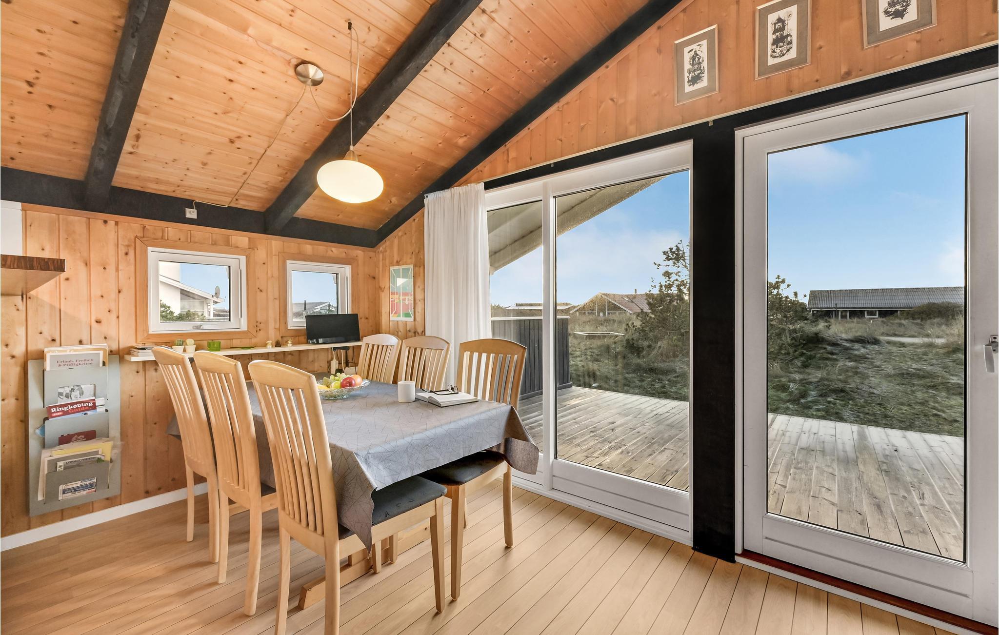 Hyggeligt træhus med sydvendt terrasse tæt på strand i naturskønne Bjerregård ved Vesterhavet og Ringkøbing Fjord.