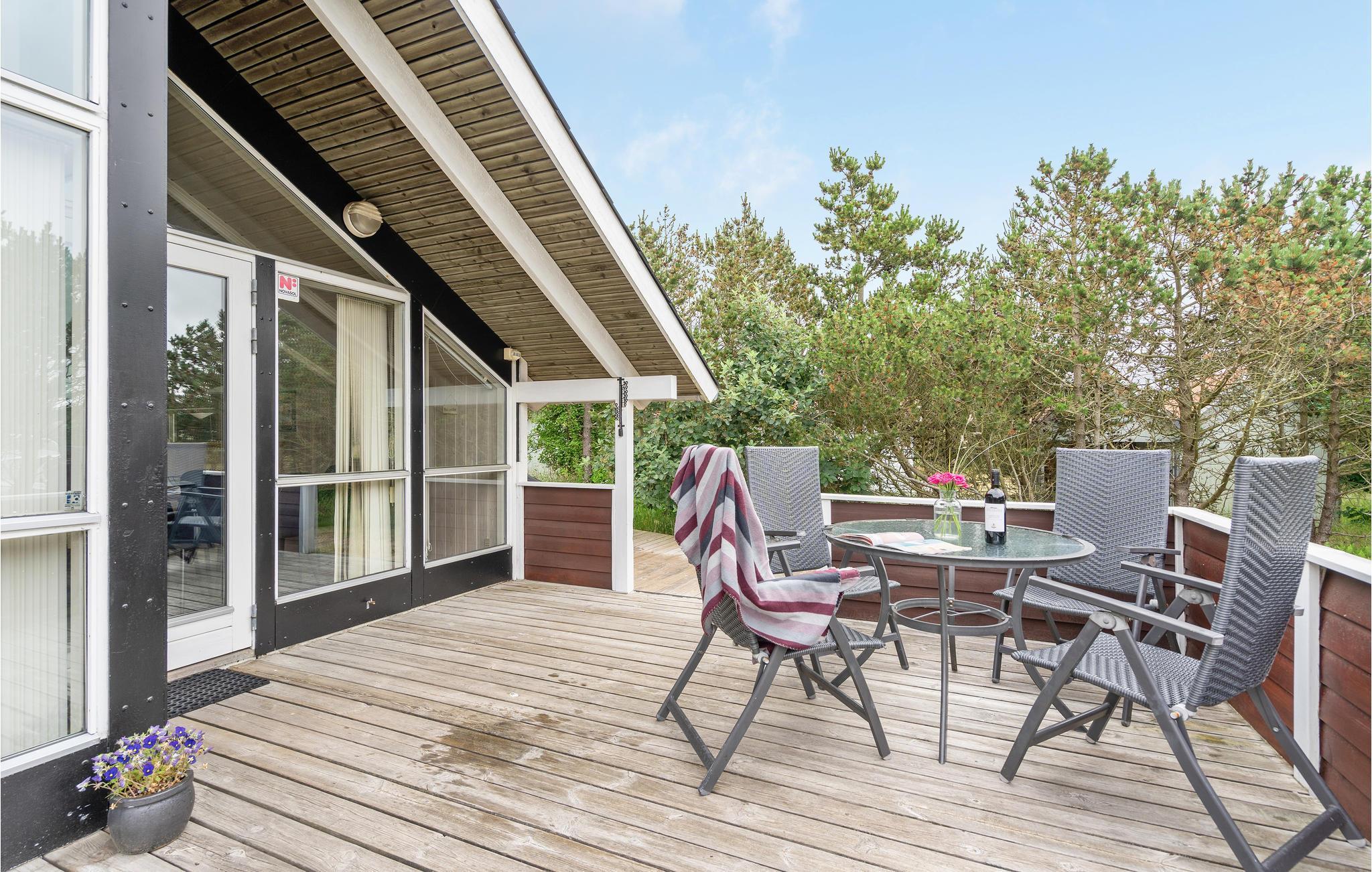 Flot og veludstyret feriehus, beliggende på en let kuperet klitgrund, som er delvist omkranset af fyrretræer. Huset er løbende vedligeholdt, og indeholder bl.a. et flot badeværelse med spabad og sauna, et dejligt lyst køkken i åben forbindelse med den hyggelige og stemningfyldte stue med brændeovn. Til den moderne familie findes der hurtigt internet (fiber-bredbånd), tv med Apple-tv og Chromecast til egne programpakker. Huset er omgivet af en stor, skøn terrasse med dejlige havemøbler og grill, hvor I kan nyde de lange lyse sommerdage. Tæt ved huset går en sti direkte ned til Vesterhavets blå bølger og lange sandstrande. Området ved hav og fjord giver masser af spændende udfoldelsesmuligheder: bl.a. sildefiskeri fra slusen i fiskerbyen Hvide Sande, vandsport på Ringkøbing Fjord, museumsbesøg, shopping og nyde områdets gode restauranter.