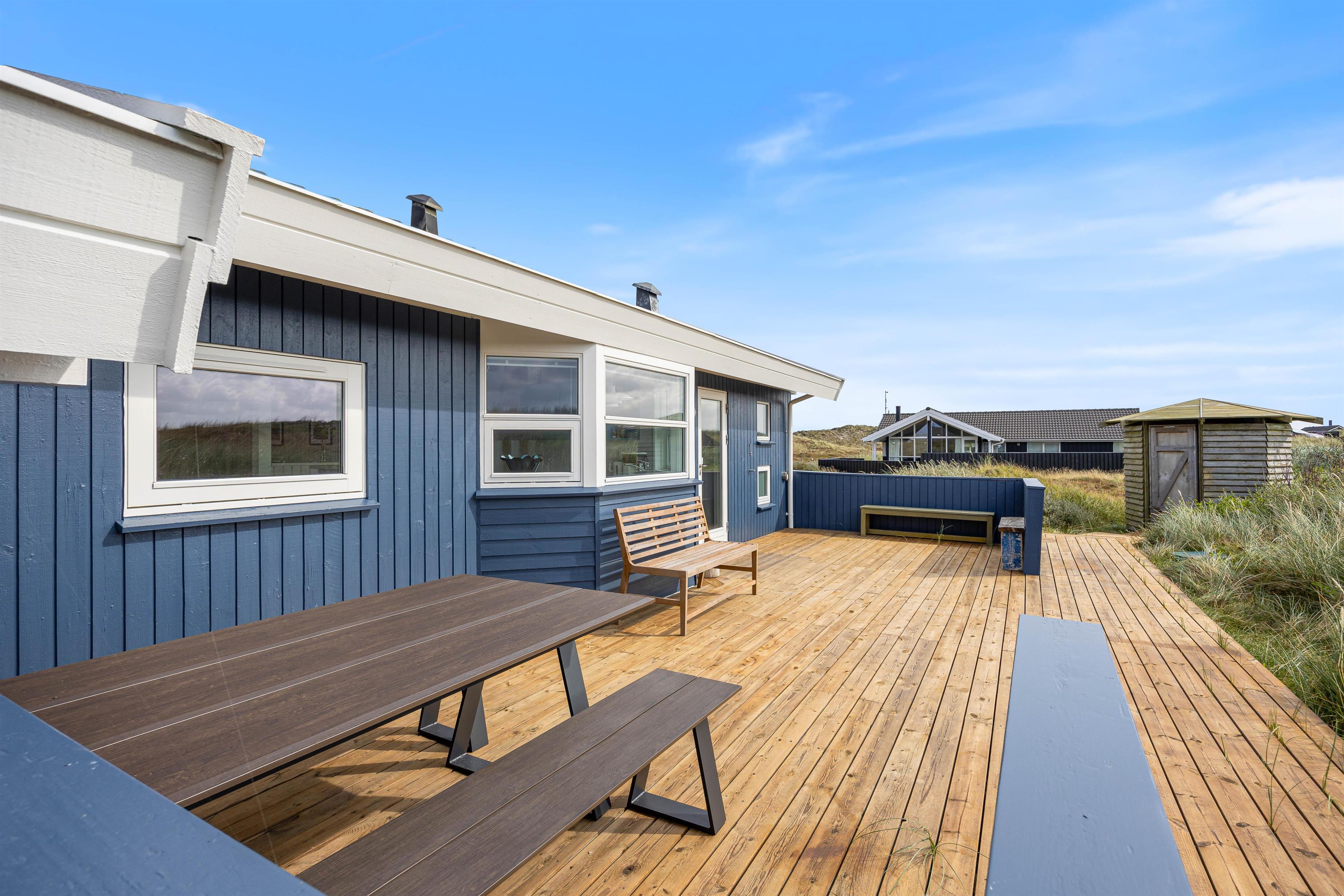 En delvist afskærmet terrasse går langs tre sider af feriehuset, hvor du finder komfortable havemøbler. Det er lige så indbydende til morgenmad om morgenen som til et godt aftenmåltid, tilberedt fra jeres egen gasgrill. Omgivet af den 1200 kvadratmeter store klitgrund/naturgrund kan du nyde panoramaudsigten over klitter og hede og lade roen falde over dig. Gå ikke glip af en vandretur til stranden for at opleve solnedgangen i Vesterhavet – det er altid en oplevelse.