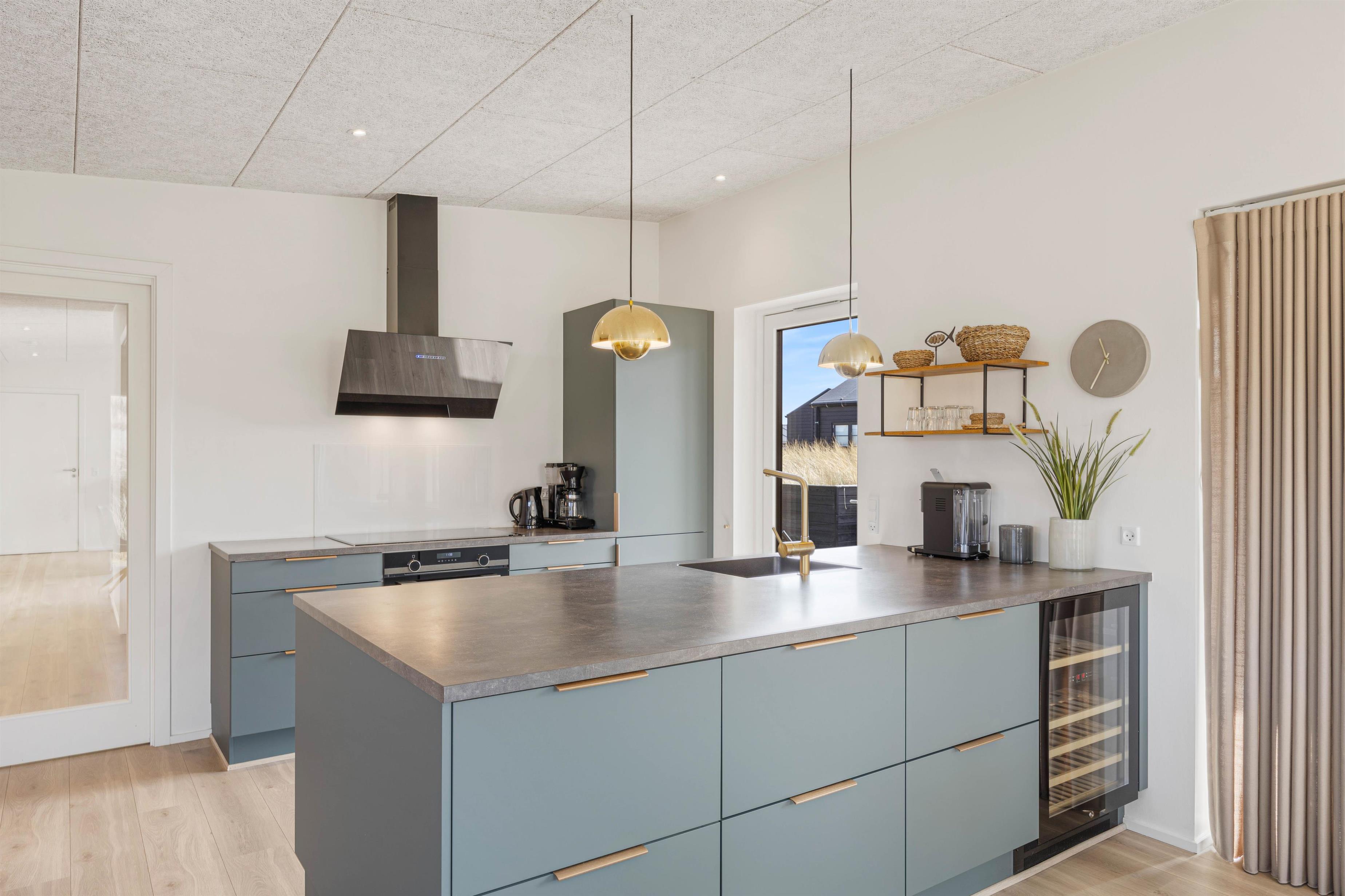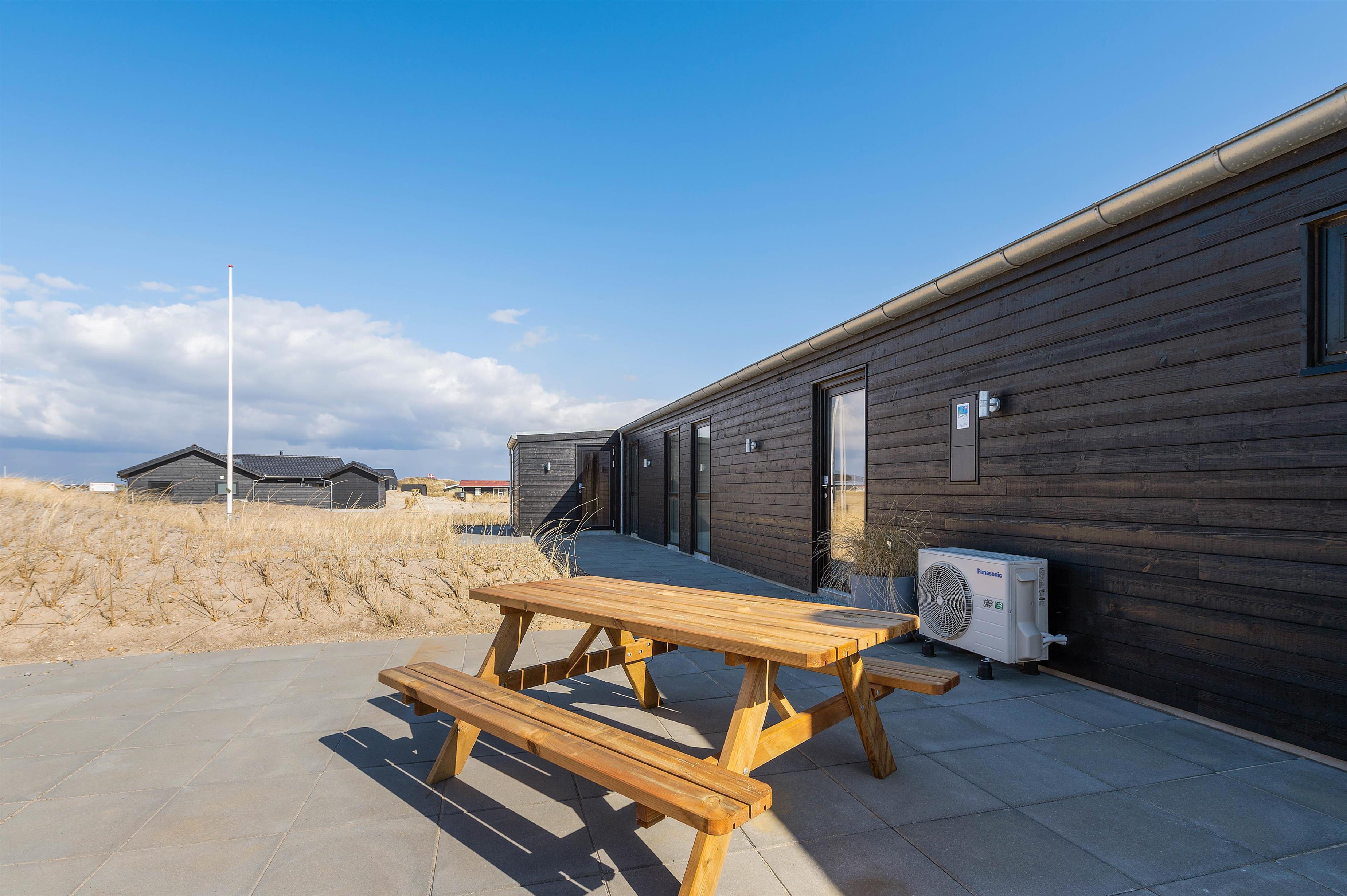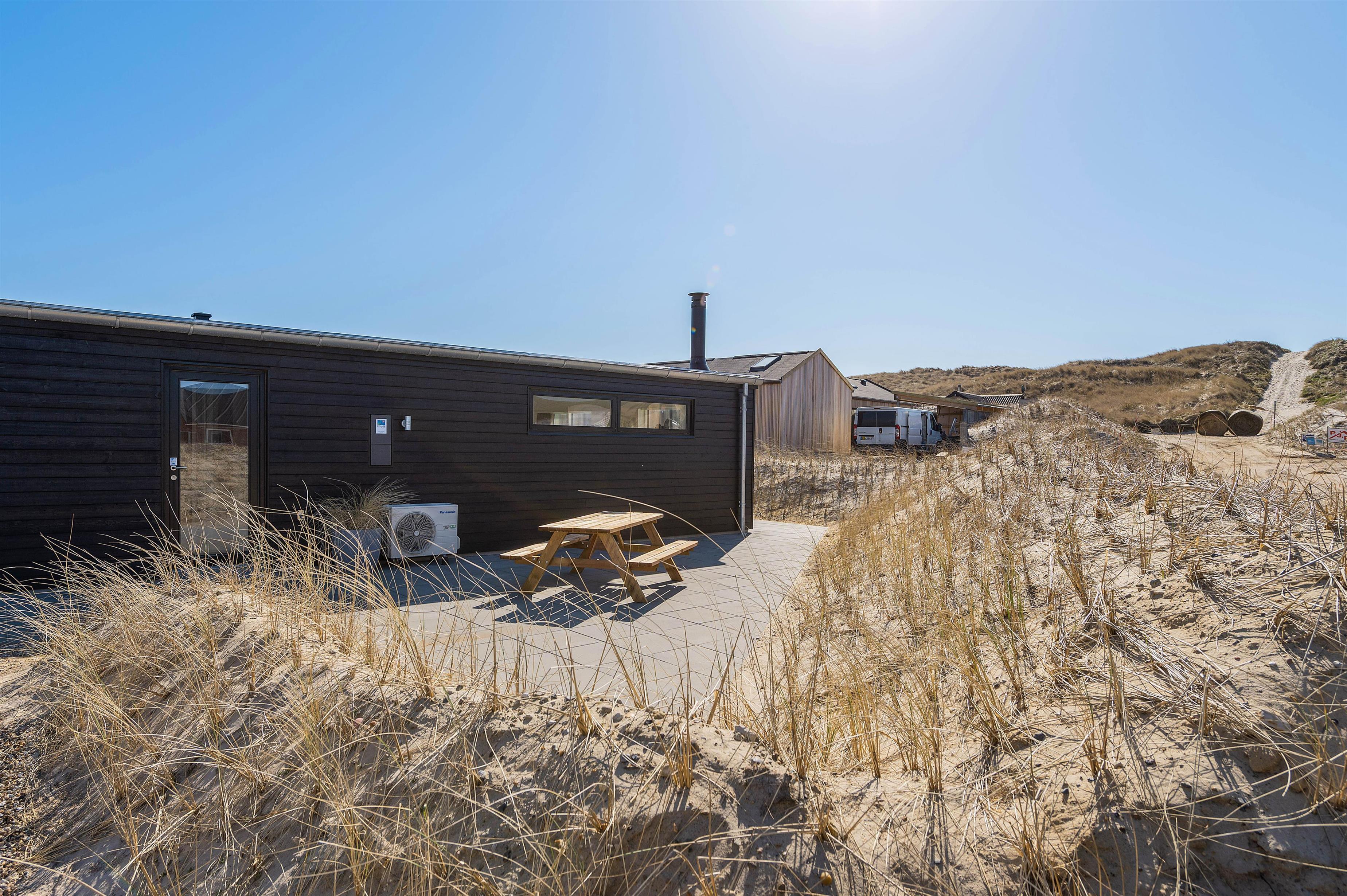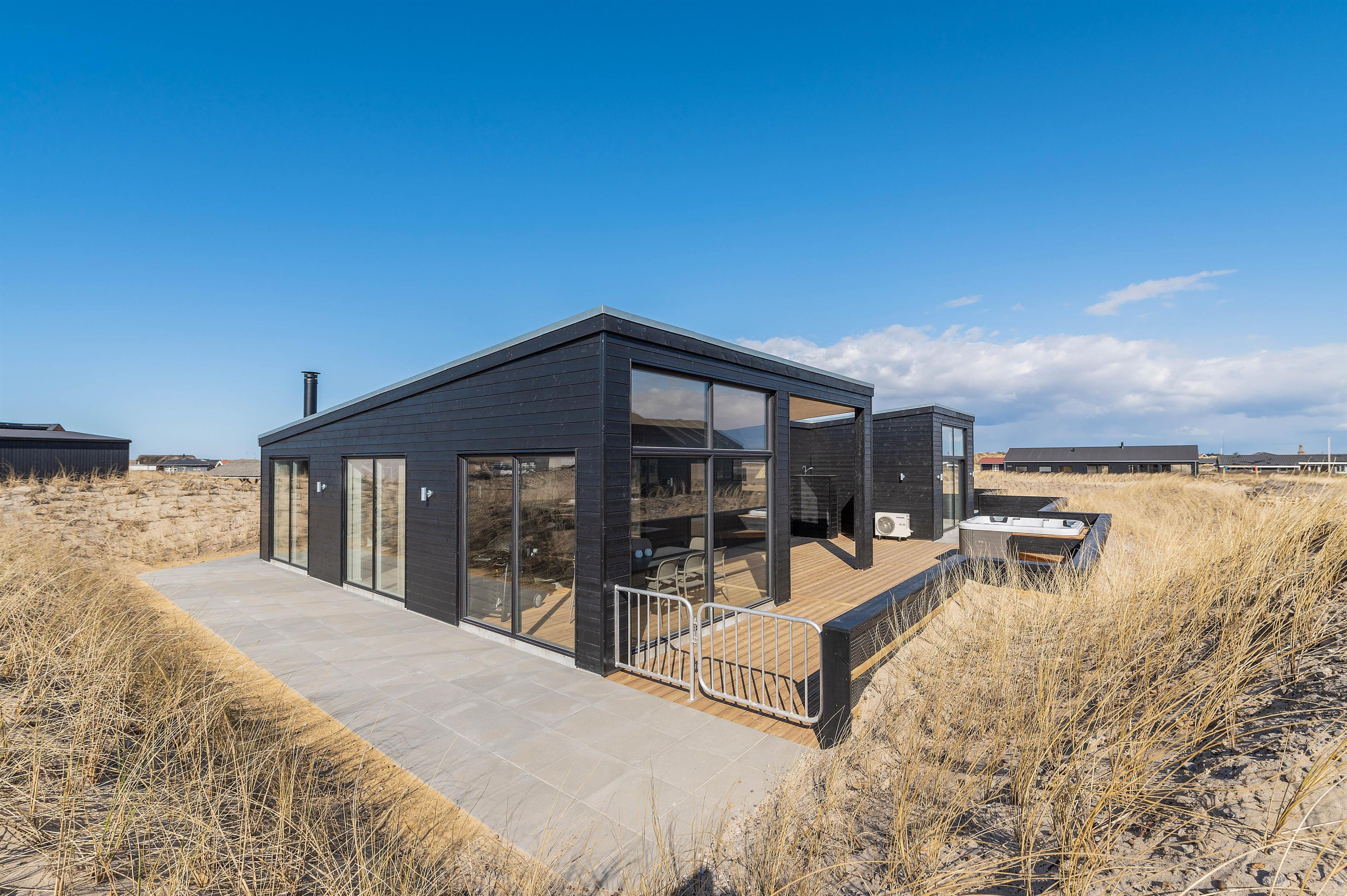 Sommerhuset er bygget i 2021 og står derfor superflot og moderne med lækre komfortable møbler. Fra det veludstyrede køkken er der adgang til det store overdækkede terrasseområde. Her kan I sidde i læ fra Vestenvinden, mens I nyder udsigten over det flotte klitlandskab i Bjerregård.