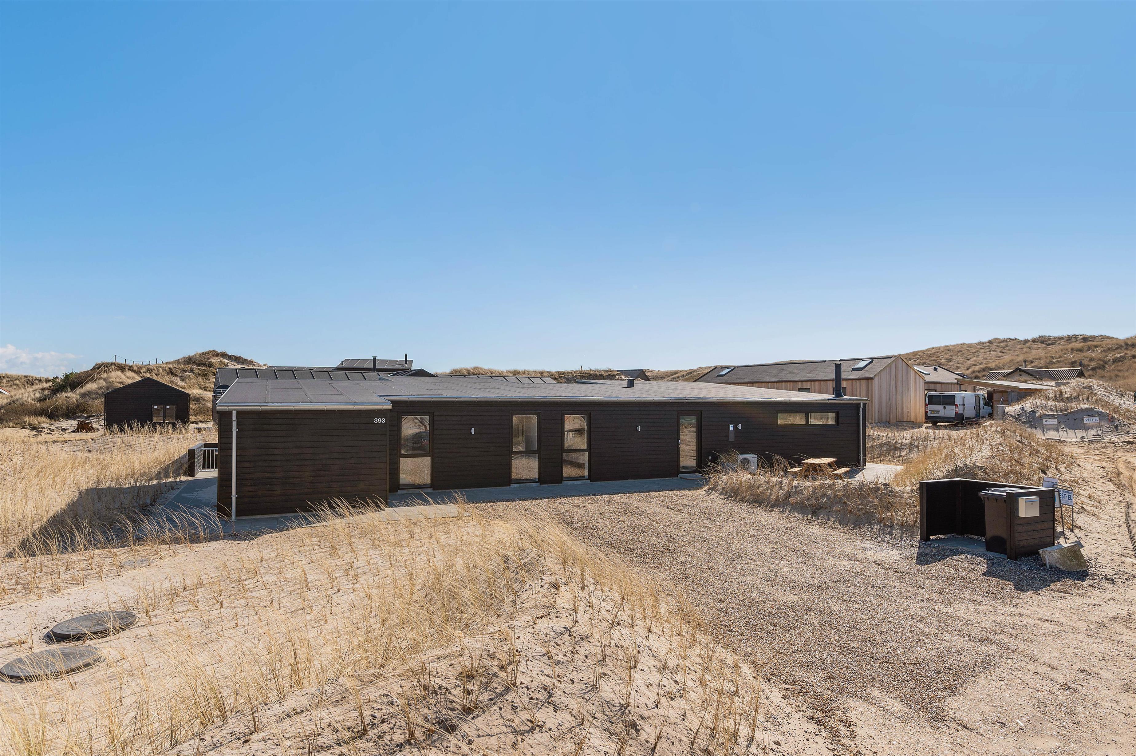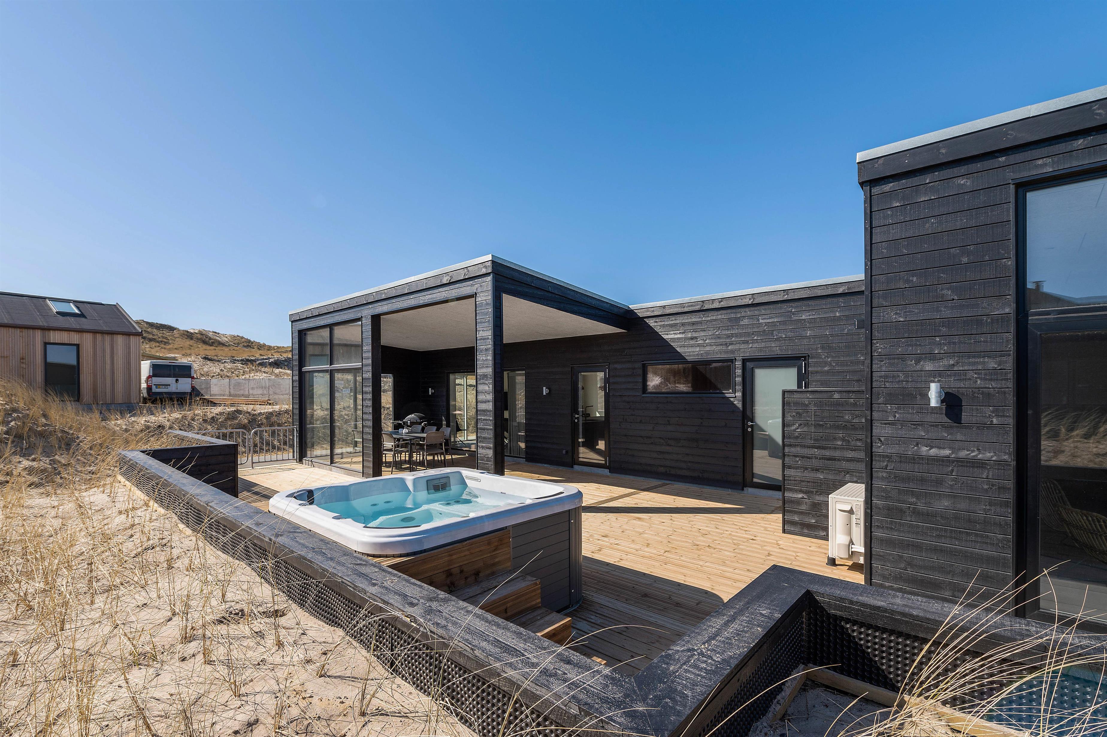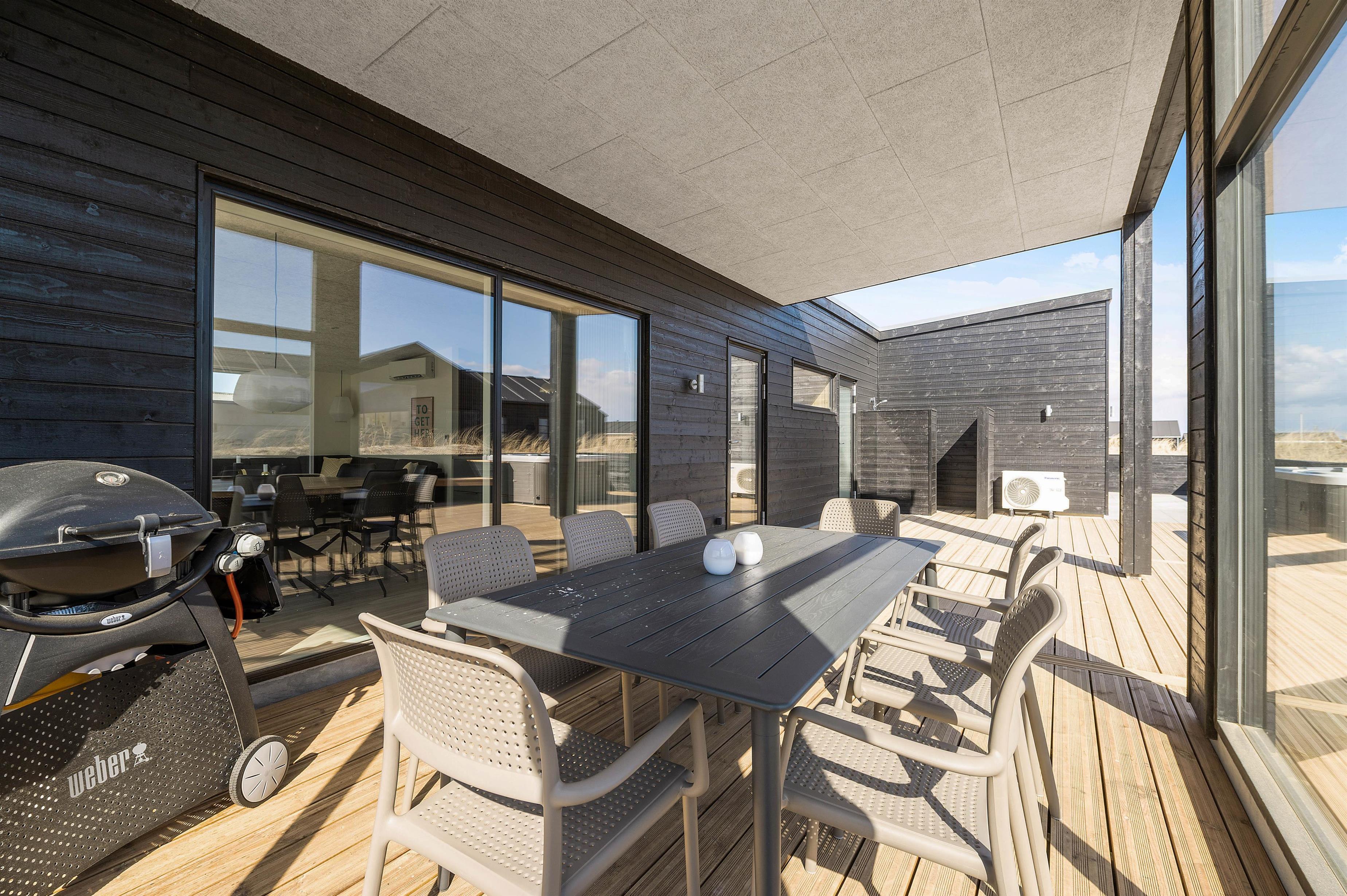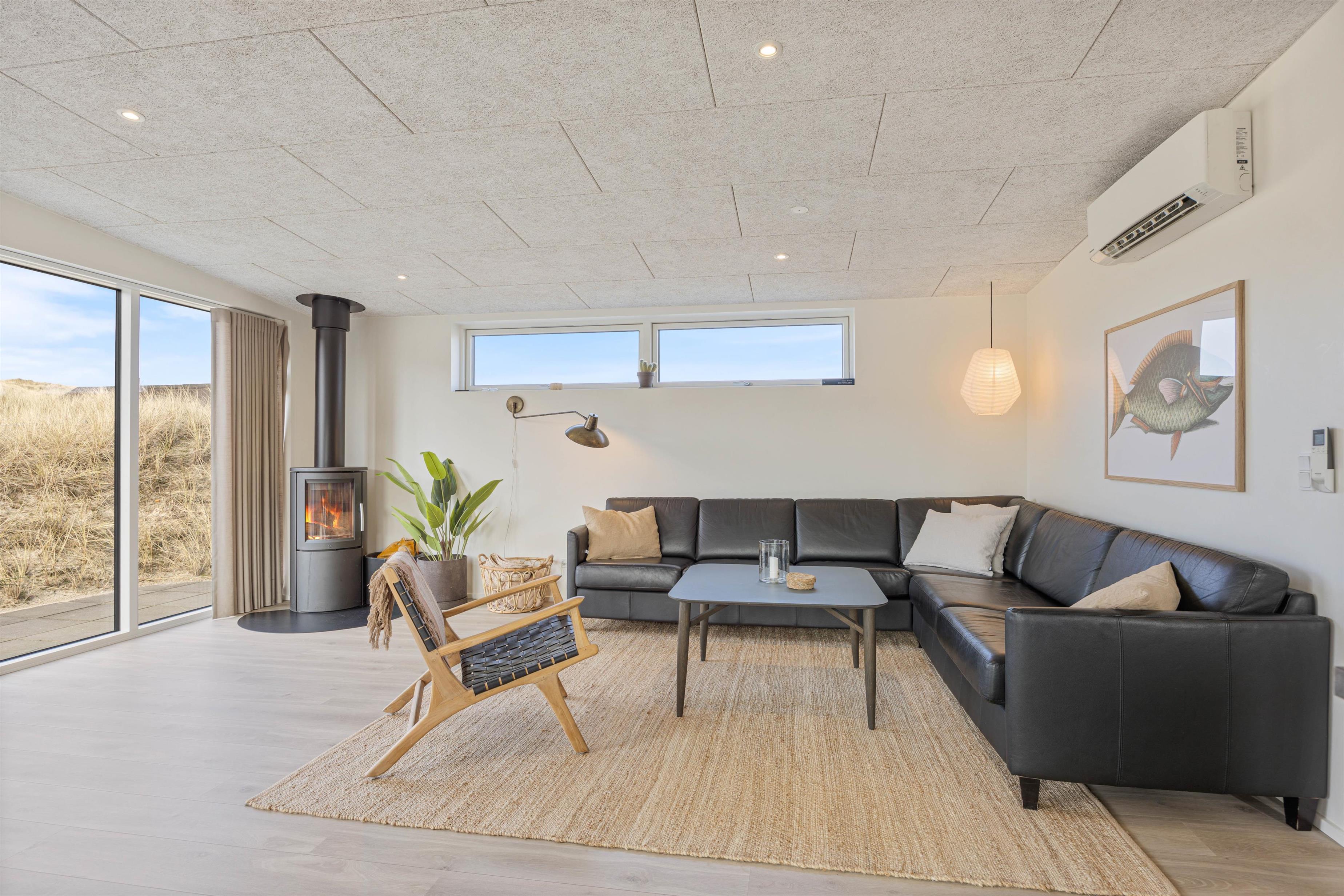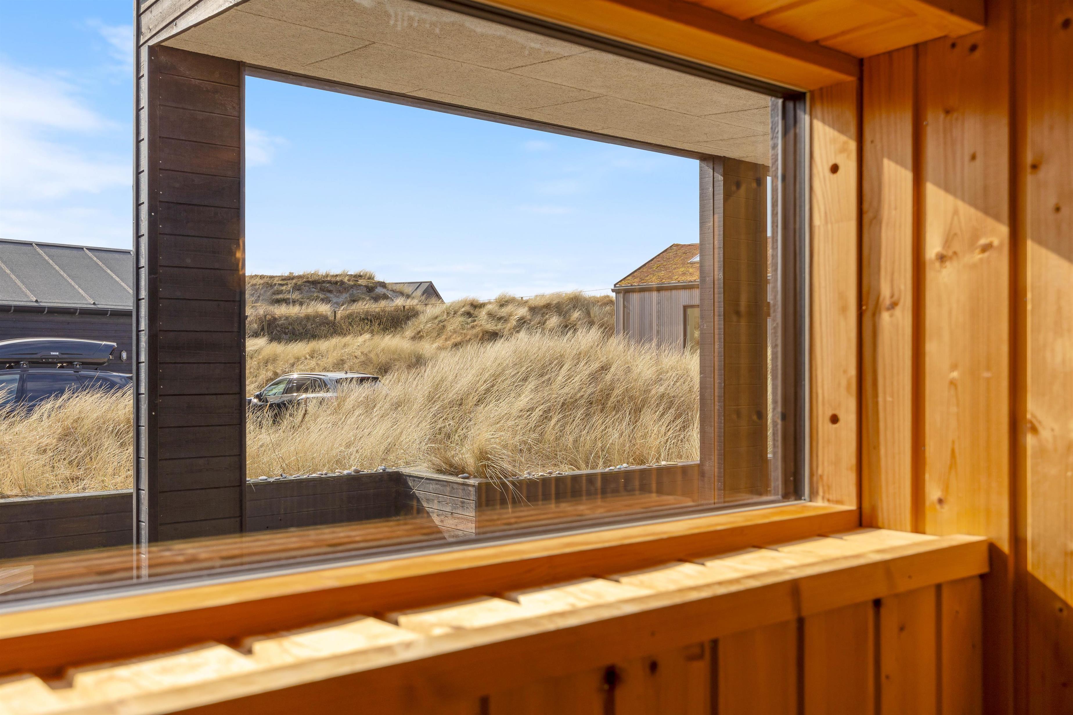 Sommerhuset er bygget i 2021 og står derfor superflot og moderne med lækre komfortable møbler. Fra det veludstyrede køkken er der adgang til det store overdækkede terrasseområde. Her kan I sidde i læ fra Vestenvinden, mens I nyder udsigten over det flotte klitlandskab i Bjerregård.