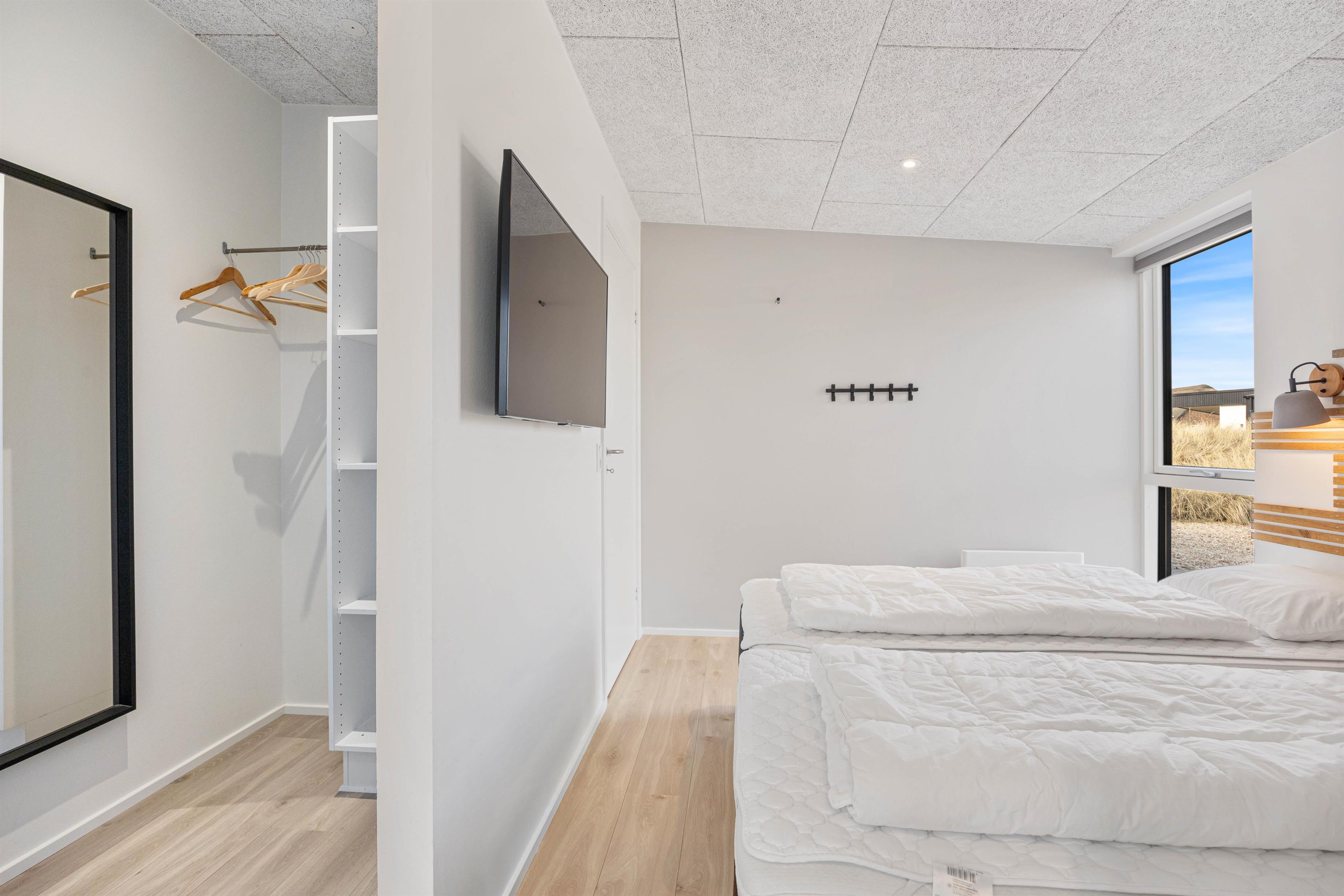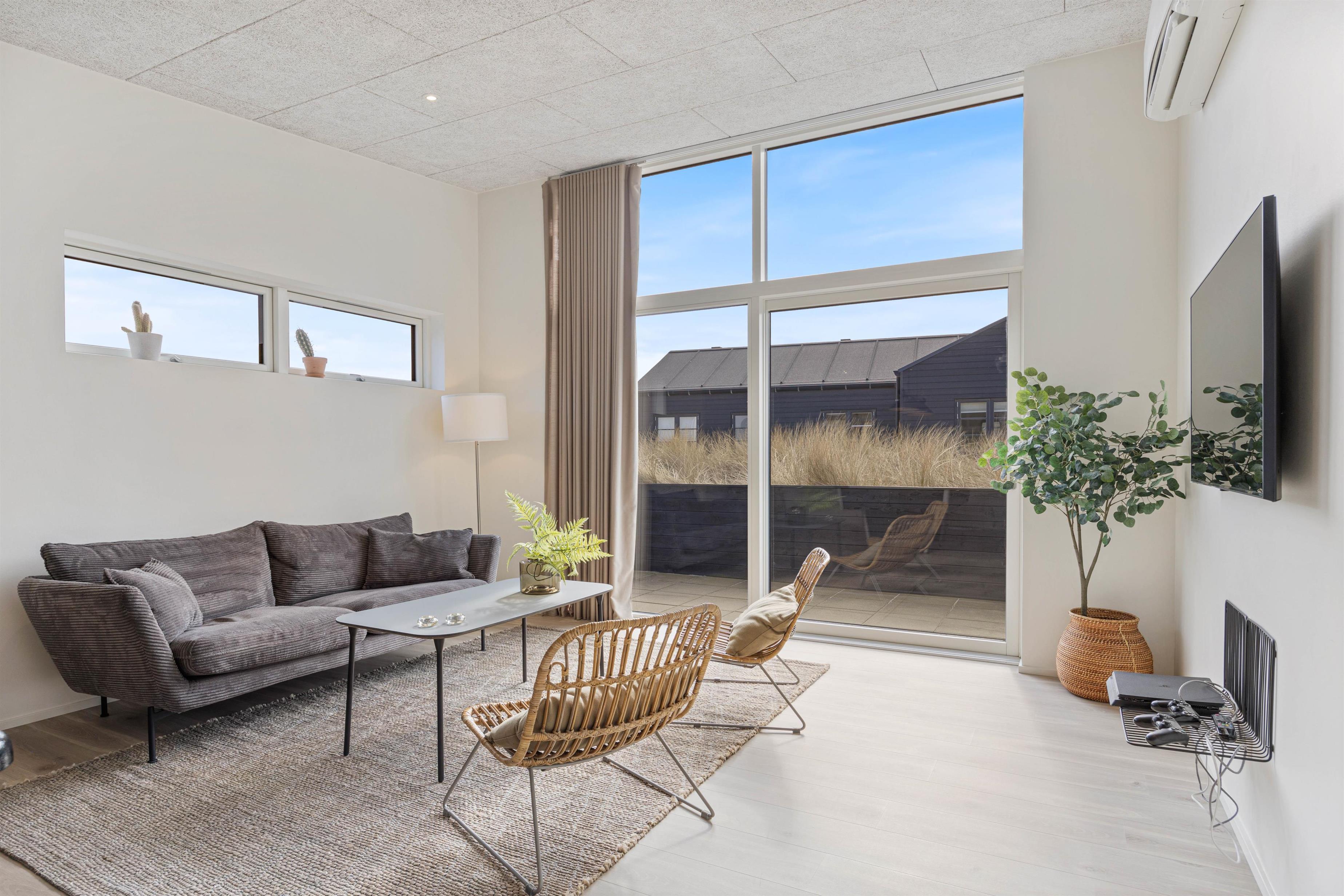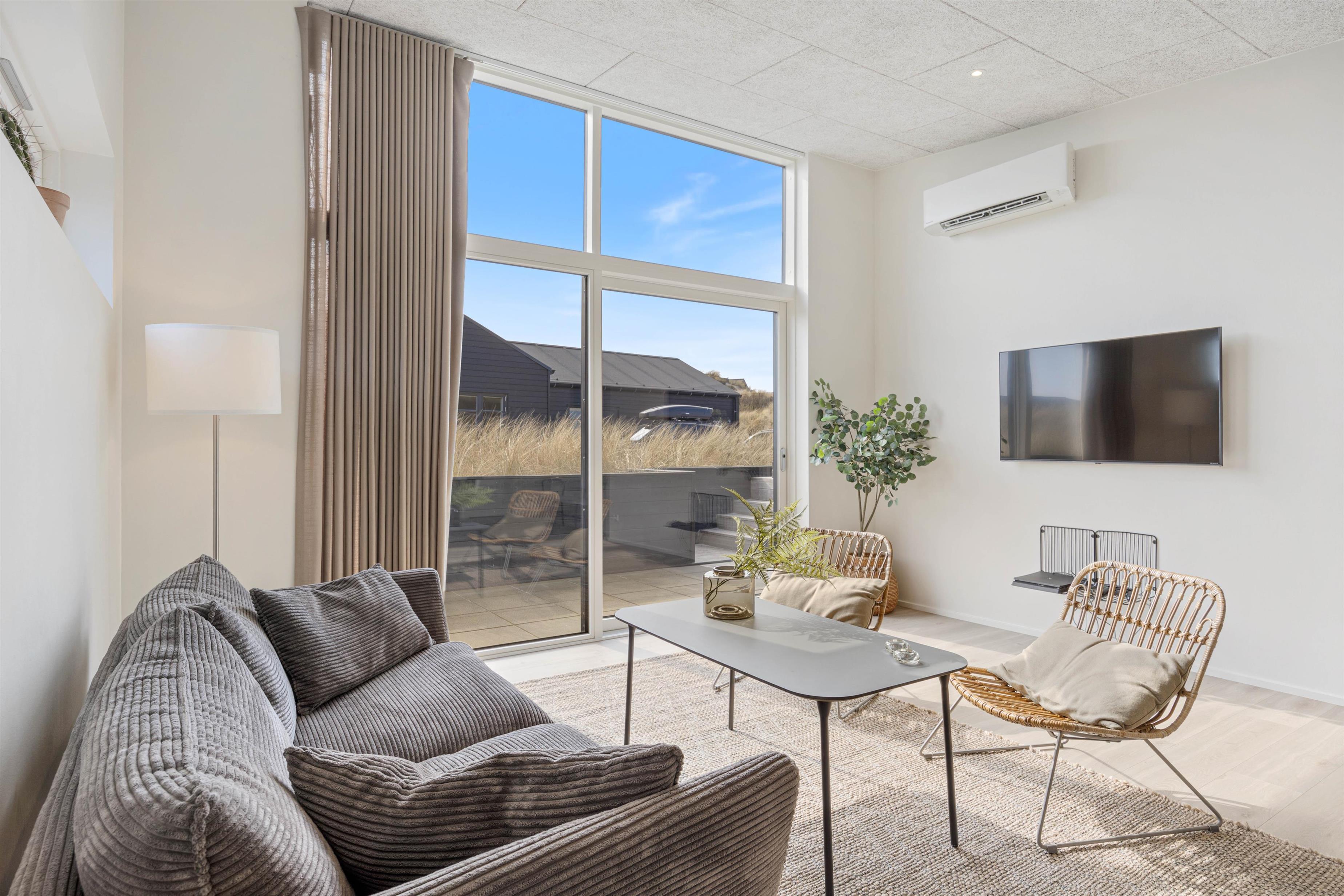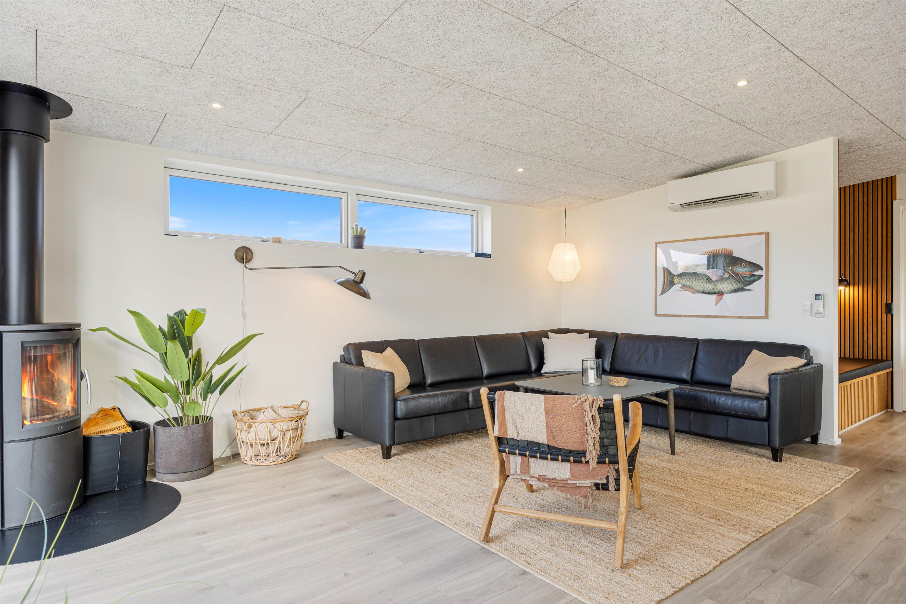 Sommerhuset er bygget i 2021 og står derfor superflot og moderne med lækre komfortable møbler. Fra det veludstyrede køkken er der adgang til det store overdækkede terrasseområde. Her kan I sidde i læ fra Vestenvinden, mens I nyder udsigten over det flotte klitlandskab i Bjerregård.
