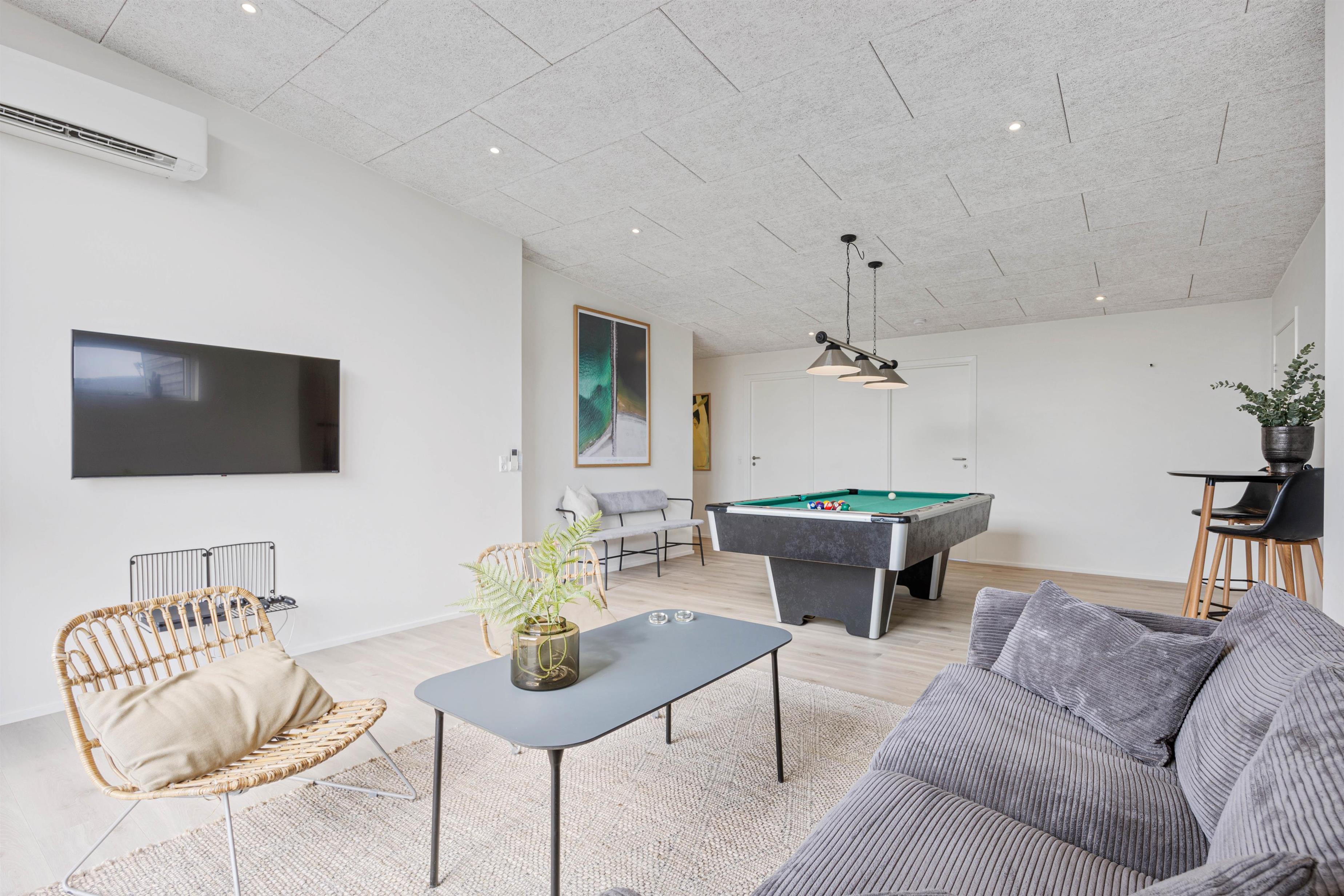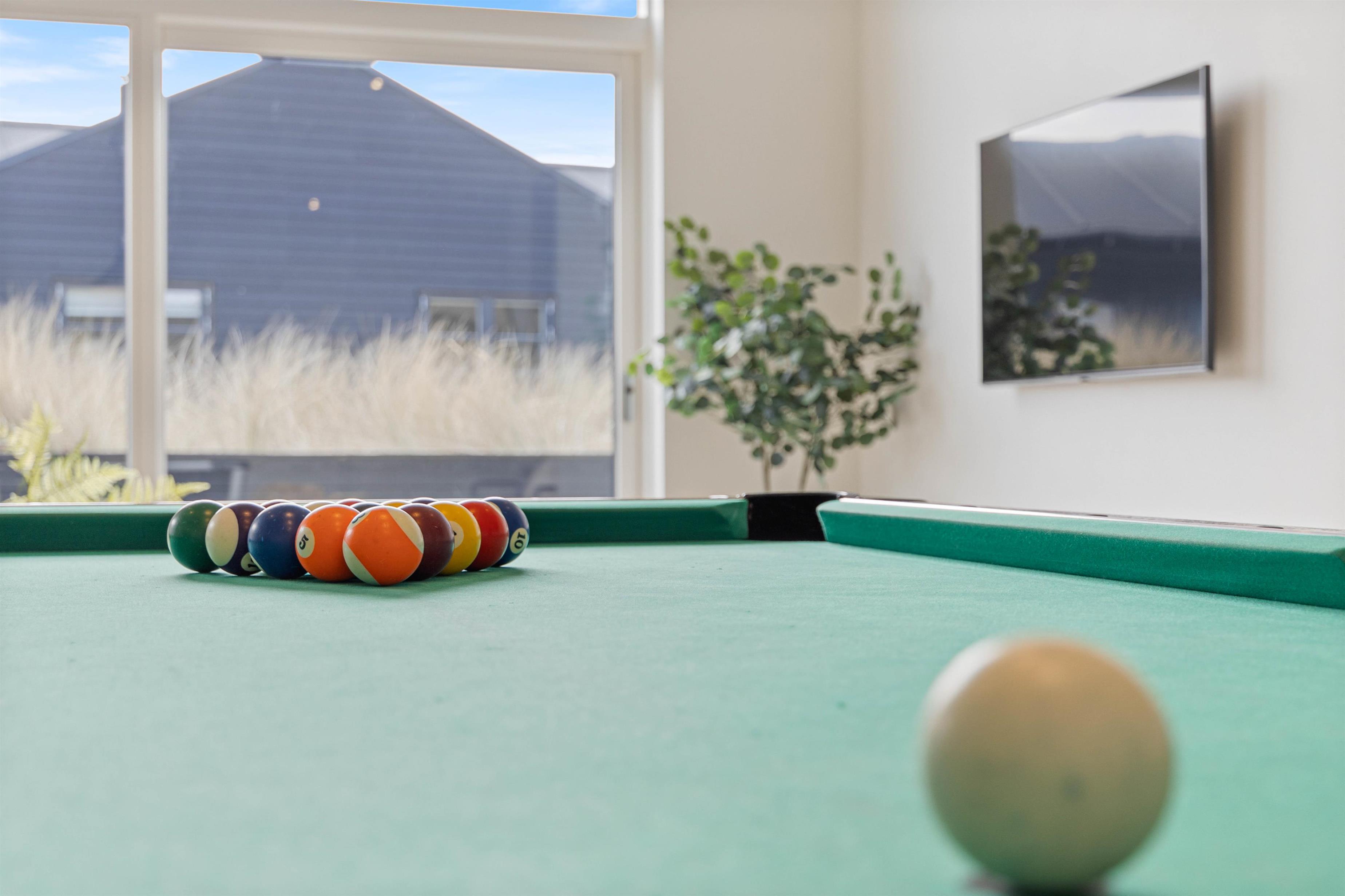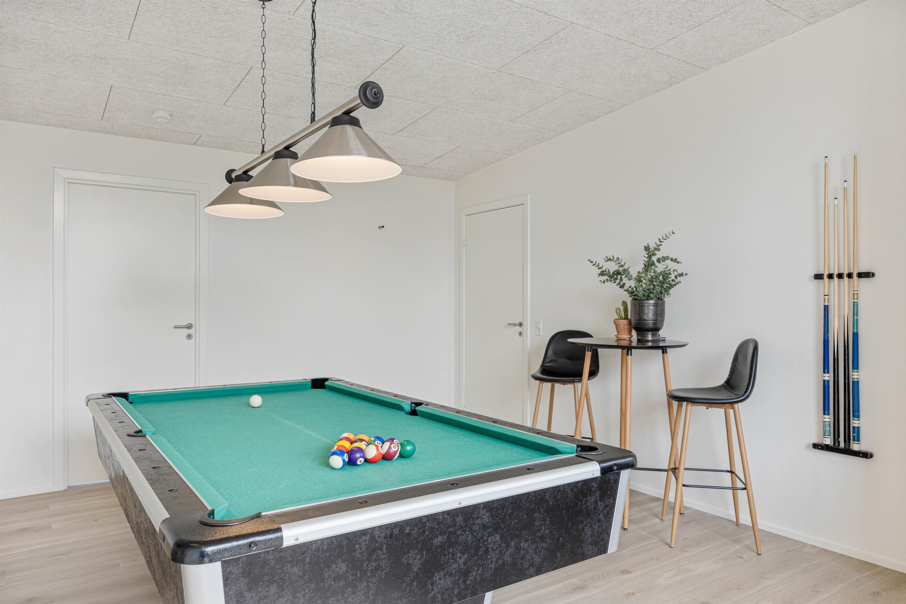 Det flotte feriehus byder på meget andet end moderne og stilfuld indretning. Hvis vejret ikke er til en tur i udespa’en eller svømmetur i havet, kan man hygge sig med venner og familie i det store aktivitetsrum med billard.