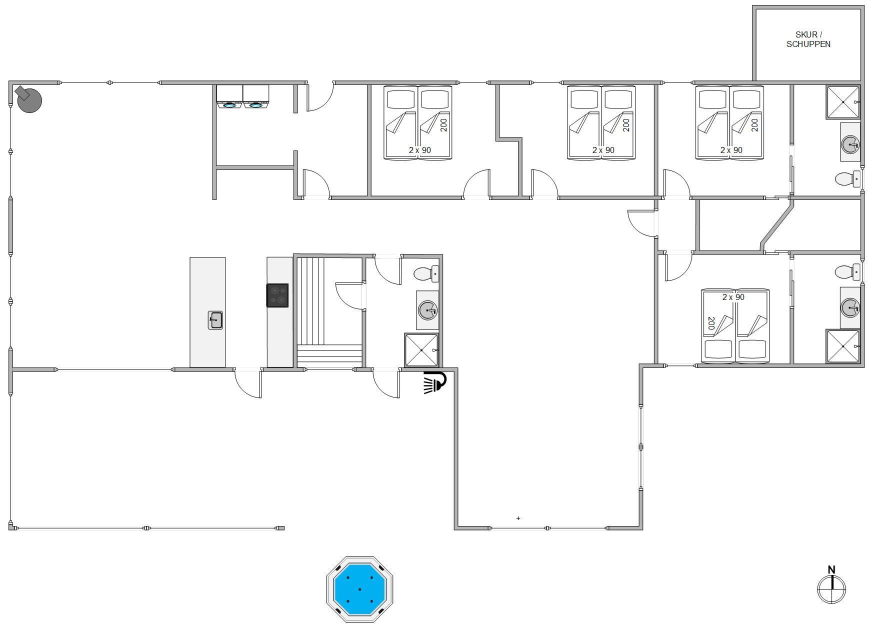 Det store 6 personers udespa står til jeres rådighed døgnet rundt. Dette giver jer mulighed for at nyde de varme bobler under en klar stjernehimmel med et glas rosé. Udebruseren, der kan benyttes fra april til november, er praktisk placeret på terrassen, hvor der er direkte indgang til det ene af sommerhusets 3 badeværelser, hvor I også finder sommerhusets sauna. Her kan I smutte ned over klitterne, hoppe i Vesterhavets grønne bølger og skynde jer tilbage til en varm sauna.