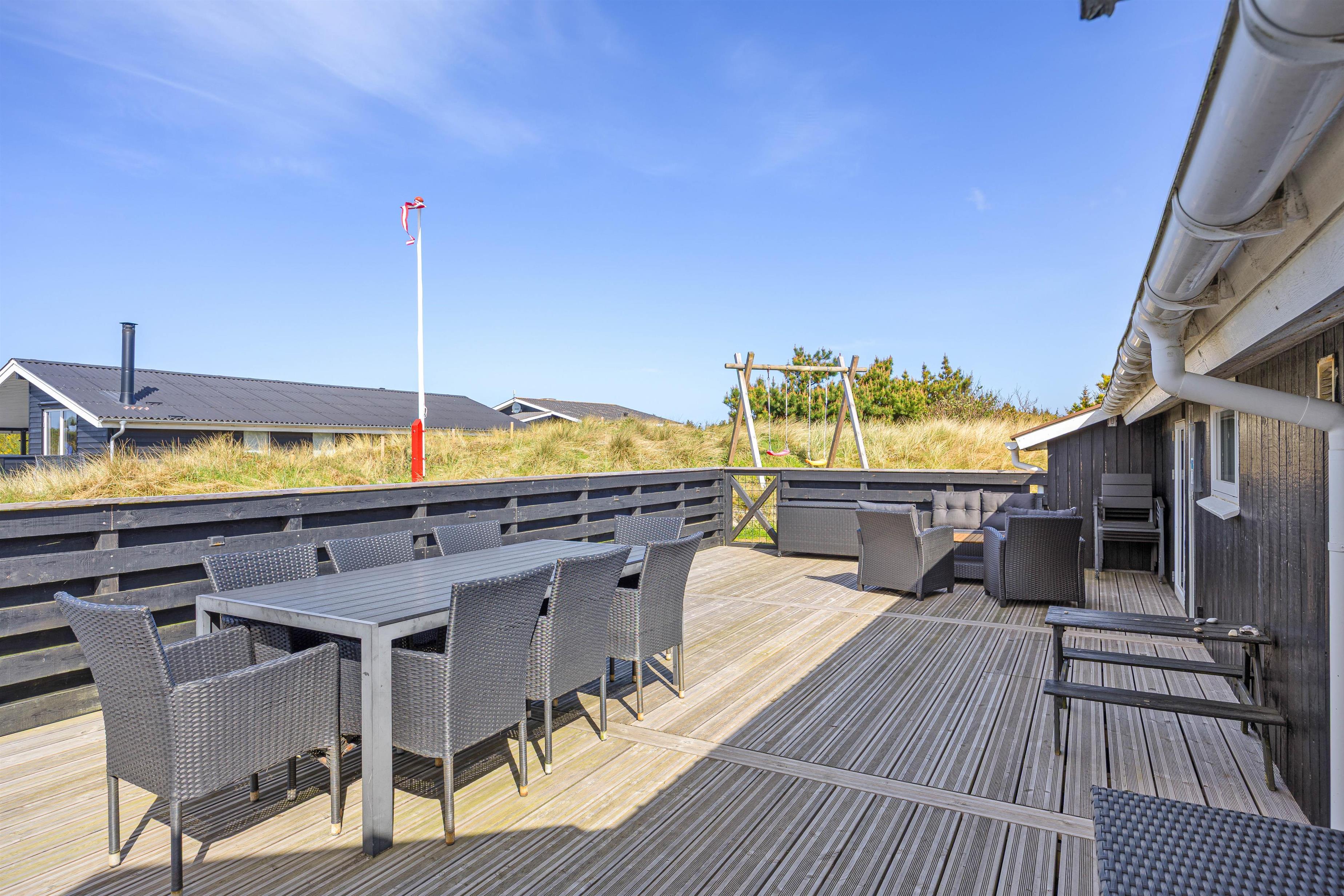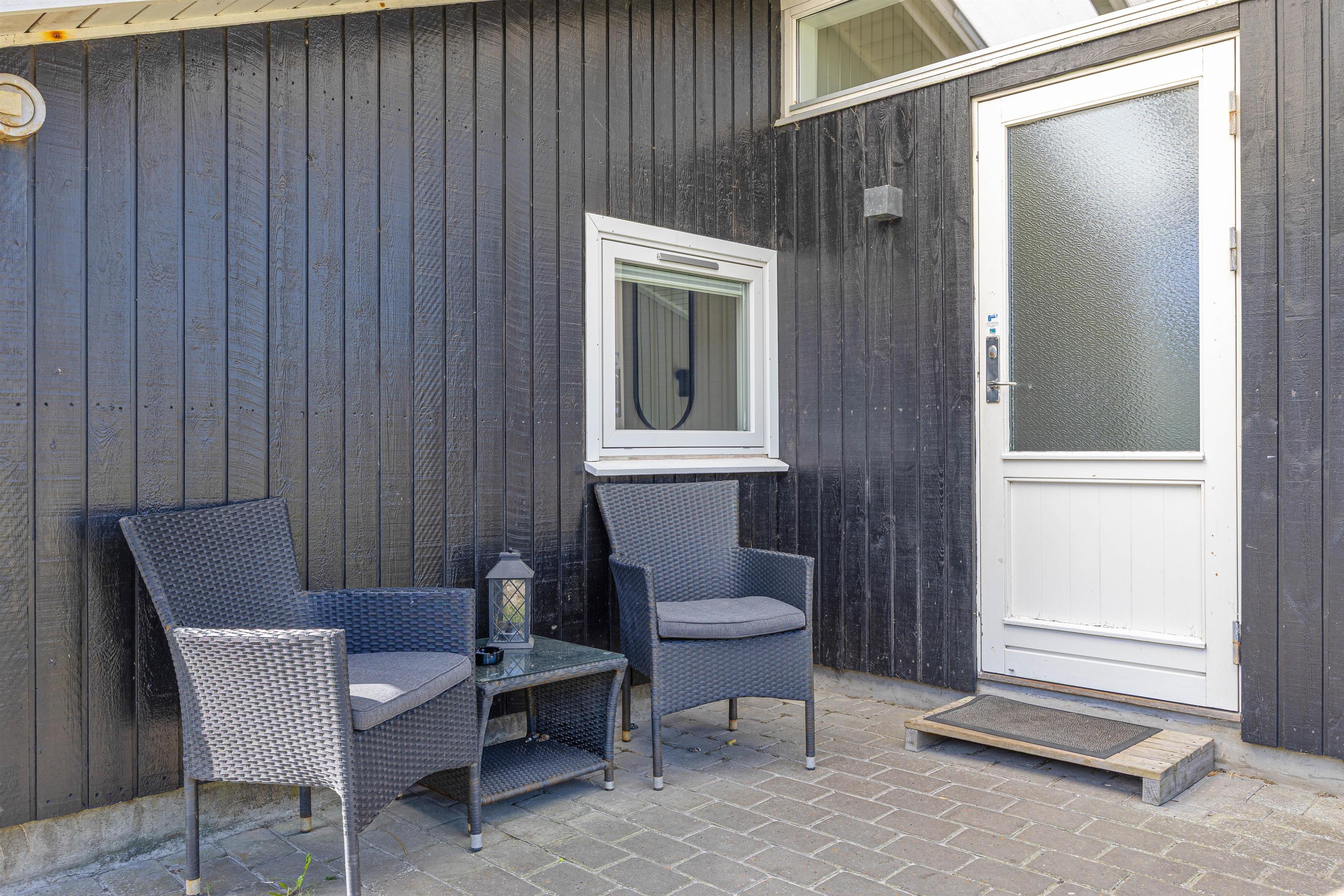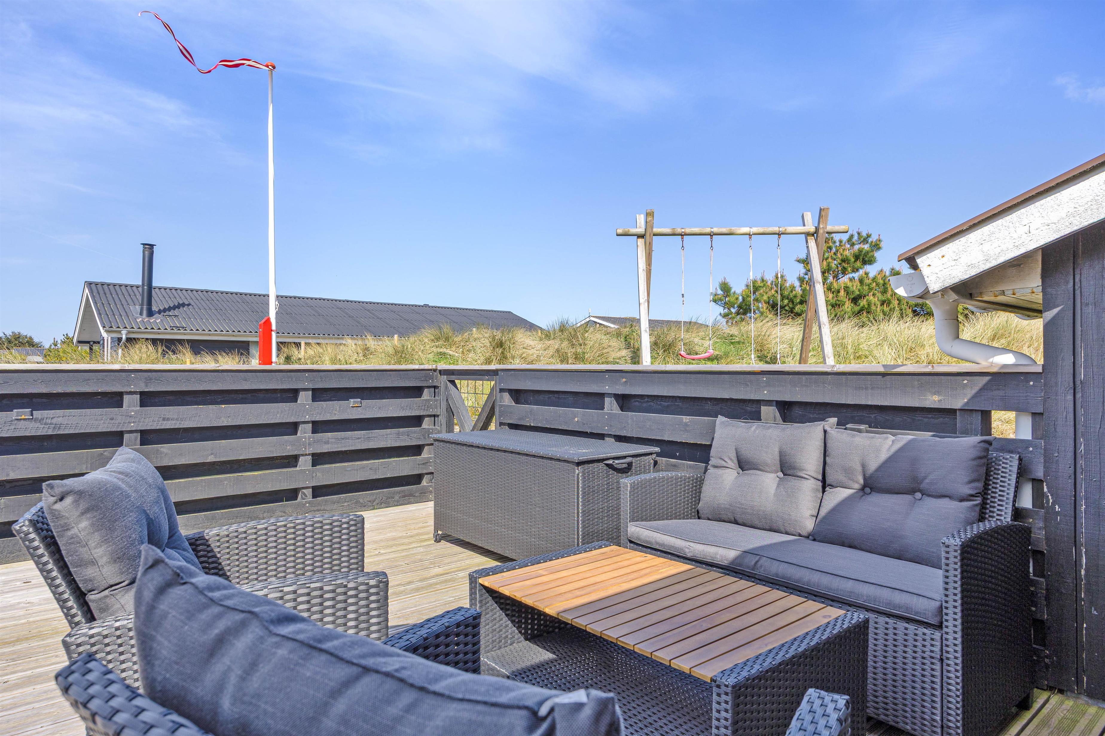 Feriehuset har også en stor lukket terrasse, samt en have dertil, som til glæde for børnene har både sandkasse og gyngestativ.