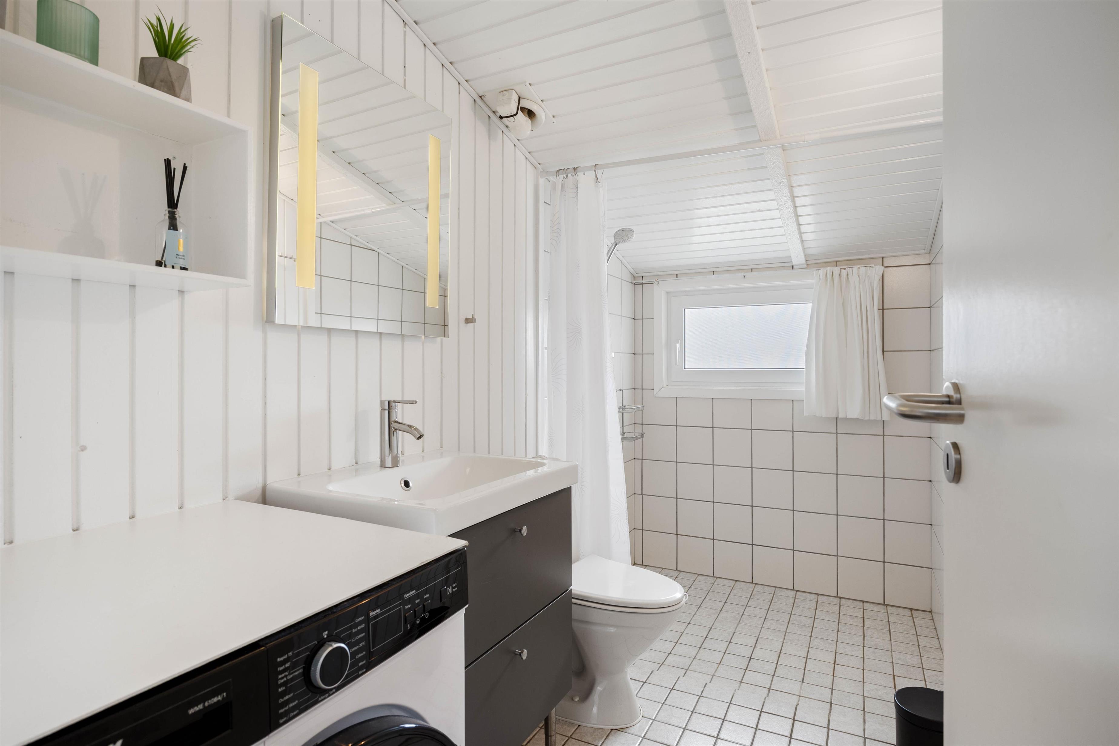 De 2 badeværelser i feriehuset har begge bruser og gulvvarme. Her er også en vaskemaskine til rådighed, så I kan friske håndklæderne op i løbet af ferien. I forbindelse med det store badeværelse kan I slappe af med en tur i saunaen eller i det varme vand i spabadet.
