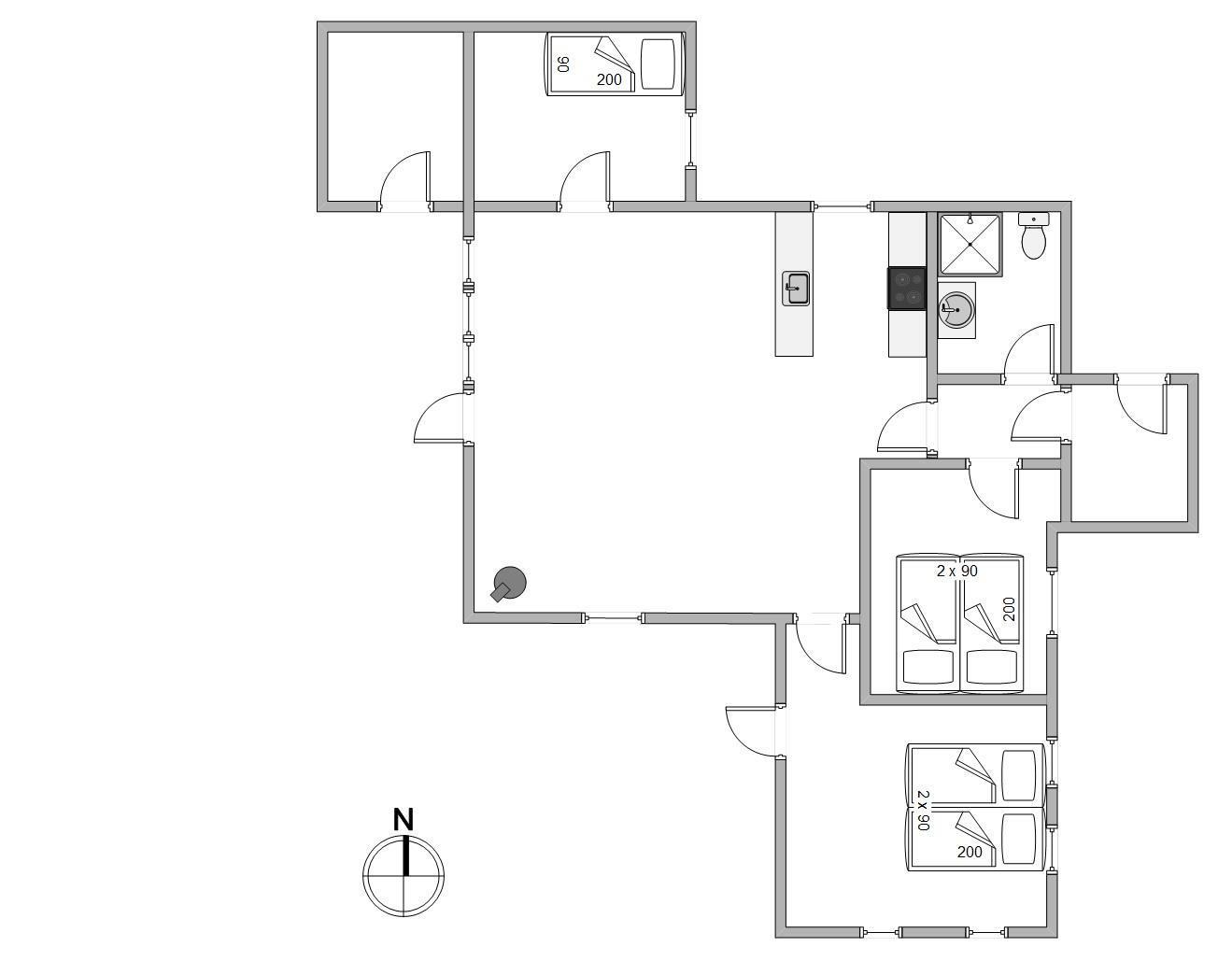 Der er 3 soveværelser i sommerhuset. I det store værelse er der rigtig god plads, også hvis man har en barneseng. I køkken og stue er der et flot, praktisk og rengøringsvenligt trælaminatgulv.