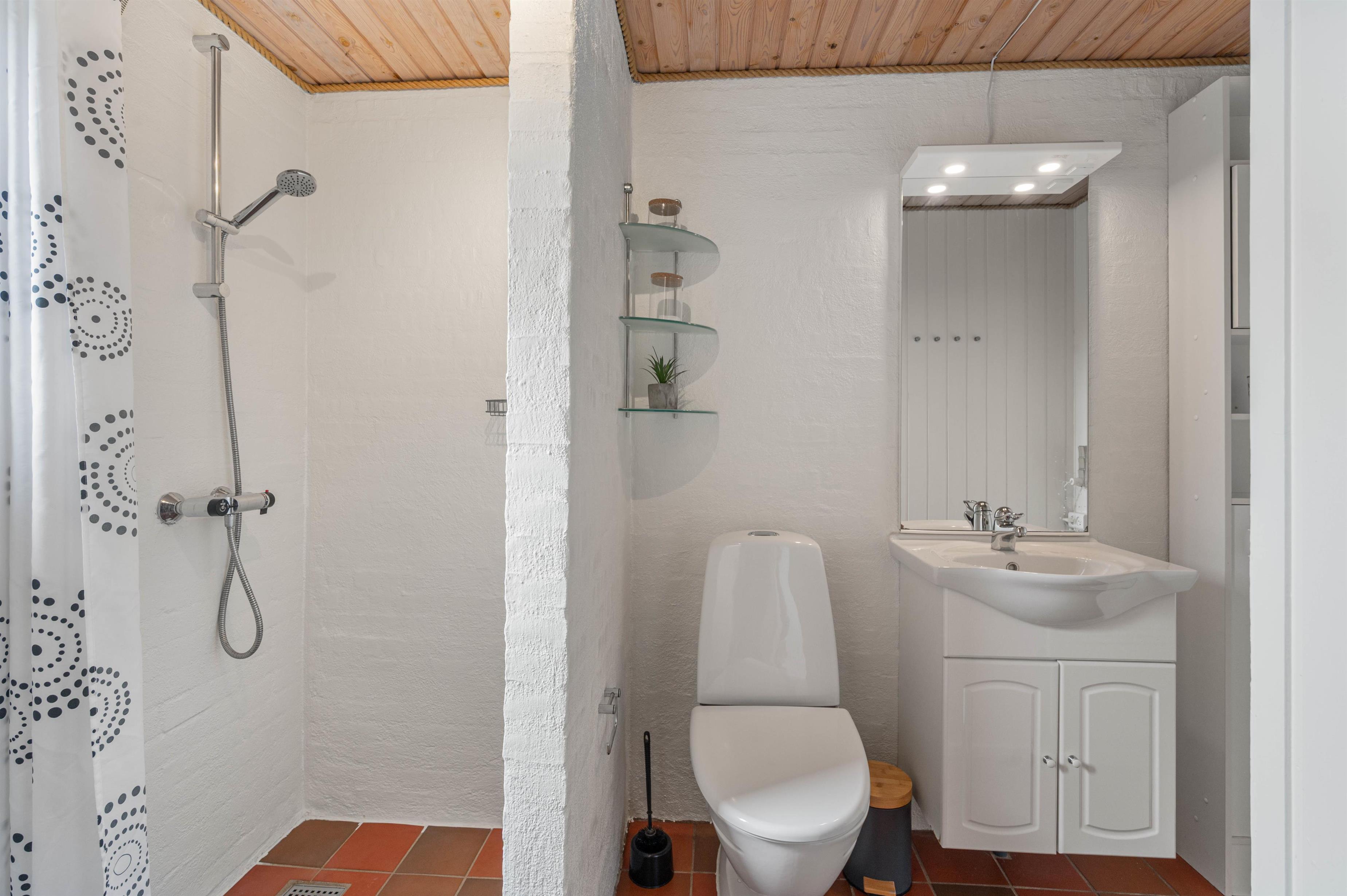 Den afskærmede terrasse gør sommerhuset praktisk for familier med små børn eller hunde. Terrassen har grill, liggestole og havemøbler, og den lille overdækkede del giver en enkel beskyttelse mod vind og vejr. Sommerhuset ligger kun 400 meter fra stranden og 950 meter fra de nærmeste indkøbsmuligheder, hvilket gør det nemt at kombinere afslapning med praktiske ærinder.