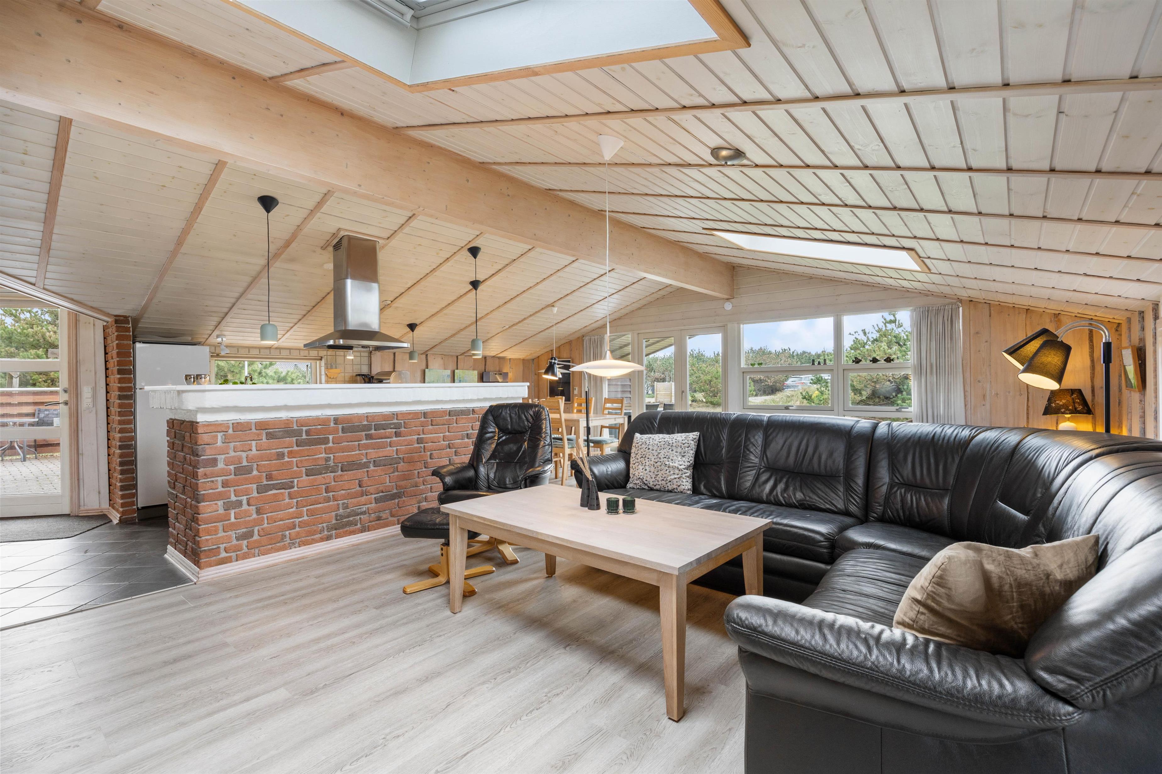 Sommerhusets hjerterum er alrummet, hvor stuen, det renoverede køkken og spiseplads ligger i åben forbindelse. Her kan I samles til hyggelige stunder med hele familien, mens brændeovnen spreder varme og feriestemning til rummet. Feriehuset har desuden en varmepumpe, som I også kan benytte jer af.