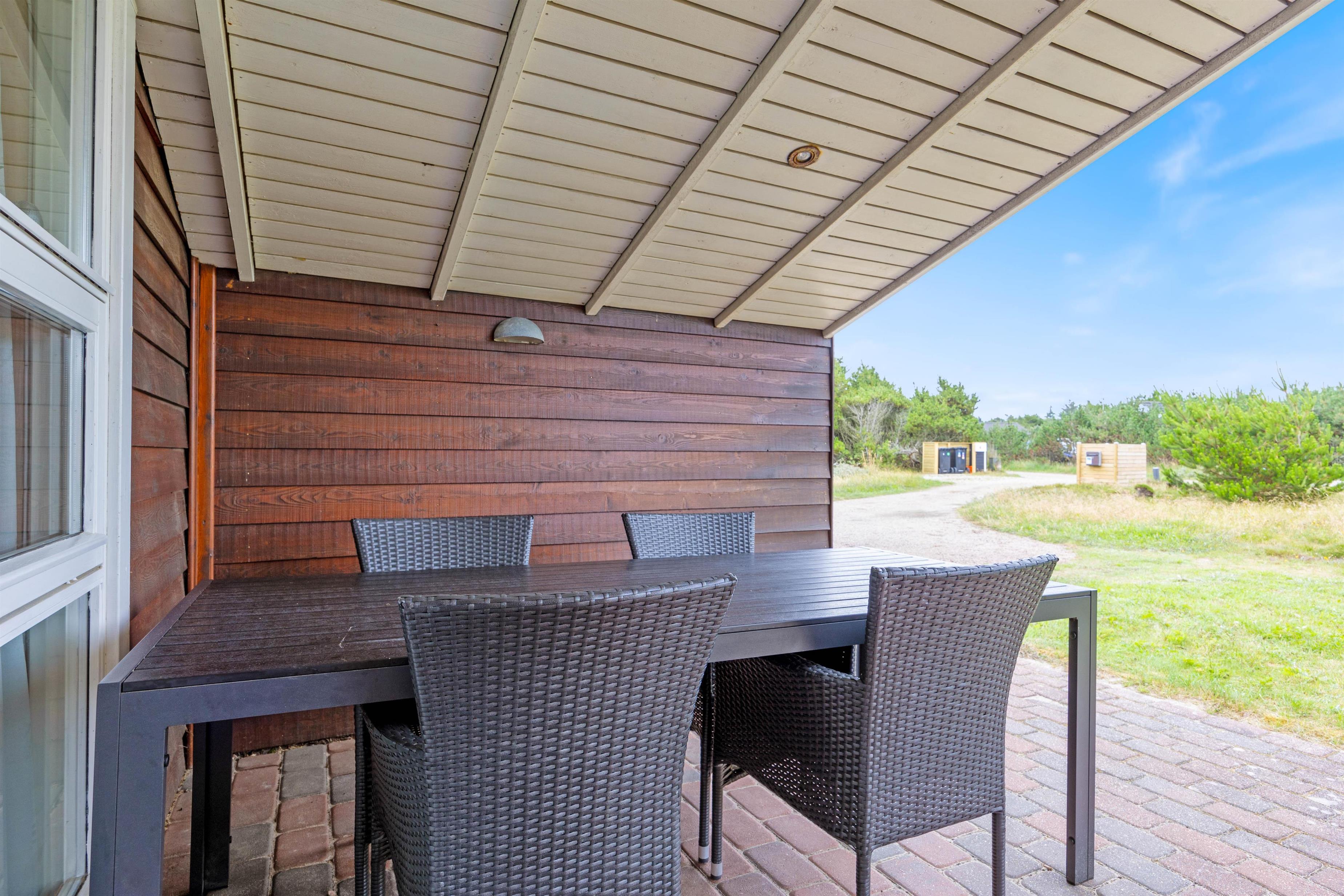 Udover sommerhusets nordvest-vendte terrasse finder I også en sydvendt terrasse, som er overdækket, samt en dejlig terrasse mod sydøst. De gode terrasser giver derfor rig mulighed for at nyde det gode vejr hele dagen, hvor I kan slutte af med et lækkert måltid, som er tilberedt på grillen. Især hundeejere kan nyde den lukkede terrasse, hvor hunden kan være ude, uden den smutter på opdagelsestur i området.