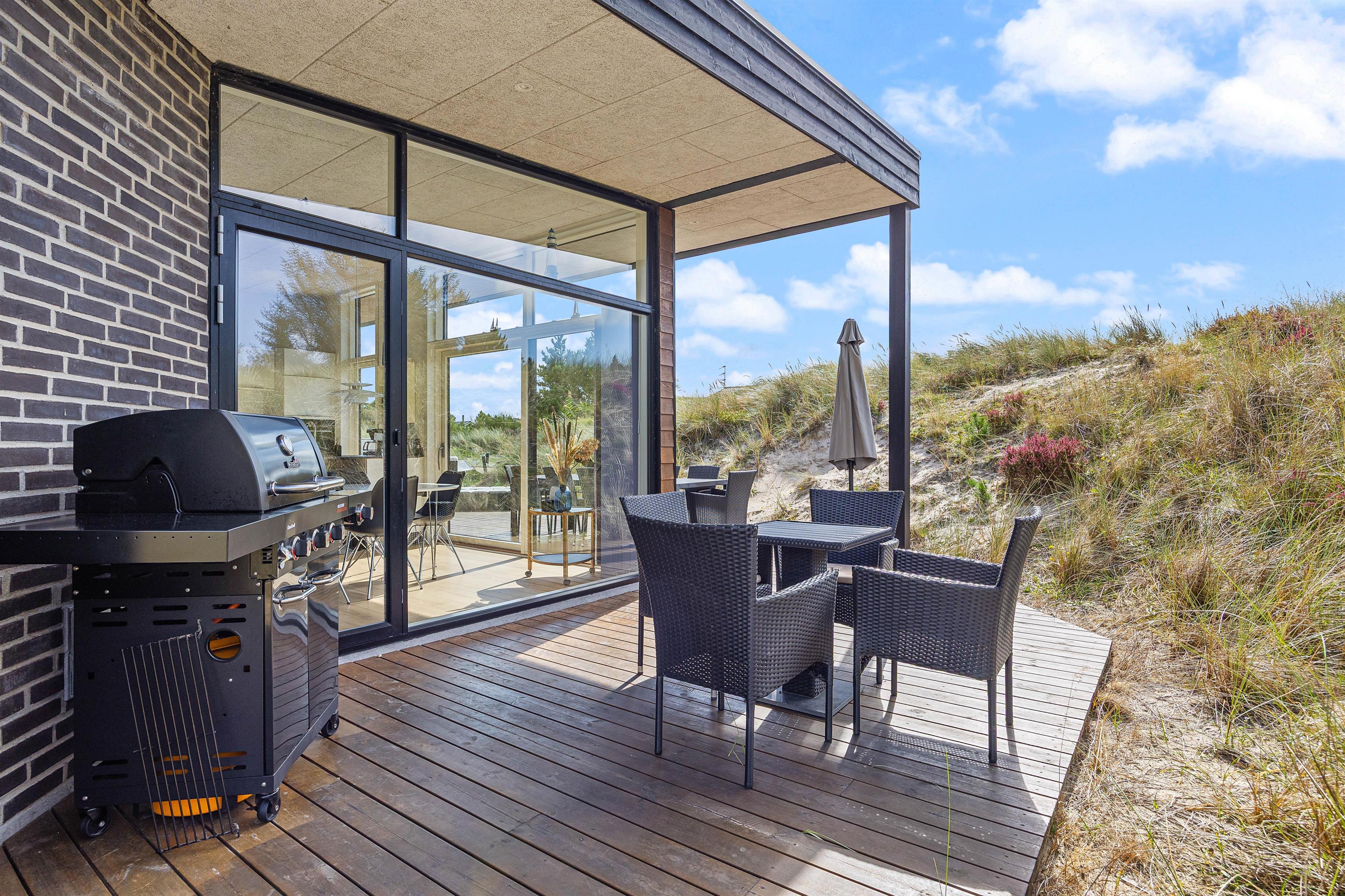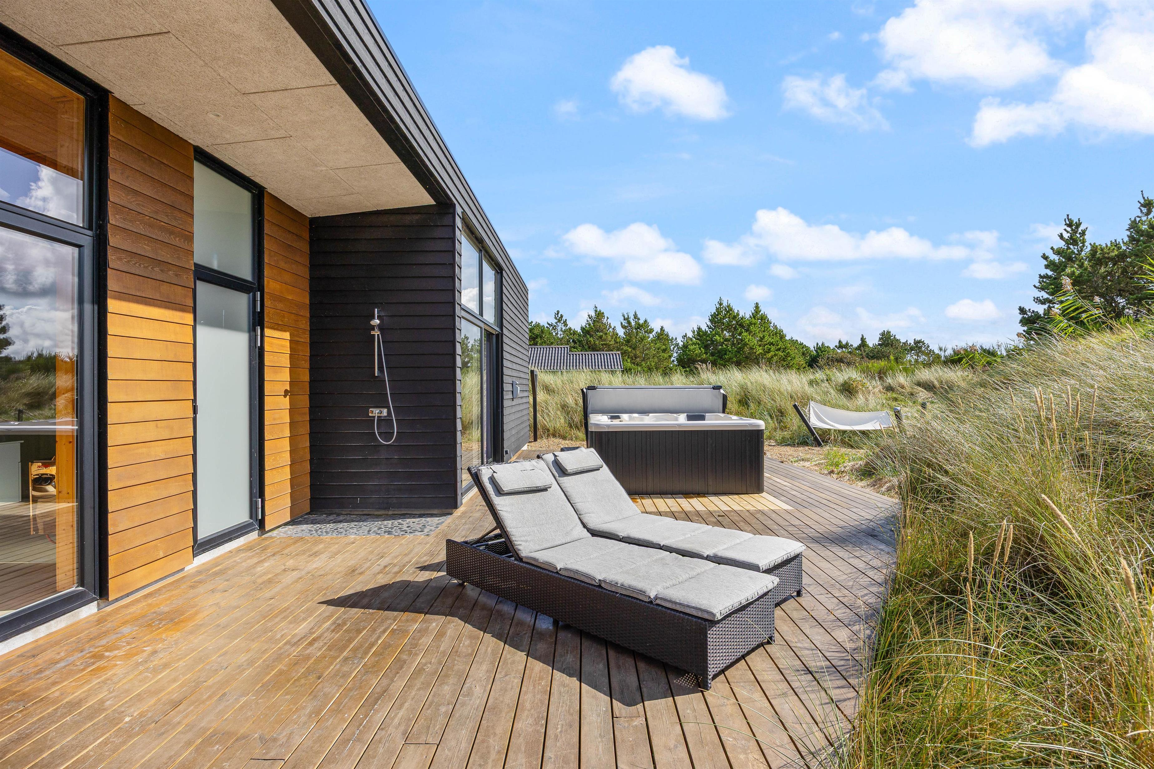 Hele vejen rundt om huset er der skønne terrasseområder, hvor I kan nyde jeres ferie i alt slags vejr. Sid på huset vestside og nyd naturen eller få fuldt udbytte af solen i liggestolene på husets solterrasse mod syd.