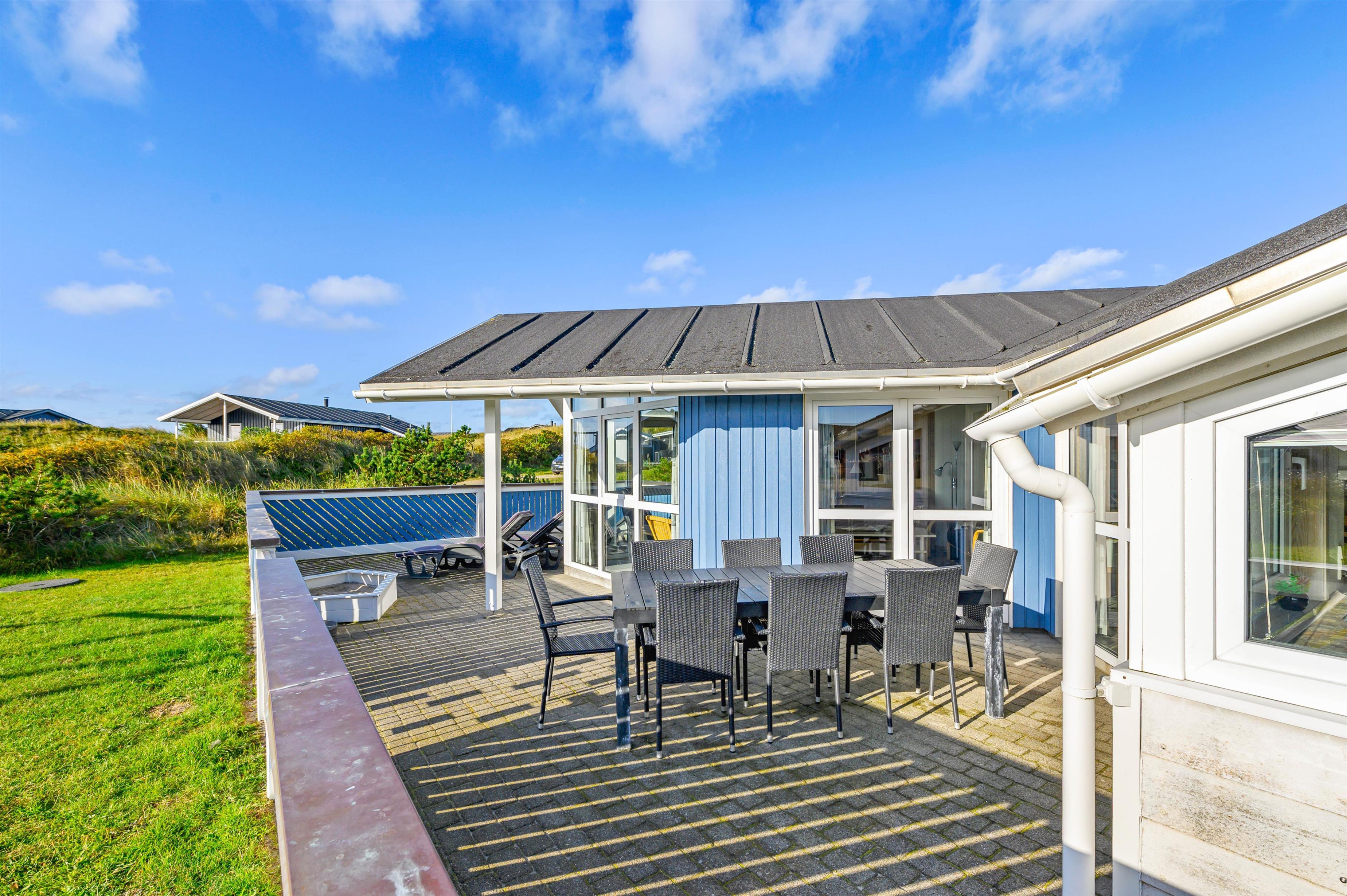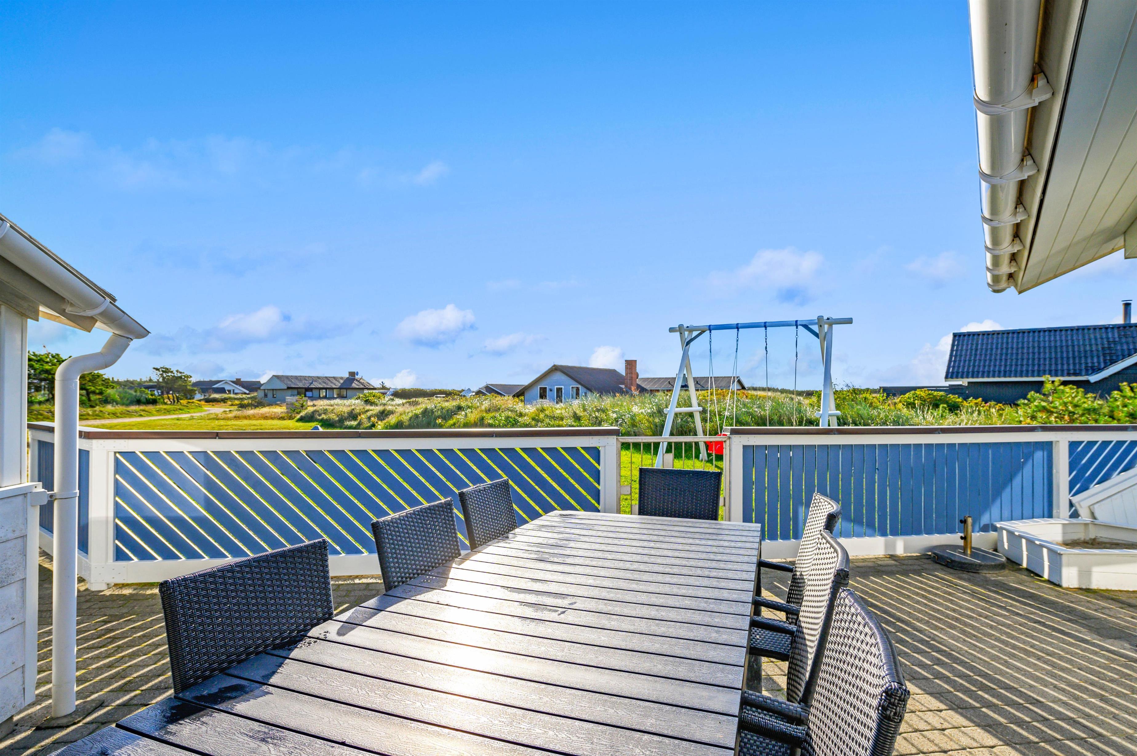 Den store velmøblerede og afskærmede terrasse indbyder til afslapning og nydelse af solen og den friske havluft inden aftenens måltid tilberedt på feriehusets grill. Terrassen er i øvrigt lukket, så hunde og børn kan gå frit rundt uden bekymringer.