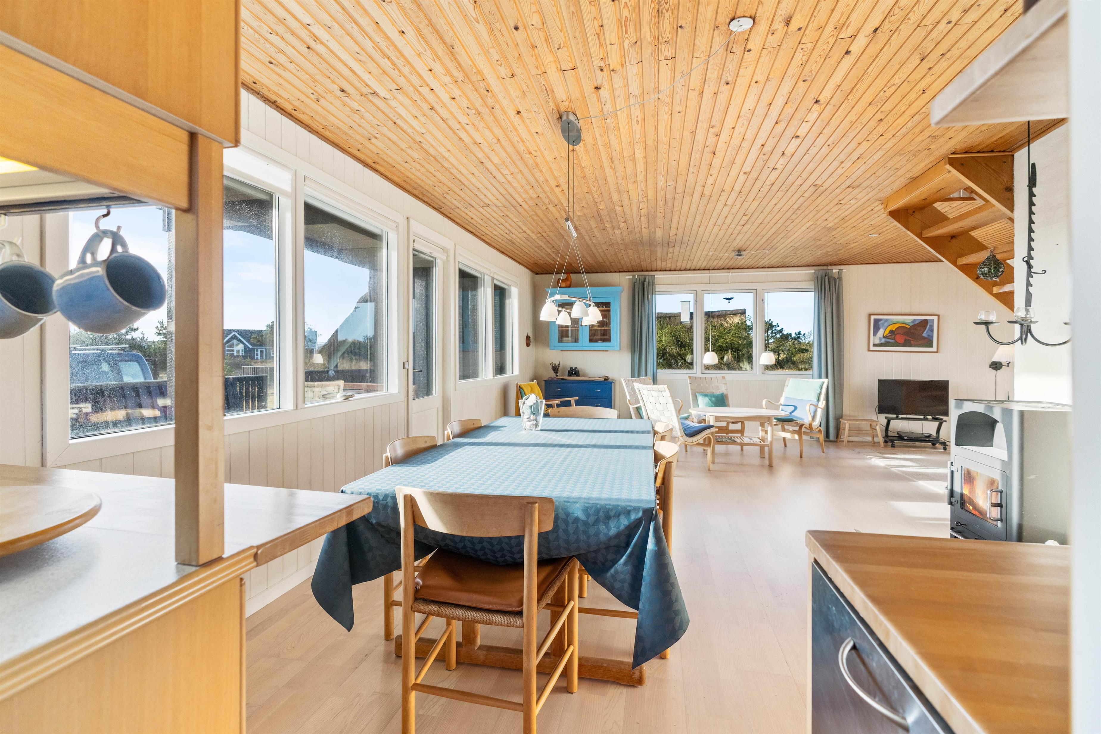 Her kan I holde ferie i et 2-stjernet sommerhus fra 1968 med skøn beliggenhed i Bjerregård tæt på Vesterhavet og direkte op til et stort fredet hedeområde. På 1. sal er der 2 store soveværelser med dobbeltsenge. Sommerhuset kan rumme 6 personer fordelt i 3 soverum, og udendørs finder I både sandkasse og gyngestativ til at underholde de små. Fra 1. sal er der udgang til en altan, hvor I kan nyde udsigten ud over den flotte naturgrund, som sommerhuset er beliggende på.