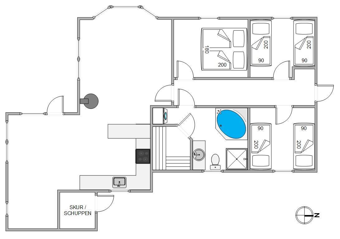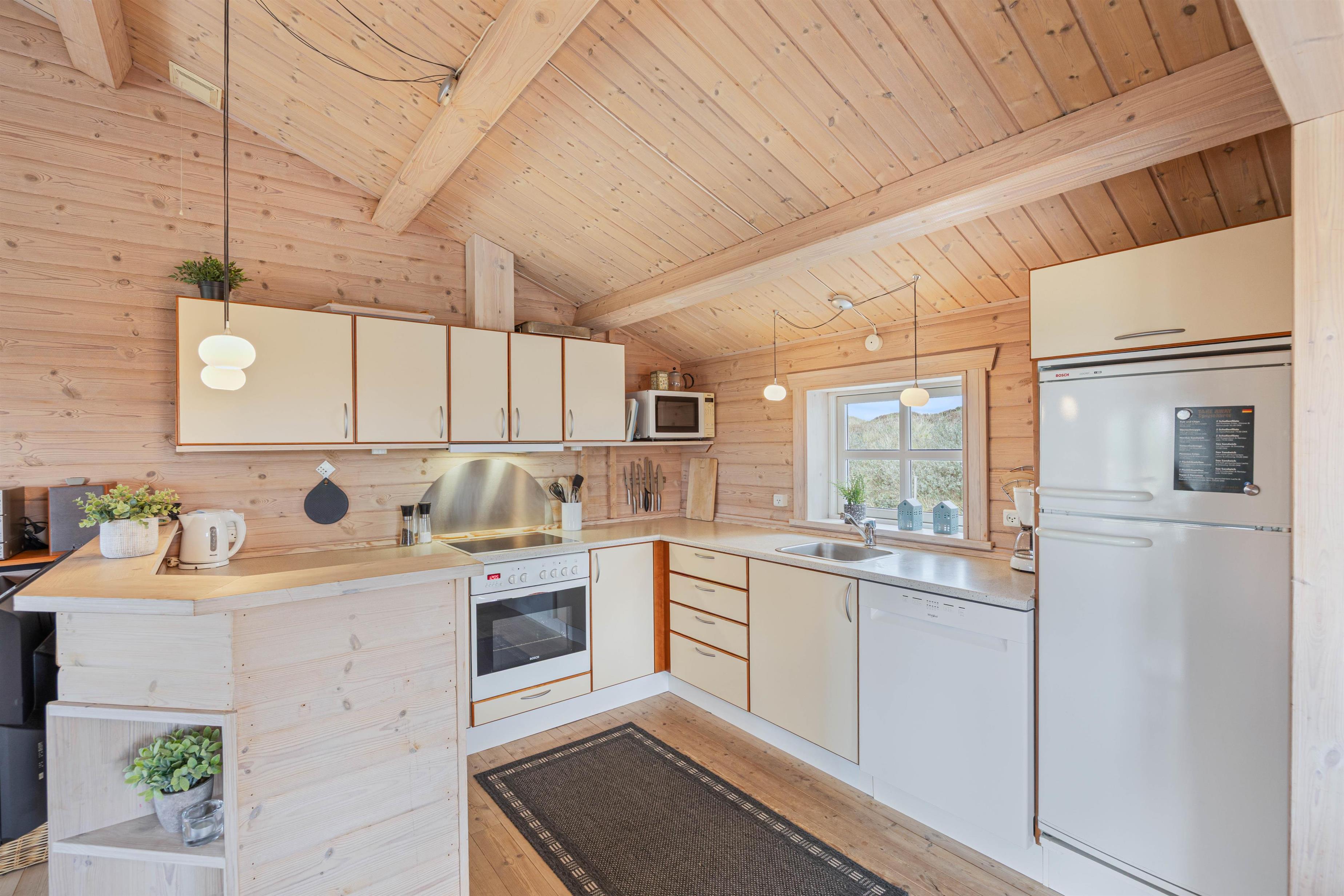 Huset rummer plads til 6 personer fordelt på 3 fine soveværelser. Feriens mødested bliver det store opholdsrum, hvor køkken og stue er slået sammen. Her kan I samle hele familien til madlavning, kortspil og filmhygge, mens brændeovnens flammer knitrer og fylder rummet med varme og god feriestemning.