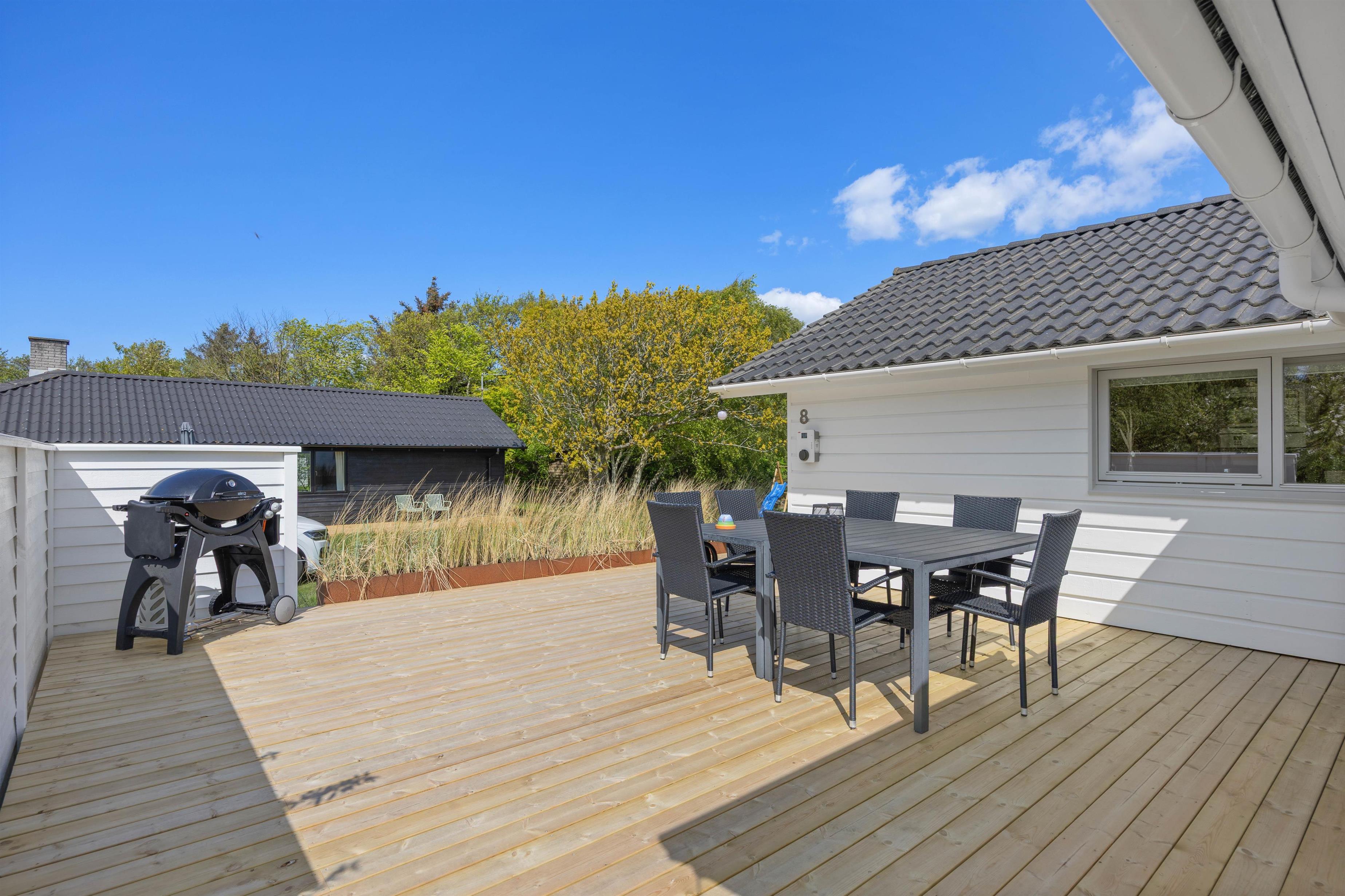 Velkommen til sommerhuset på Bjerregårdsvej 8. Et lyst og rummeligt sommerhus til 8 gæster og 1 hund. Indenfor er et skønt opholdsrum med brændeovn. Her er spabad samt sauna og udenfor vildmarksbad på den store terrasse. Både Vesterhavet, den lokale købmand og en fin legeplads ligger i gåafstand herfra.