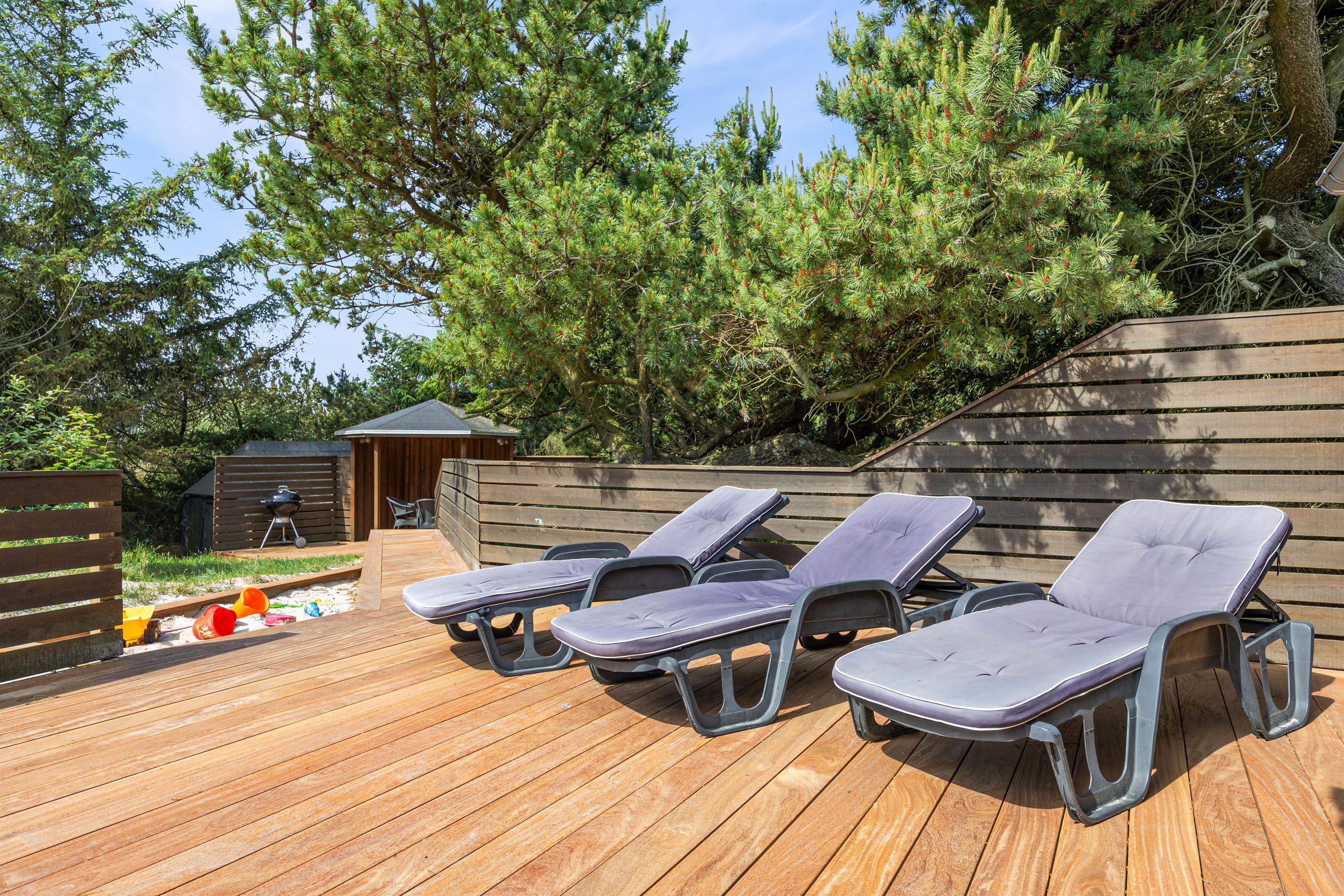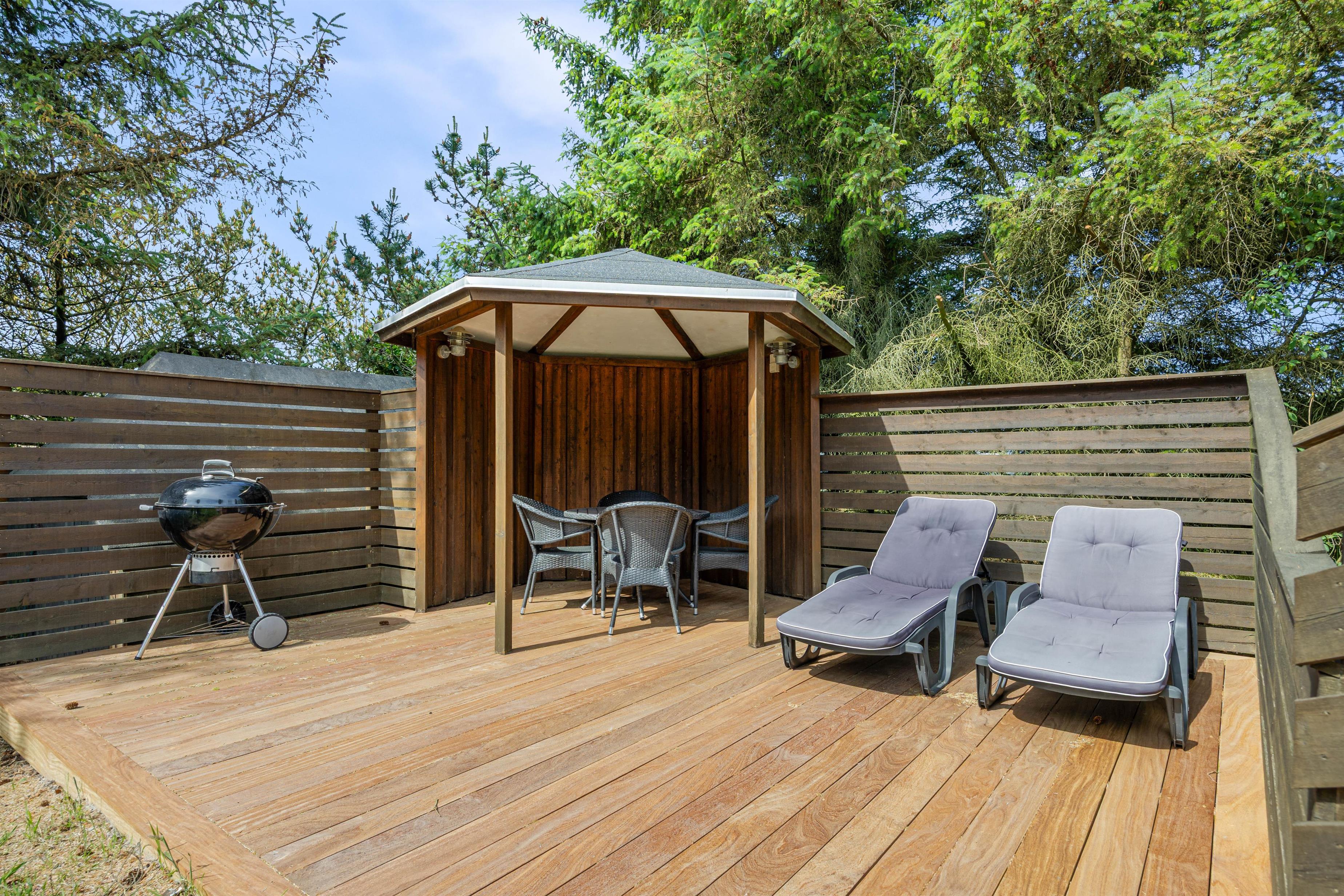 Der er flere terrasser. Den lukkede terrasse giver sammen med de nærtliggende træer både privatliv og læ for vinden og er samtidig ideel, hvis der er småbørn eller hund i familien. I det sydvestlige hjørne af grunden er der en lavere beliggende terrasse, som udover at være endnu mere læfyldt, også giver masser af muligheder for sol og afslapning.
