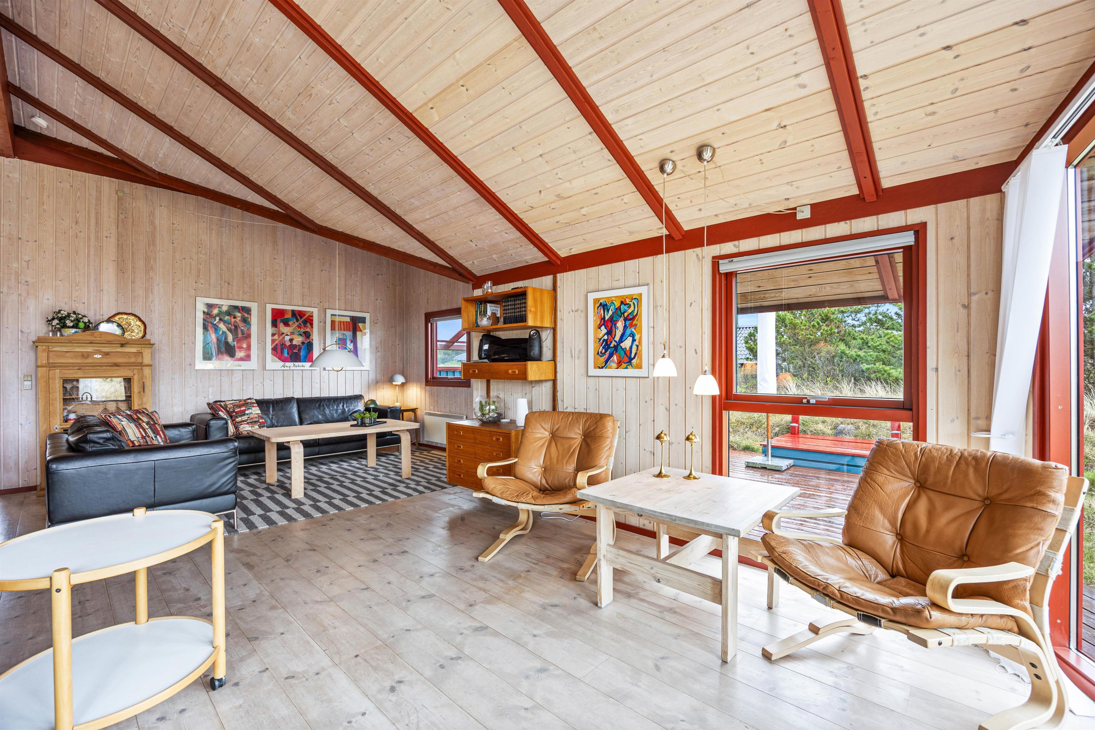 På Bjerregårdsvej 75 føler man sig straks velkommen. Den rummelige stue har et stort vinduesparti i gavlen, som giver et dejligt lysindfald. Her kan I slappe af i sofaen og nyde udsigten til naturen. Om aftenen kan I se tv sammen eller arrangere en spilleaften ved spisebordet. Tænd op i brændeovnen og nyd den hyggelige feriestemning, der straks skabes.