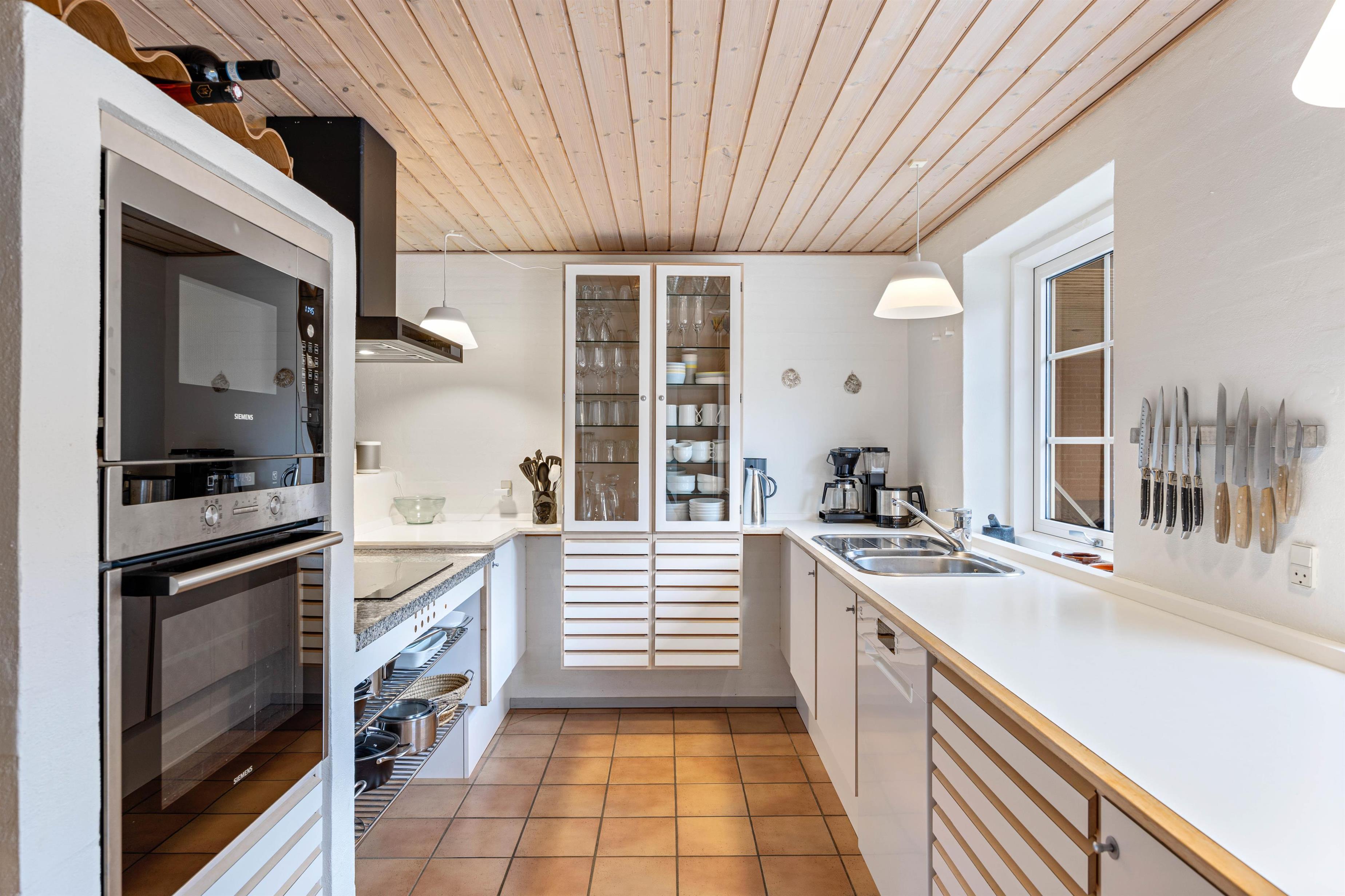 Feriehuset har et dejligt køkken/alrum med klinkegulve med gulvvarme, hvor familien kan samles til et godt måltid mad efterfulgt af hyggelige stunder foran brændeovnen. Mens brændeovnen knitrer i baggrunden, kan I streame jeres yndlingsfilm til fjernsynet via. feriehusets Chromecast eller Apple-tv.