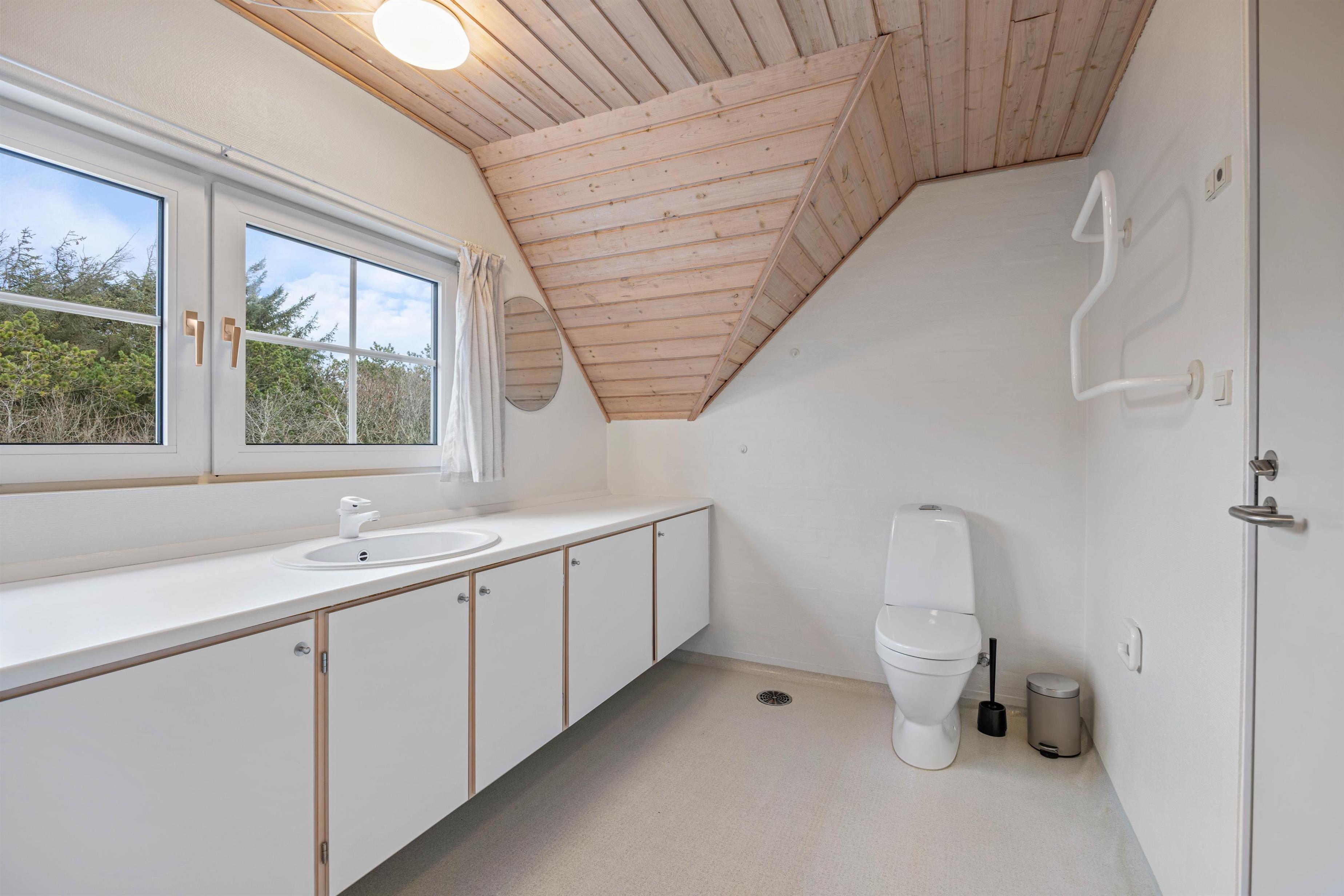 Sommerhuset har 2 badeværelser, hvoraf det ene ligger i feriehusets stueplan. Her finder I desuden feriehusets sauna, som er dejlig afslappende efter en oplevelsesrig feriedag i naturen. Der er gulvvarme på badeværelserne, og sommerhuset har desuden både vaskemaskine og tørretumbler.