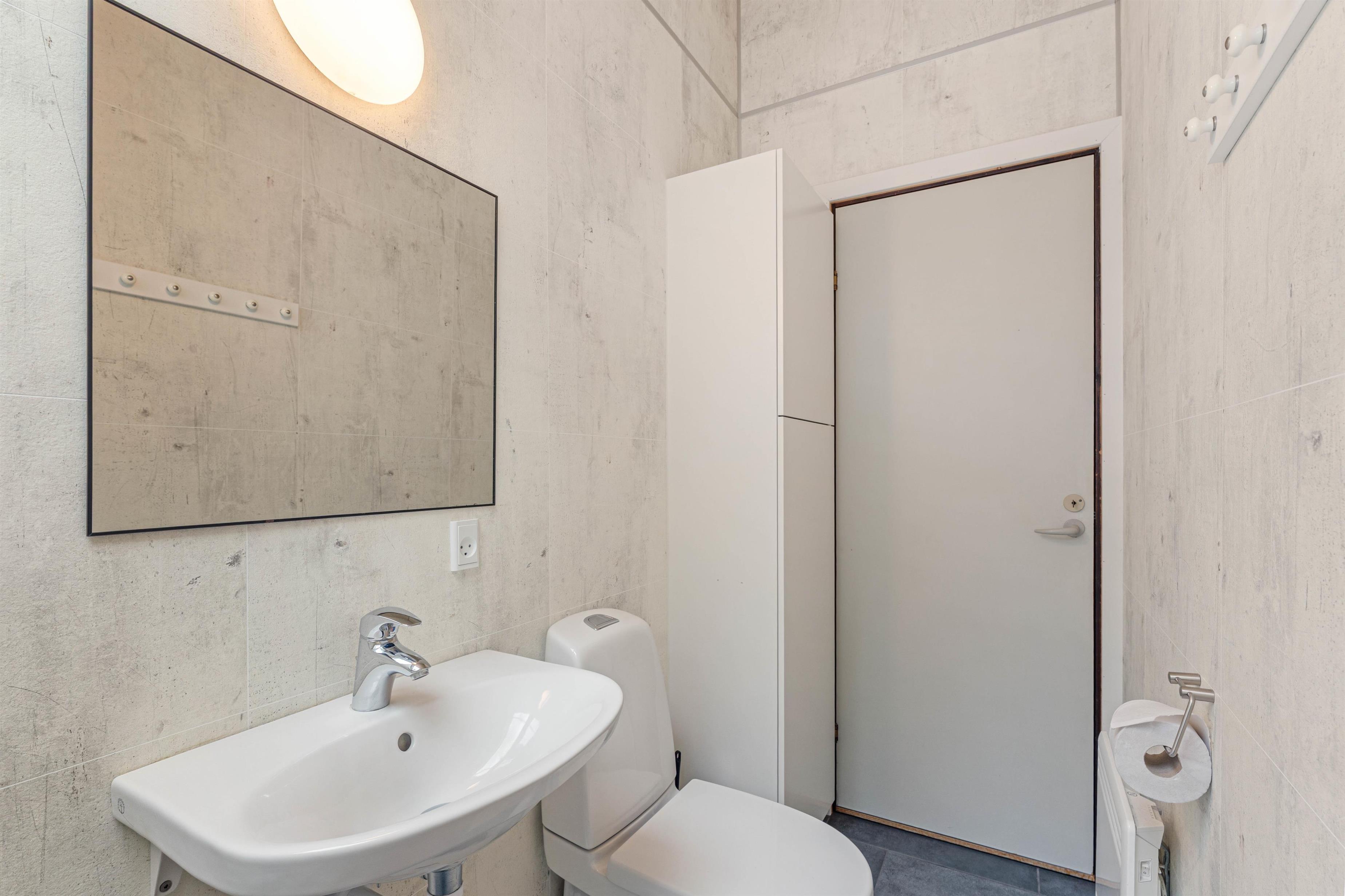 Køkkenalrum og stue er lagt sammen til ét stort rum, hvor samværet kan komme i centrum. Her står brændeovnen, som sørger for god varme året rundt, mens store vinduespartier og ovenlysvinduer giver et herligt lysindfald og udsigt til de naturskønne omgivelser.