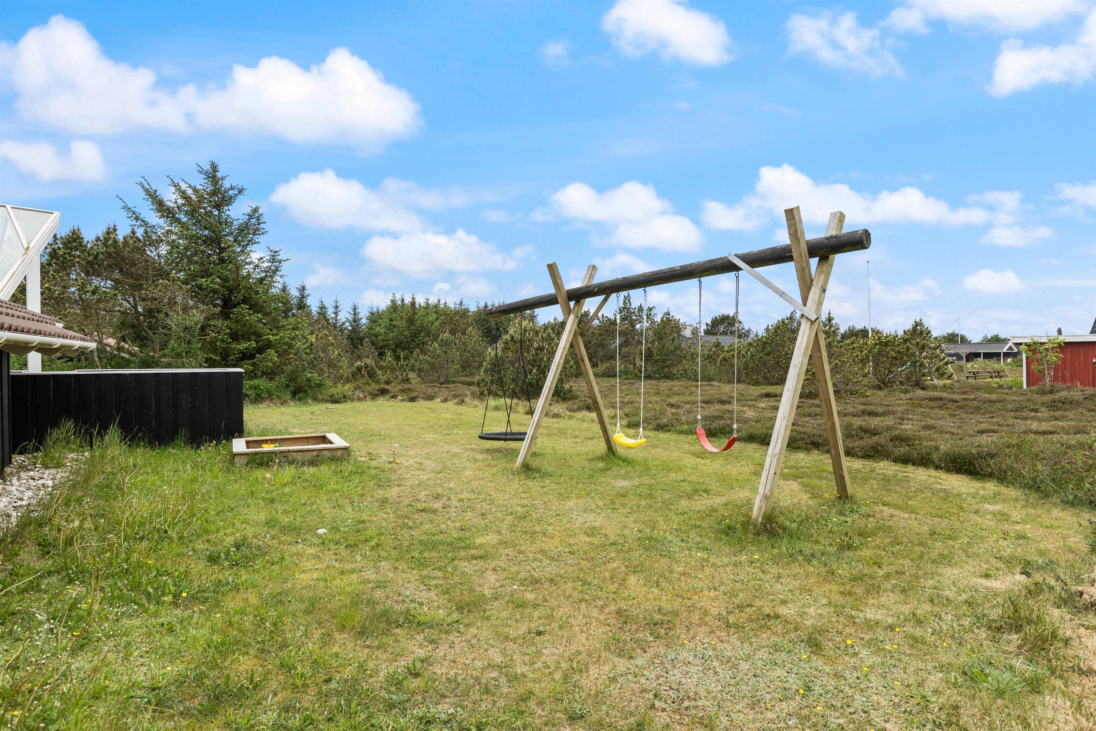 Sommerhuset ligger på en skøn naturgrund med gynge og sandkasse. Dagen kan I nyde på den lukkede og delvist overdækkede terrasse, hvor I kan afslutte med et lækkert grillmåltid. Terrassen er delvist overdækket, så I kan nyde aftenen fuldt ud - også i lidt regn. Her er desuden en lille og hyggelig vestvendt terrasse ved indgangspartiet.