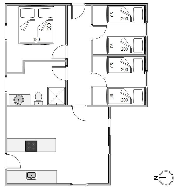 Udover opholdsrummet, består sommerhuset af 1 badeværelse samt 3 soveværelser. Ét af soveværelserne er indrettet med dobbeltseng, mens de andre værelser begge er indrettet med 2 enkeltsenge – ideelt til familien eller vennerne, der ønsker at holde ferie sammen. På badeværelset er der desuden gulvvarme.