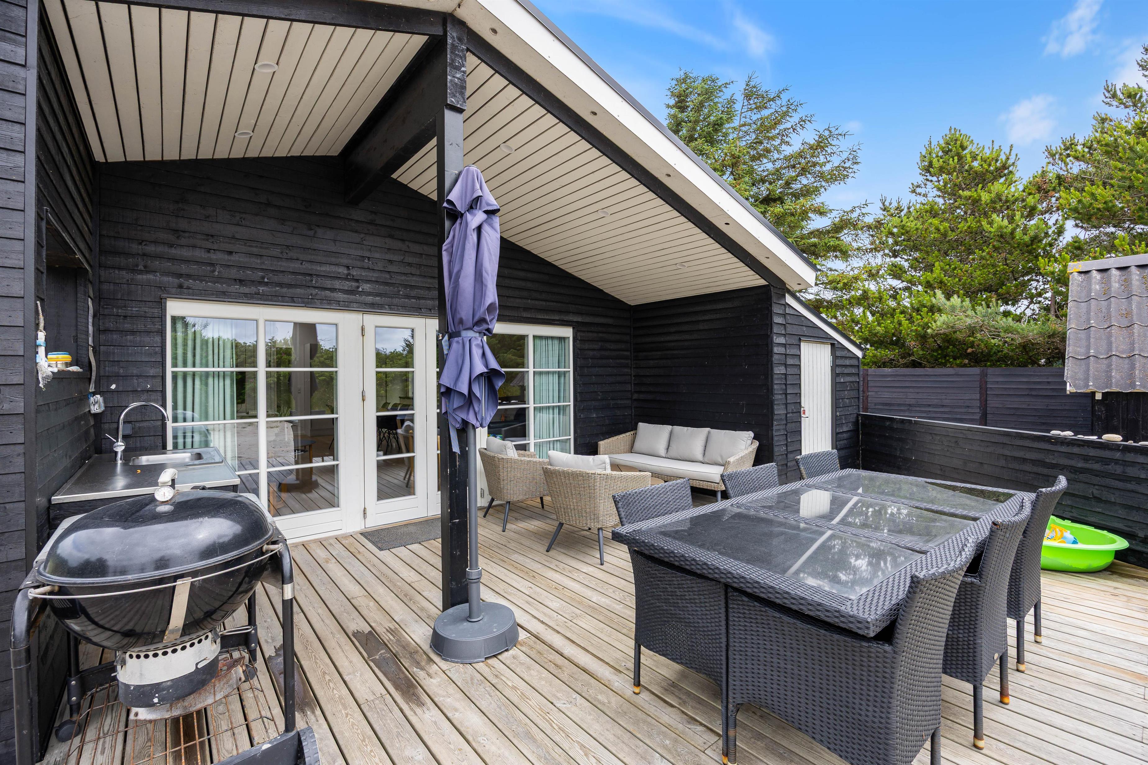 Sommerhusets udendørsområde strækker sig over 1200 kvadratmeter græsplæne. Et legetårn, en shelter, mål og en beachvolleybane giver masser af udendørs underholdning og mulighed for sjove aktiviteter. Slap af på den delvist overdækkede terrasse med komfortable havemøbler samt liggestole og lav lækre grillmåltider på gasgrillen, imens skyggerne bliver lange.